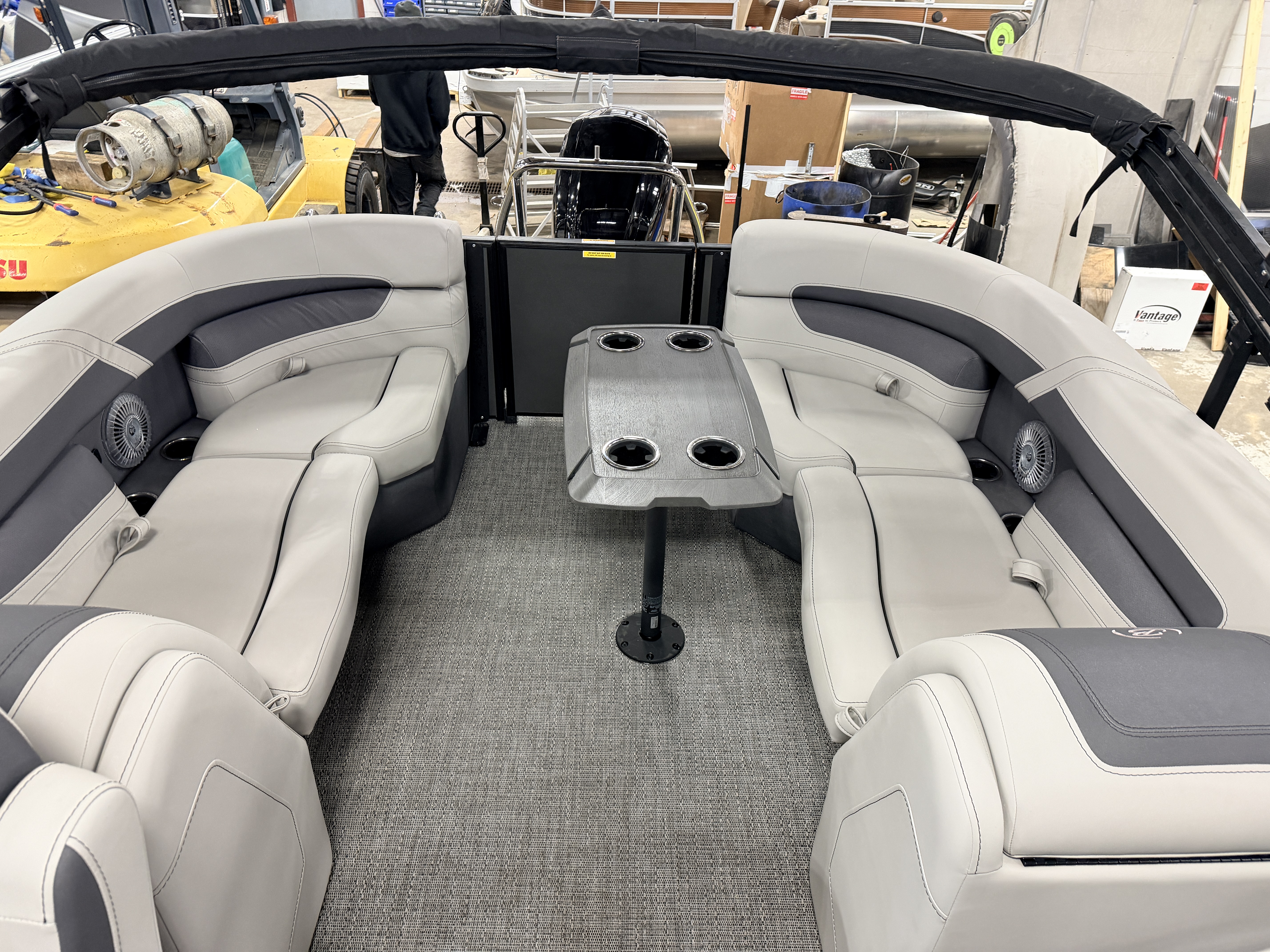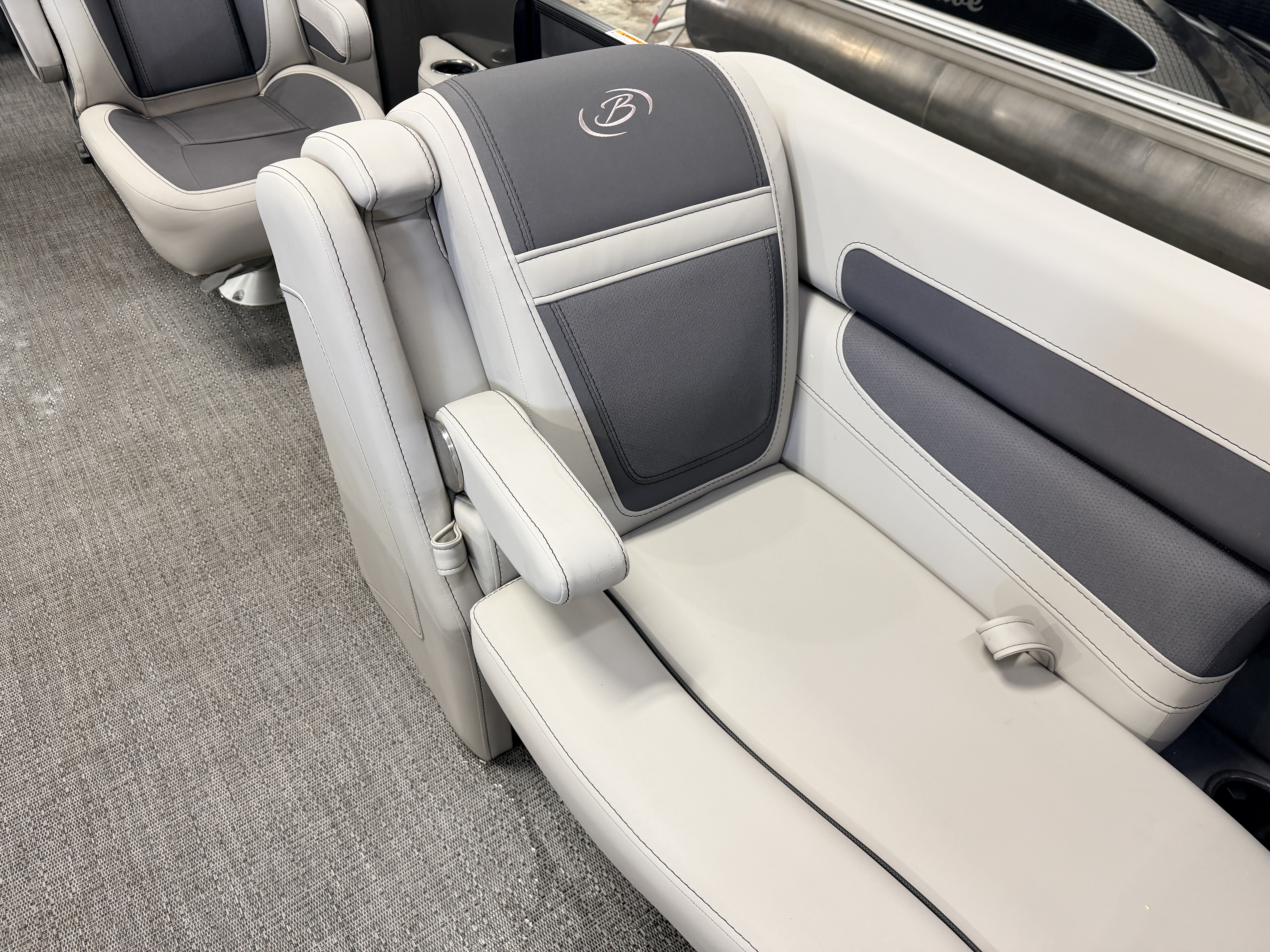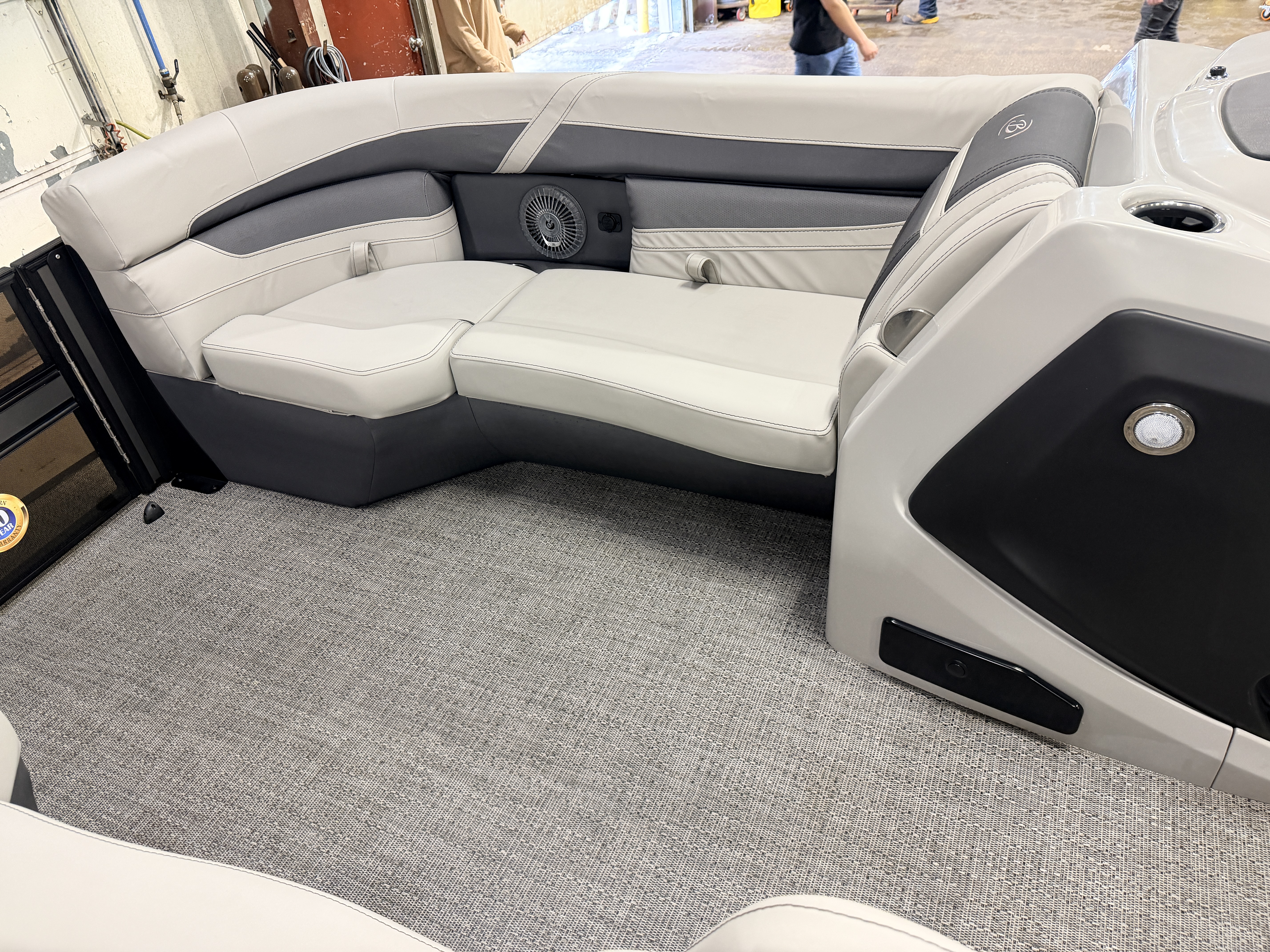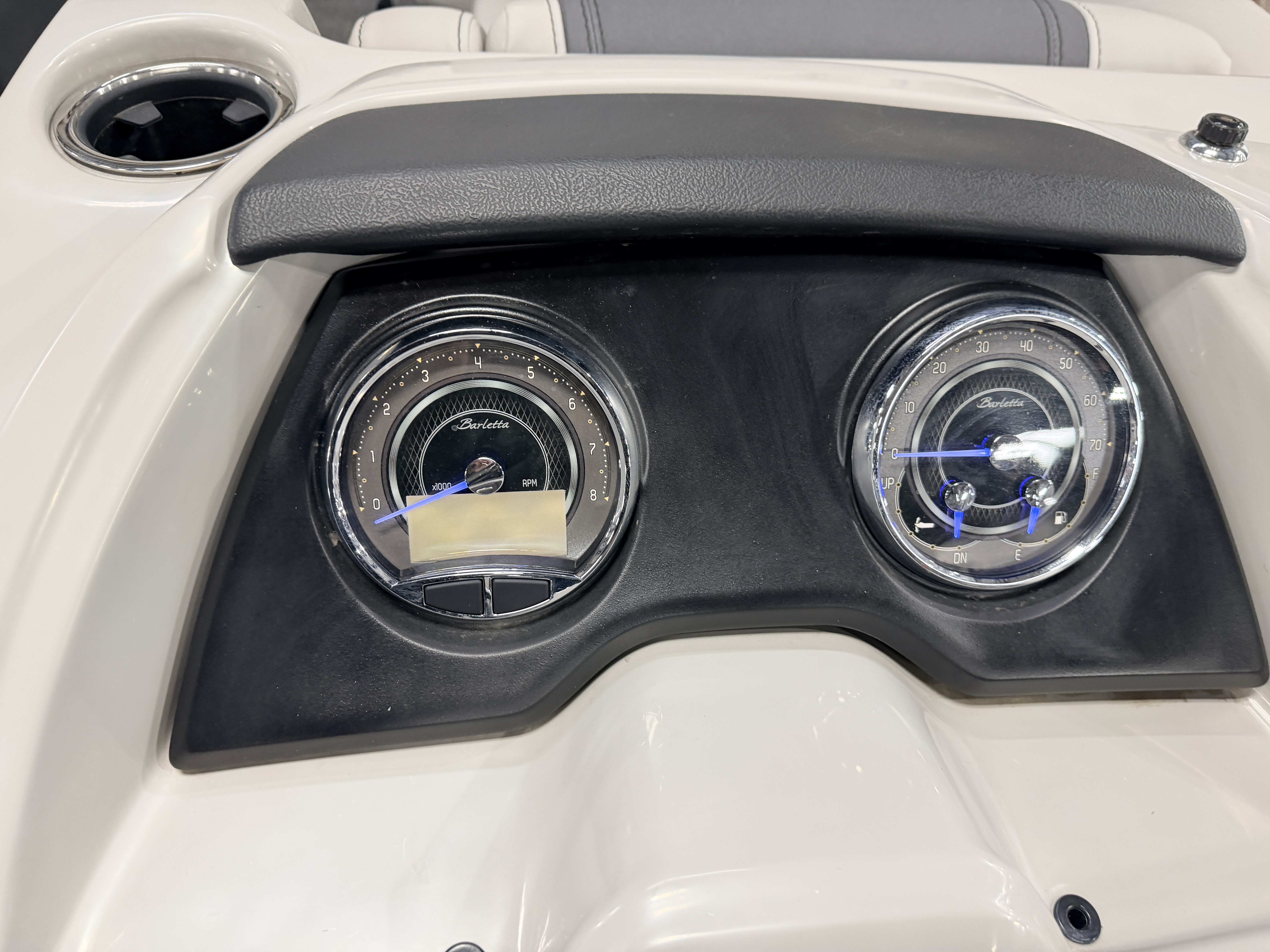 2025 Barletta Cabrio 22QC Pontoon with 115HP Mercury Command Thrust Fourstroke EFI Outboard. This quad lounge layout pontoon features 4 lounge style couches; 1 in each corner of the pontoon, along with side-by-side captain's chairs amidships. The front lounge couches each have a fold down arm rest built into the backrest. The helm features a raised platform for better viewing angle. There is a set of dog bowls built into the bottom of the helm and the entry gates are translucent allowing four legged friends to watch through the gate without worry of them jumping out. There are 2 multi-function gauges in the dash. There is a Tachometer with digital readout and a Speedometer with Fuel and Trim. There is a Simrad built into the dash which functions as a GPS chart plotter and depth finder. It does not display engine data. There is a Bluetooth audio stereo system. The rear lounge couches have flip up lounge backrests with storage underneath and there is also a wastebasket. There is a table mounted between the rear couches as well. This Barletta pontoon also features lifting strakes, full performance under sheeting, a power bimini top, a built-in ski/tow bar, and a rear swim platform with fold down swim ladder.