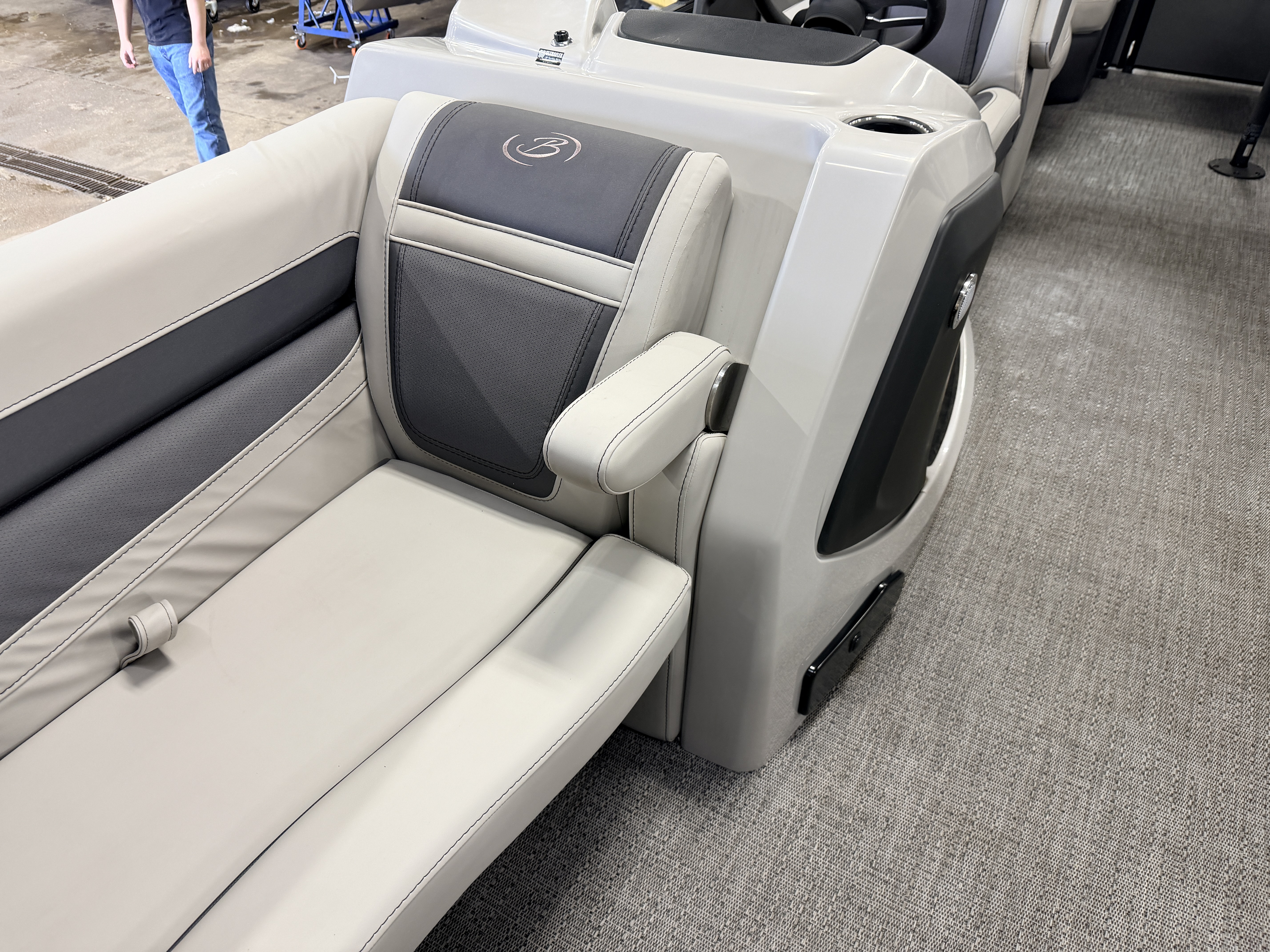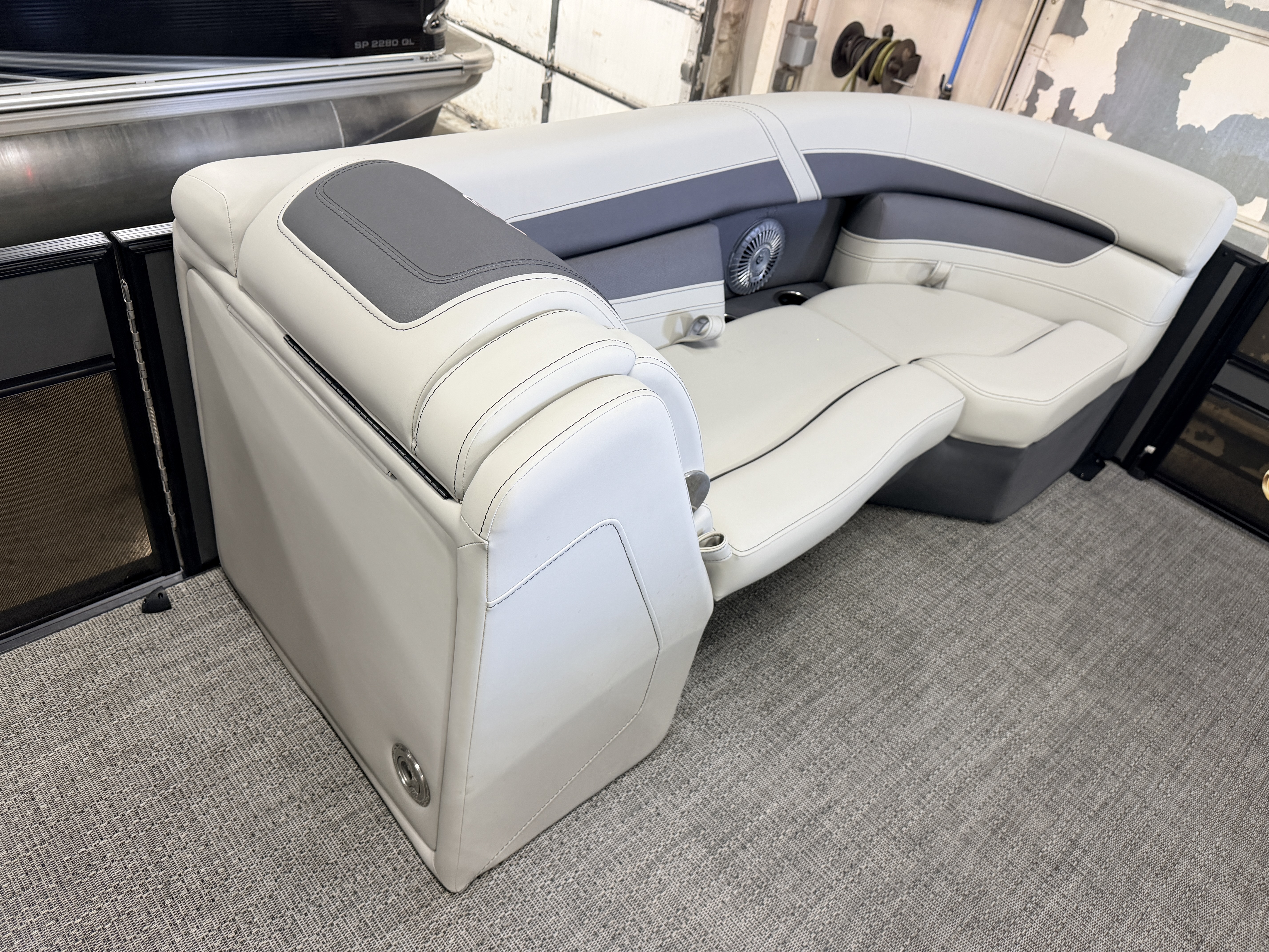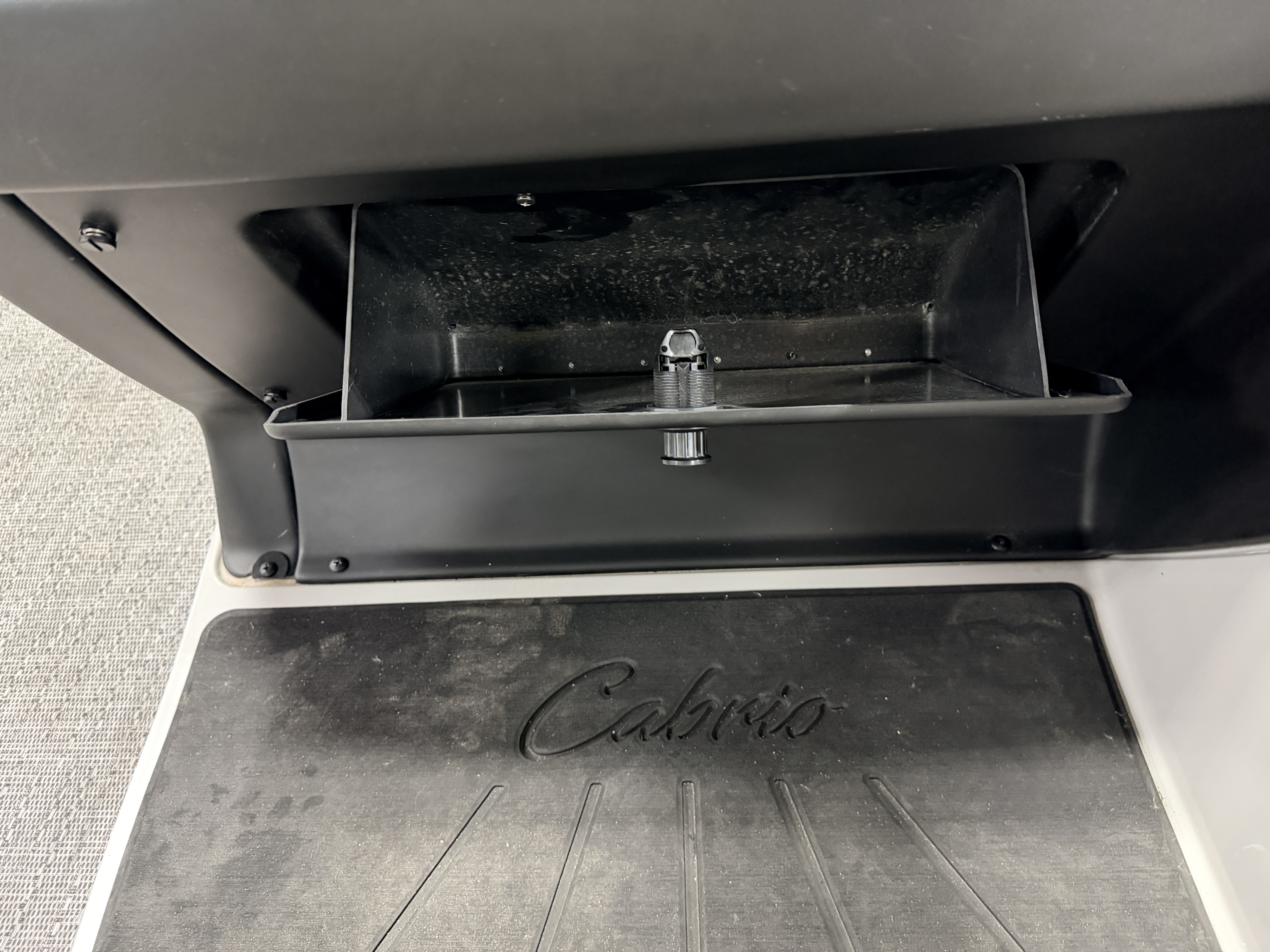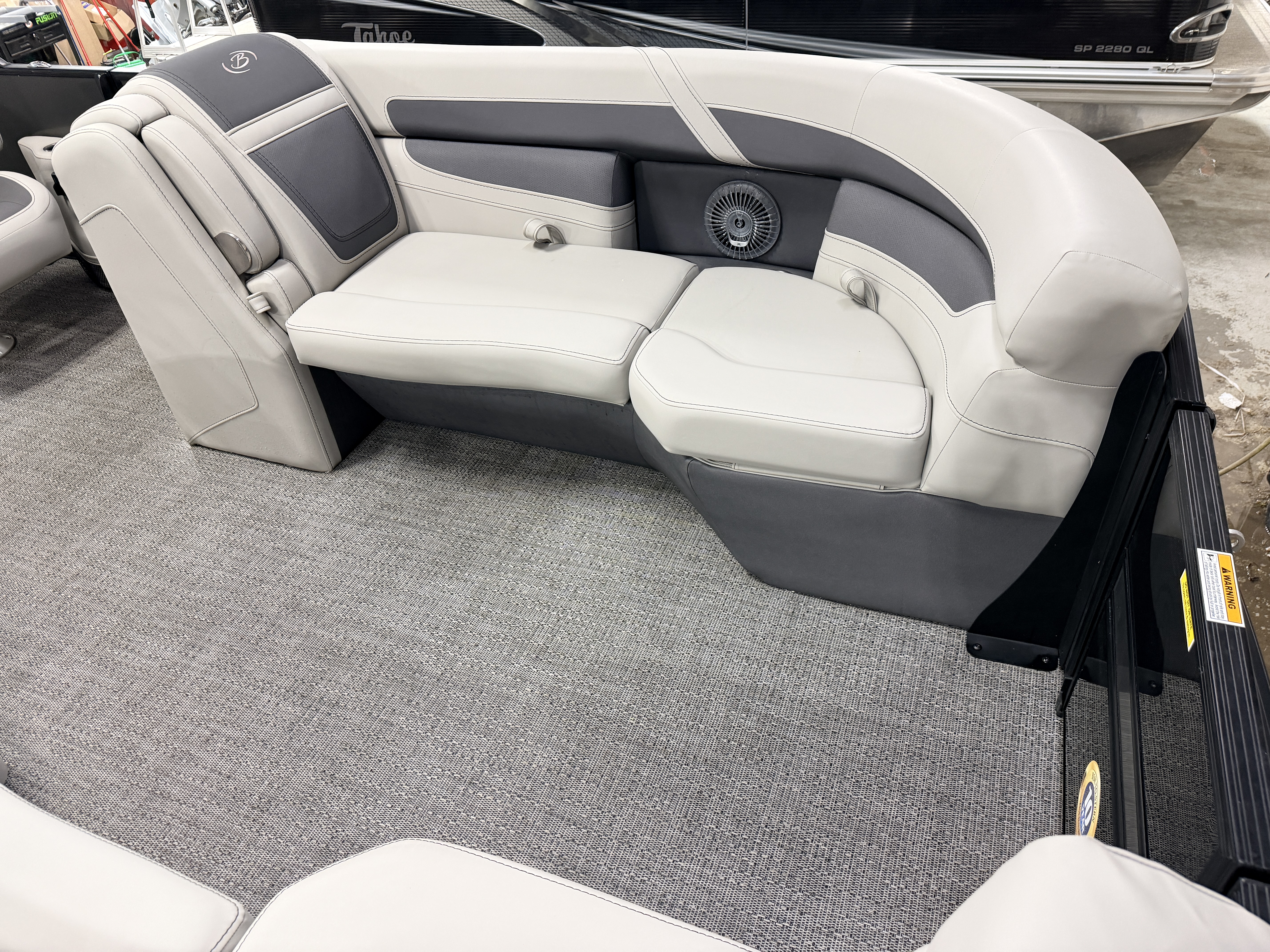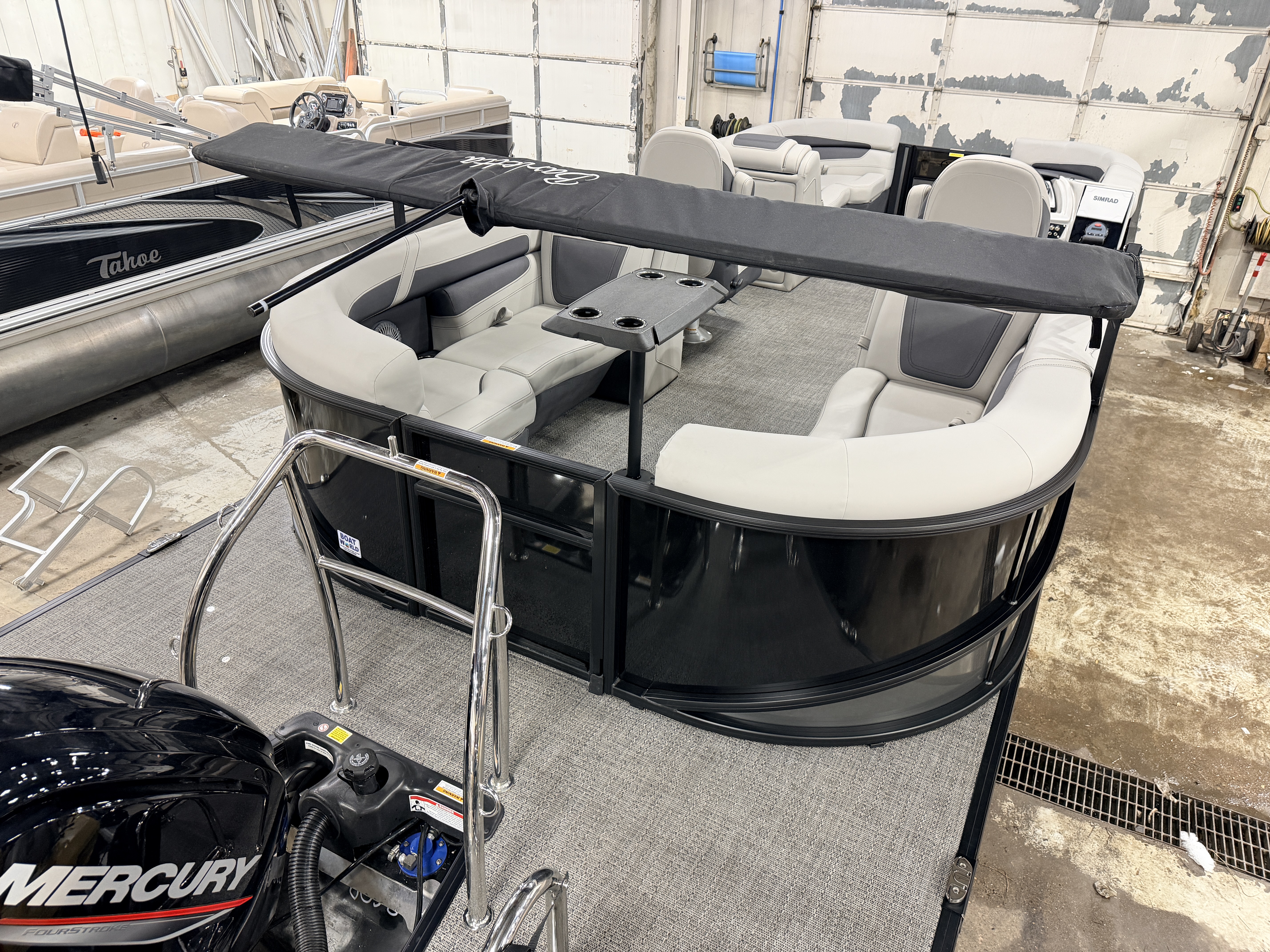 2025 Barletta Cabrio 22QC Pontoon with 115HP Mercury Command Thrust Fourstroke EFI Outboard. This quad lounge layout pontoon features 4 lounge style couches; 1 in each corner of the pontoon, along with side-by-side captain's chairs amidships. The front lounge couches each have a fold down arm rest built into the backrest. The helm features a raised platform for better viewing angle. There is a set of dog bowls built into the bottom of the helm and the entry gates are translucent allowing four legged friends to watch through the gate without worry of them jumping out. There are 2 multi-function gauges in the dash. There is a Tachometer with digital readout and a Speedometer with Fuel and Trim. There is a Simrad built into the dash which functions as a GPS chart plotter and depth finder. It does not display engine data. There is a Bluetooth audio stereo system. The rear lounge couches have flip up lounge backrests with storage underneath and there is also a wastebasket. There is a table mounted between the rear couches as well. This Barletta pontoon also features lifting strakes, full performance under sheeting, a power bimini top, a built-in ski/tow bar, and a rear swim platform with fold down swim ladder.
