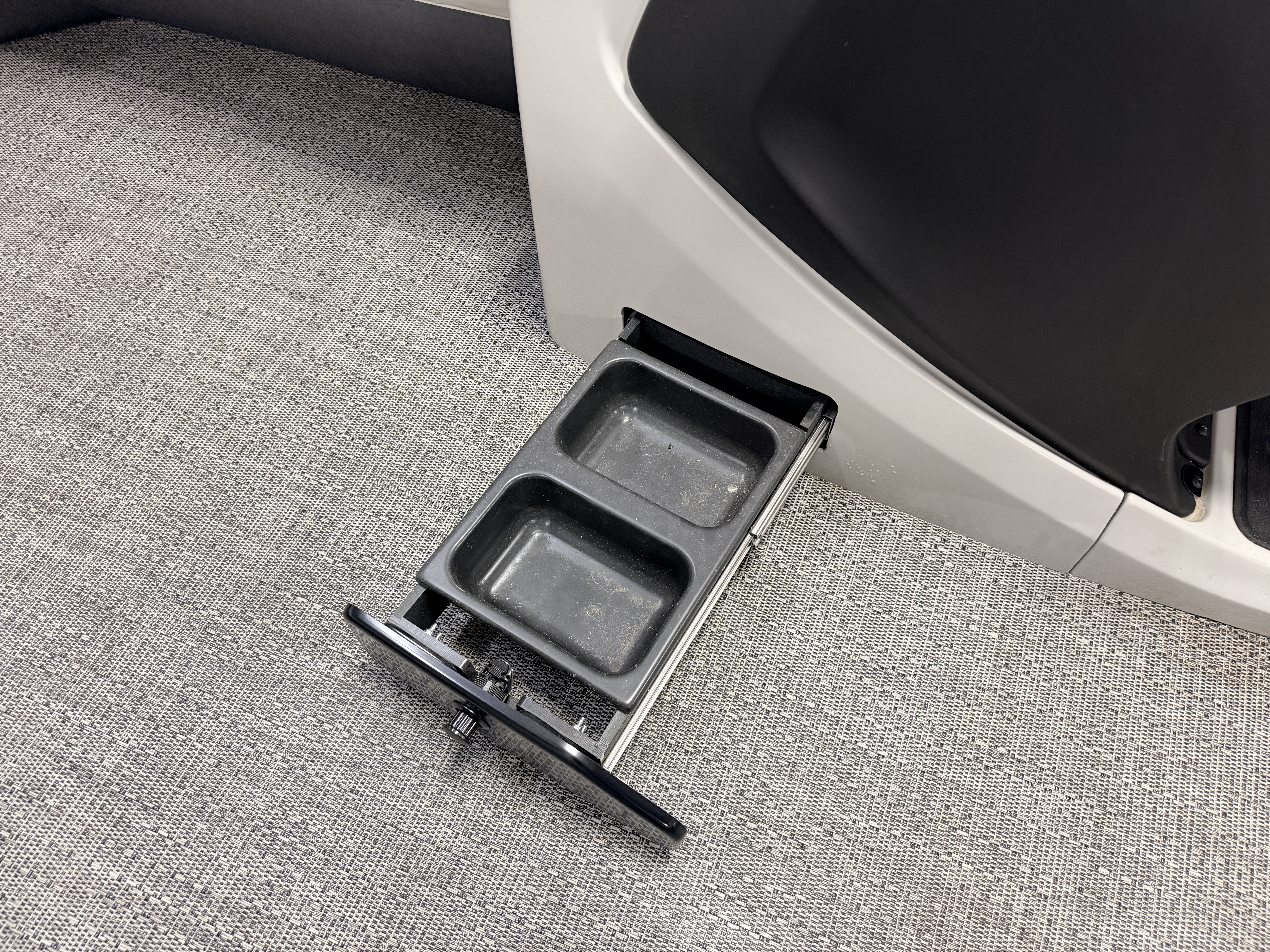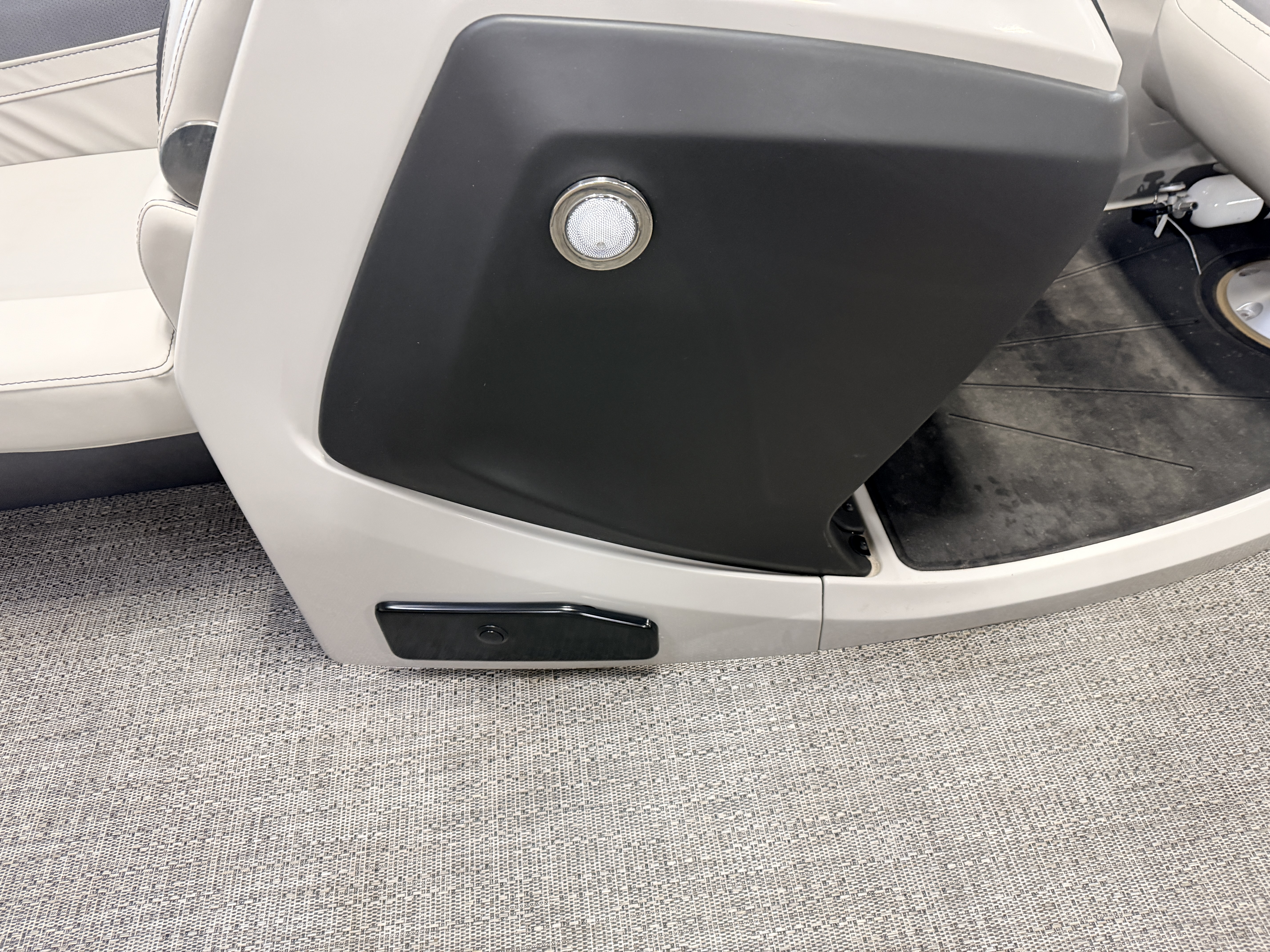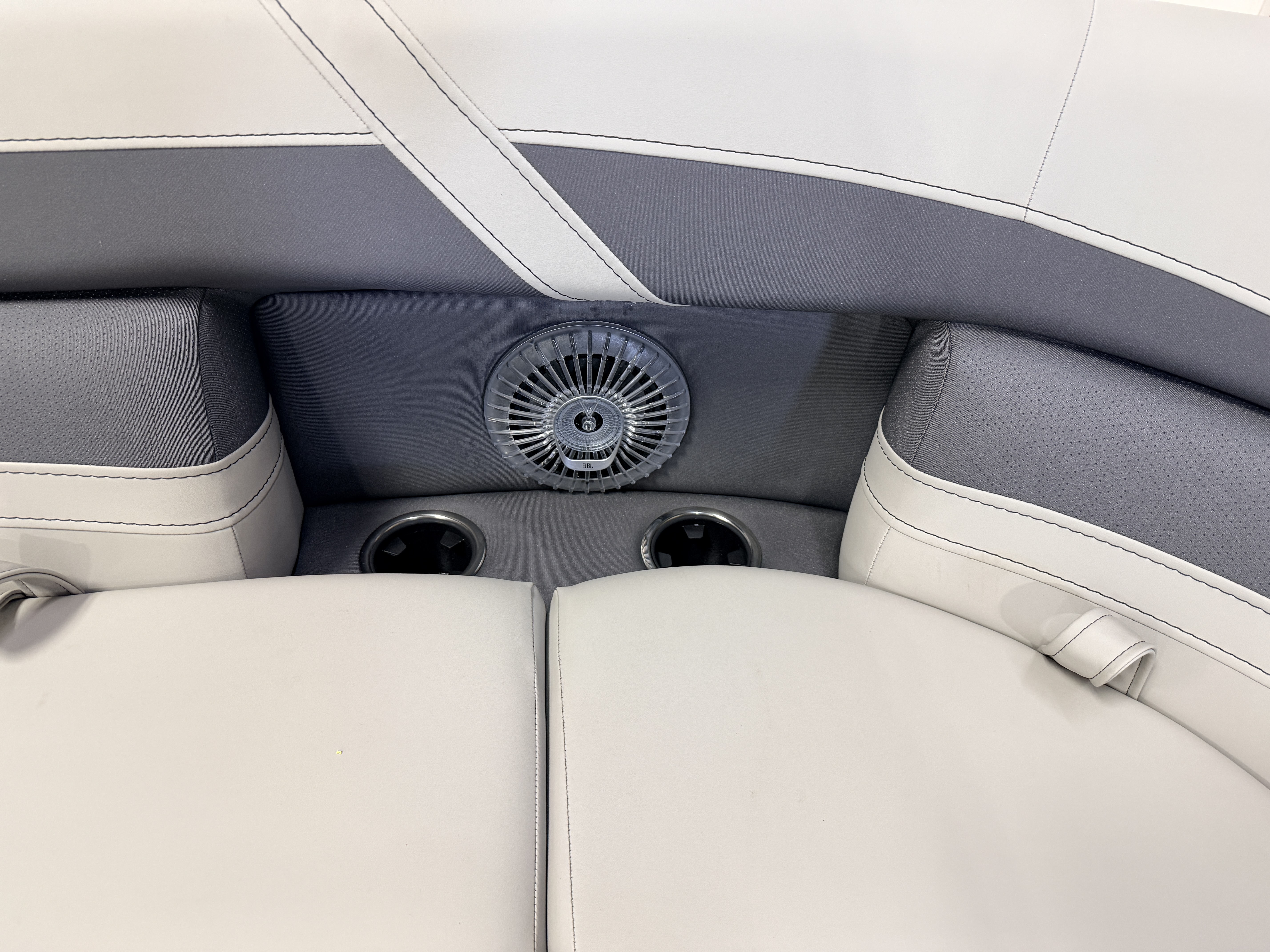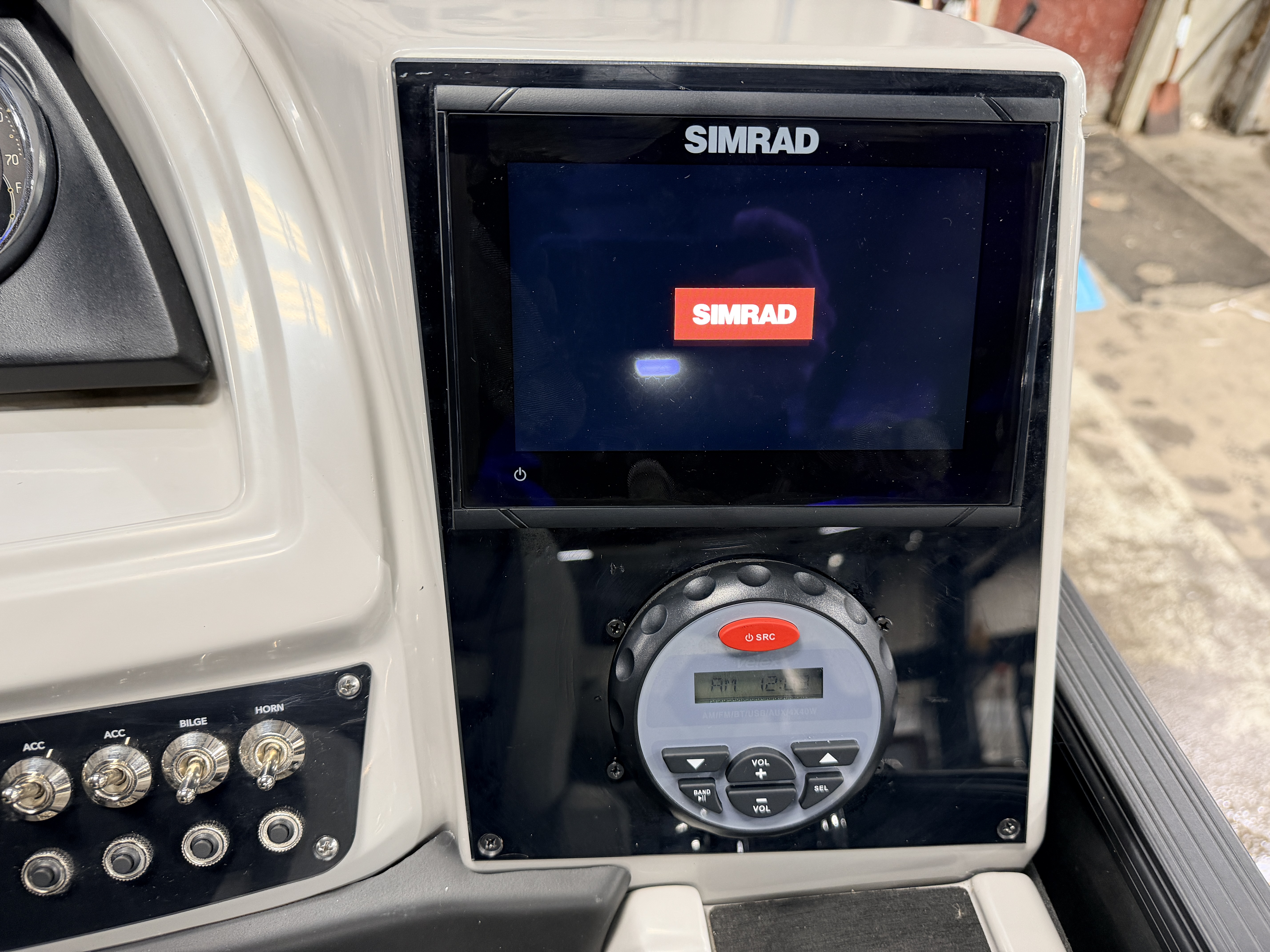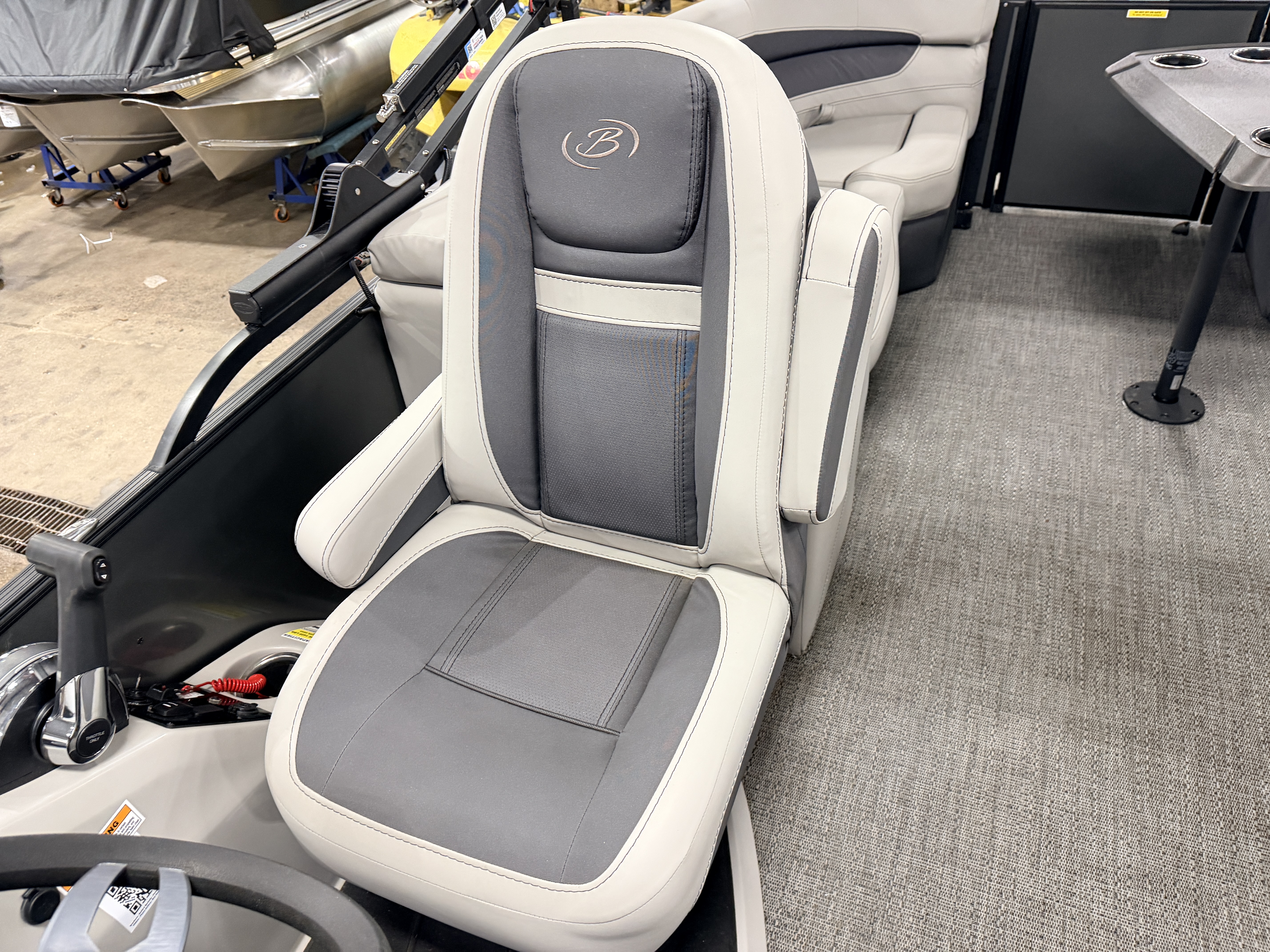 2025 Barletta Cabrio 22QC Pontoon with 115HP Mercury Command Thrust Fourstroke EFI Outboard. This quad lounge layout pontoon features 4 lounge style couches; 1 in each corner of the pontoon, along with side-by-side captain's chairs amidships. The front lounge couches each have a fold down arm rest built into the backrest. The helm features a raised platform for better viewing angle. There is a set of dog bowls built into the bottom of the helm and the entry gates are translucent allowing four legged friends to watch through the gate without worry of them jumping out. There are 2 multi-function gauges in the dash. There is a Tachometer with digital readout and a Speedometer with Fuel and Trim. There is a Simrad built into the dash which functions as a GPS chart plotter and depth finder. It does not display engine data. There is a Bluetooth audio stereo system. The rear lounge couches have flip up lounge backrests with storage underneath and there is also a wastebasket. There is a table mounted between the rear couches as well. This Barletta pontoon also features lifting strakes, full performance under sheeting, a power bimini top, a built-in ski/tow bar, and a rear swim platform with fold down swim ladder.