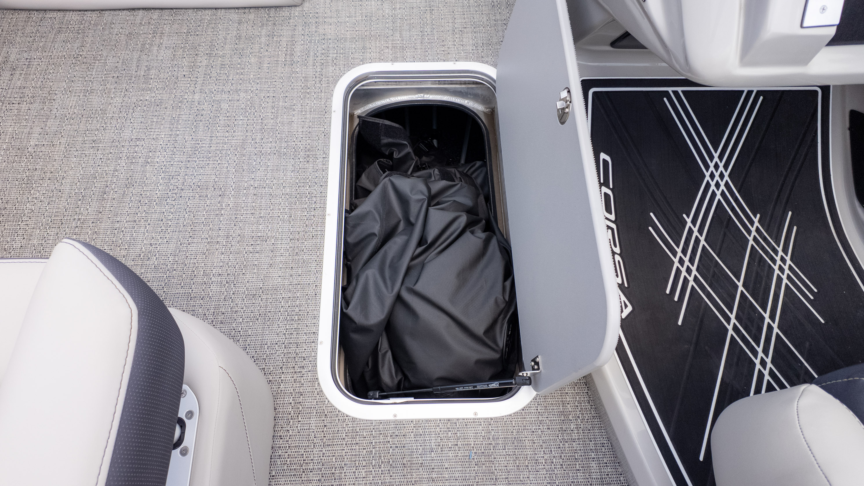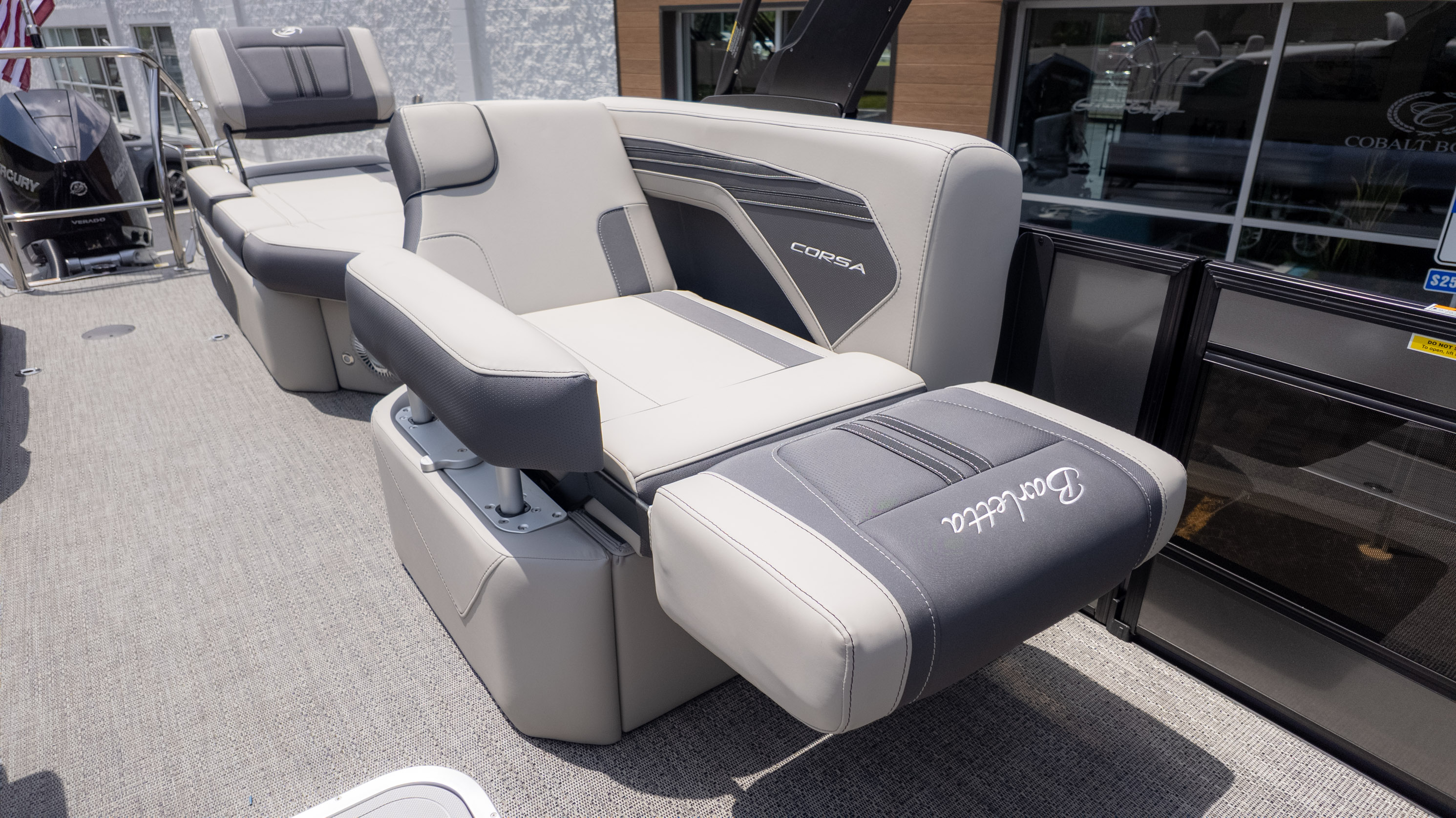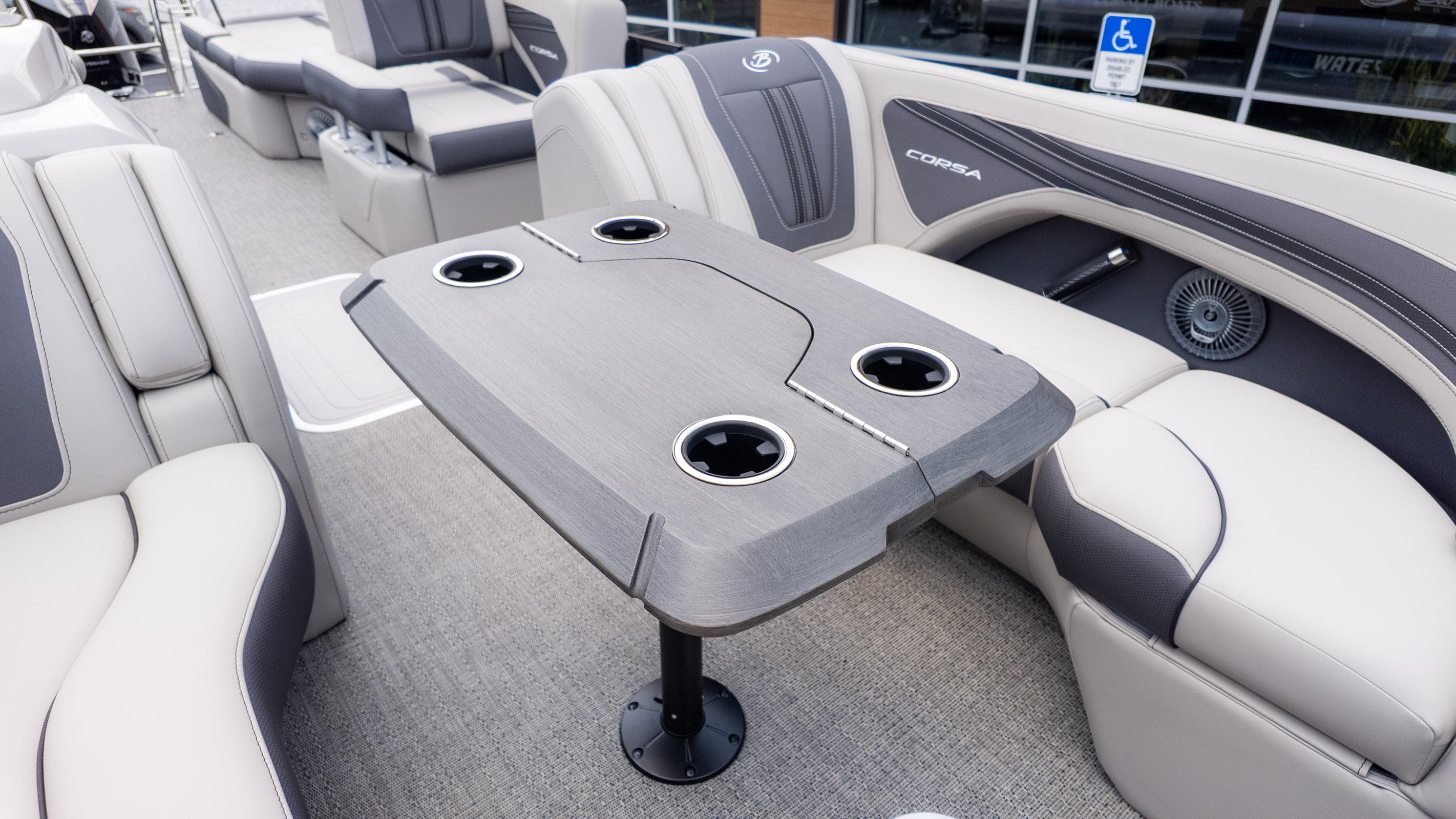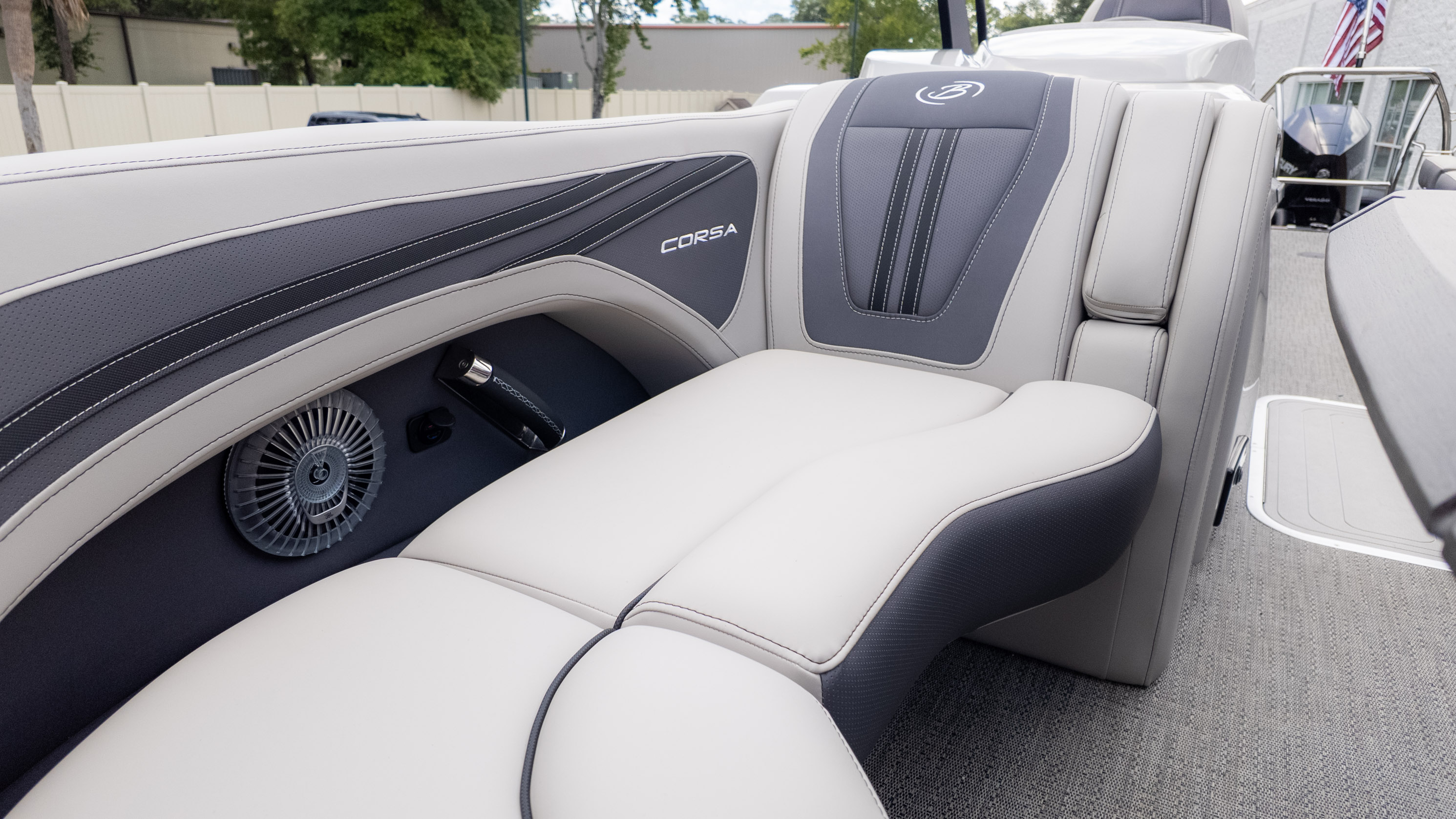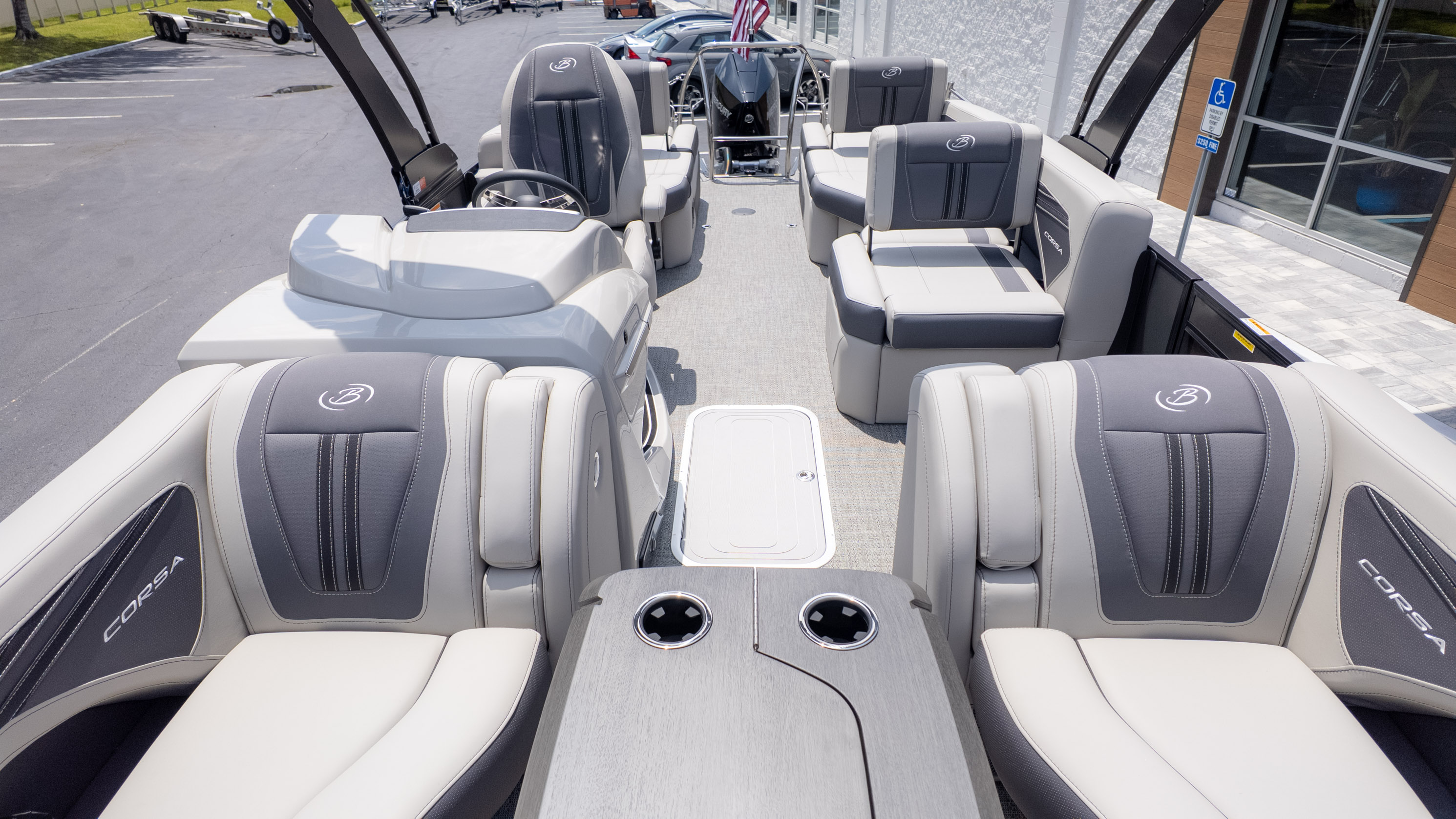 Pet owners, rejoice! This Corsa boasts a stair-step pet-friendly stern boarding ladder and even integrated pet food/water dishes at the helm. Plus, the E-Z Access integrated waste basket helps keep things tidy. The interior RGB lighting package adds a cool ambiance for evening cruises. And with a powerful Mercury 300L Verado V8 engine, you'll glide across the water with ease. This boat is perfect for those who want to combine luxury, comfort, and a whole lot of fun for everyone on board.