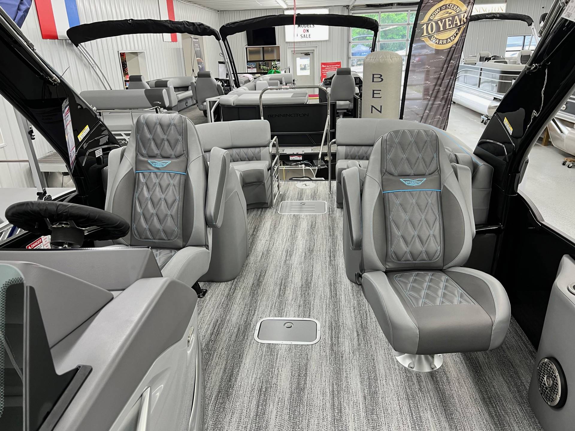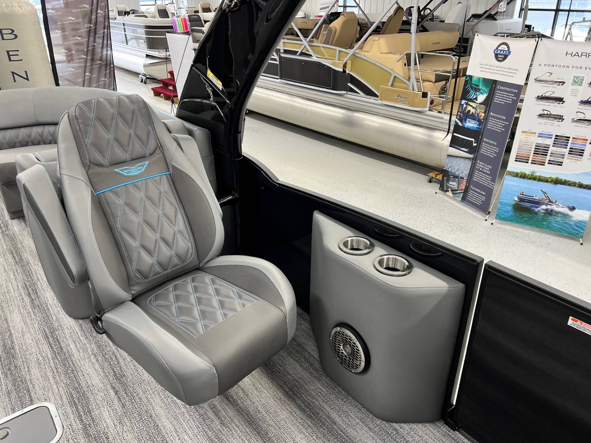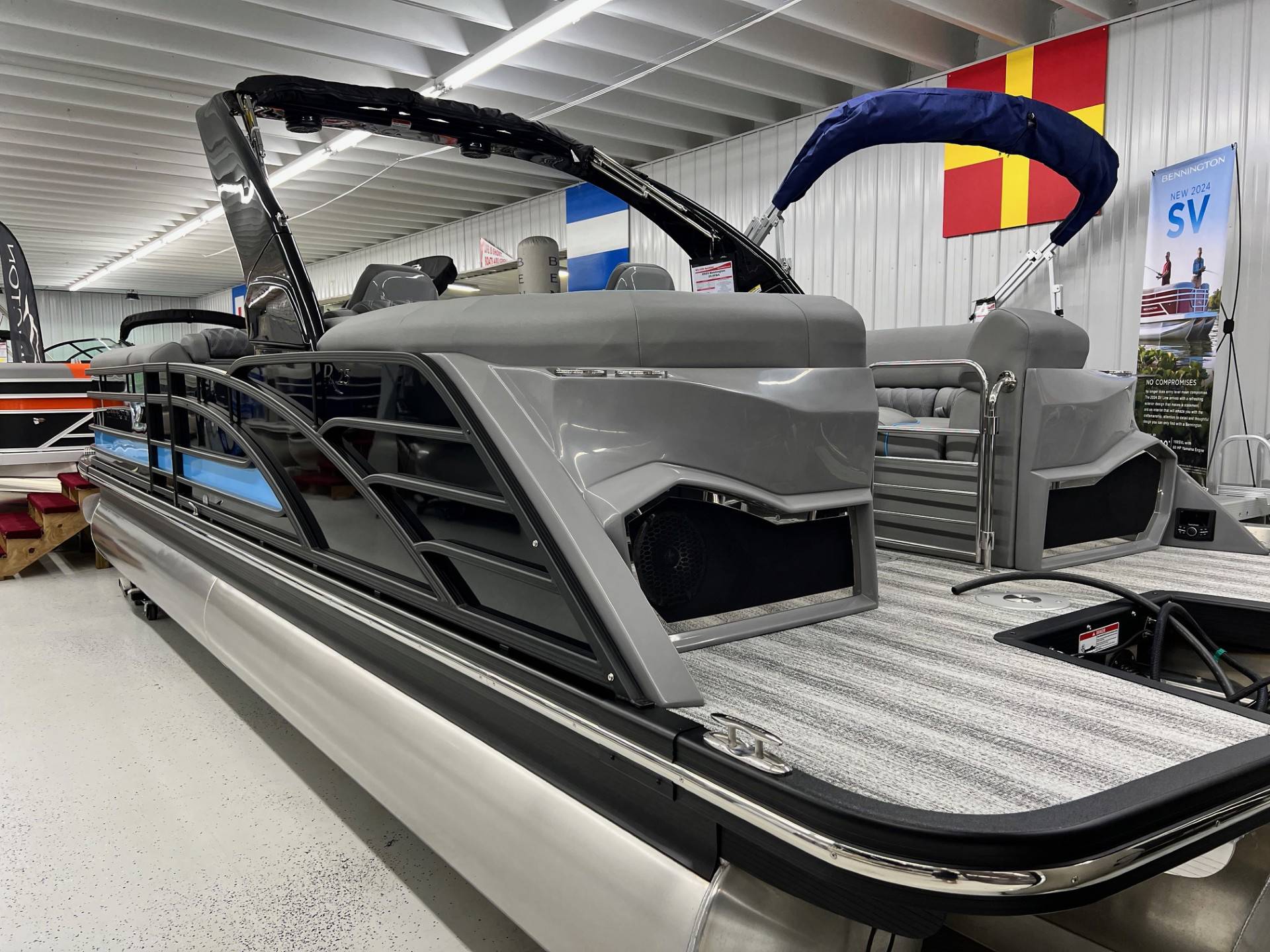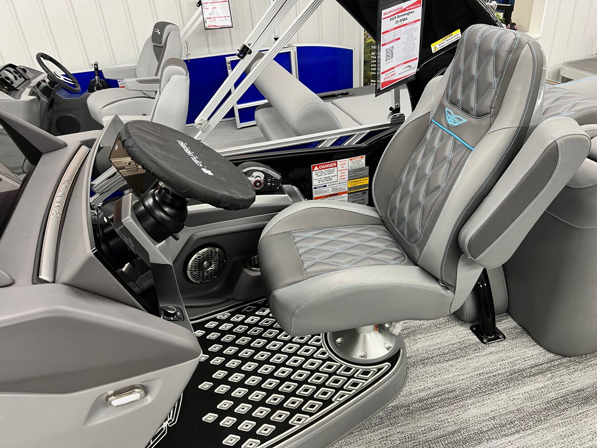 2025 Bennington 25 RFBA powered by a Mercury V350XL 6.4!Factory Installed Options:Exterior- smooth gemini black with smooth bottom azure blue accentsInterior- graphite pillowtop sport with perforated carbon accentsBlack canvasBlackout luxeCladded power archMatte slate zebrawood trim accentsShoreline grey flooringUpgrade M2 speakerBlack corvina steering wheelConsole exchangeToe kick lightingLighted cupholdersExterior side lightingUnderwater lightsDeluxe ottoman coolerAzure blue embroidery packageStainless steel rub railBow & aft pop up cleatsElliptical sport performance package 25ftFuel 73galDual battery switchCenter & anchor storagePower distribution centerSimrad 9 Vivid 12 carbonFender post with clipAtmos fastback podsRemovable 62" ski pylon