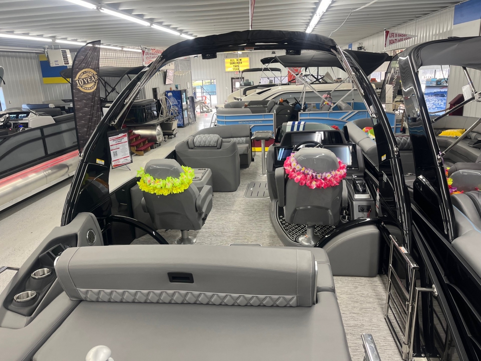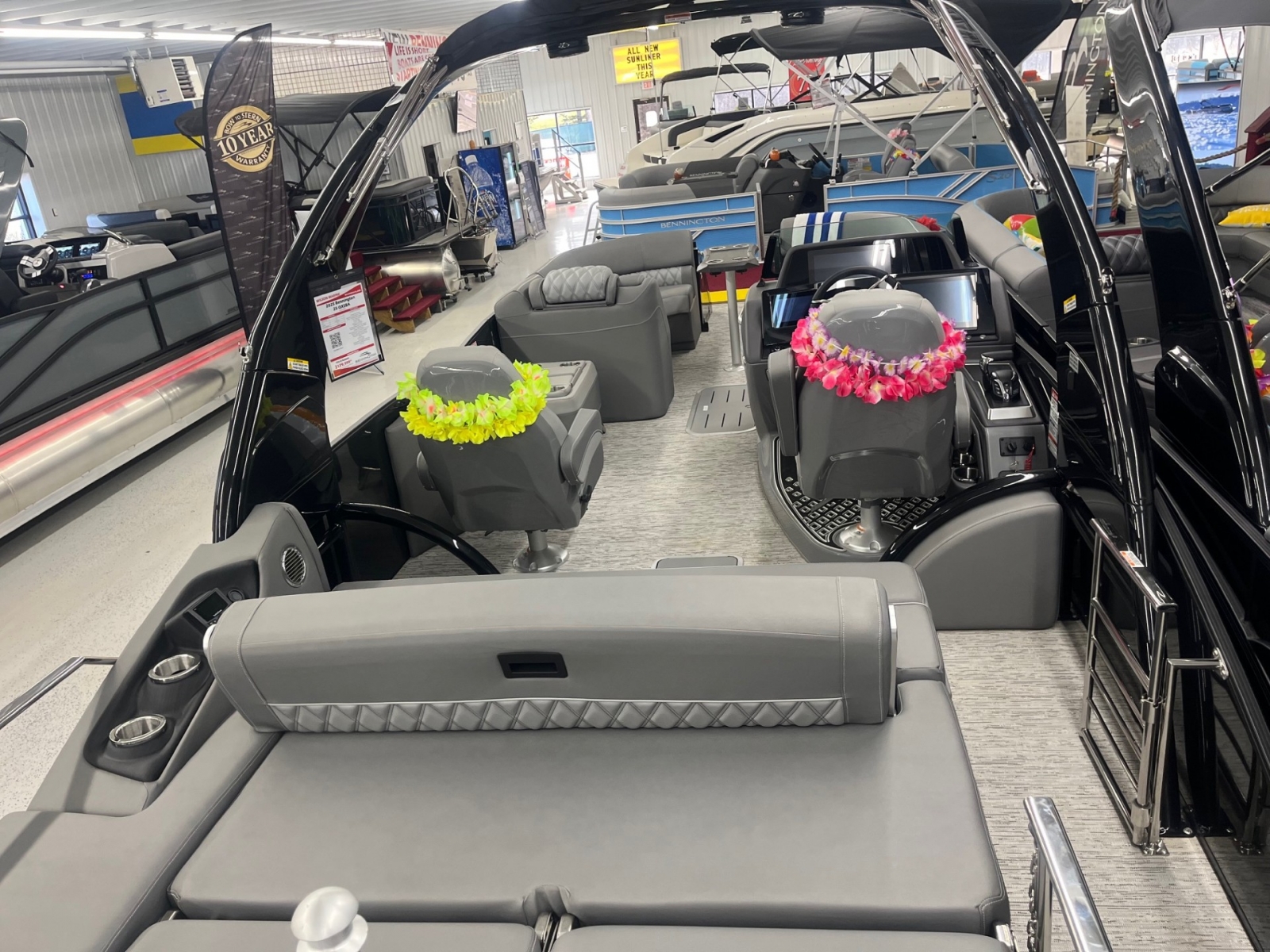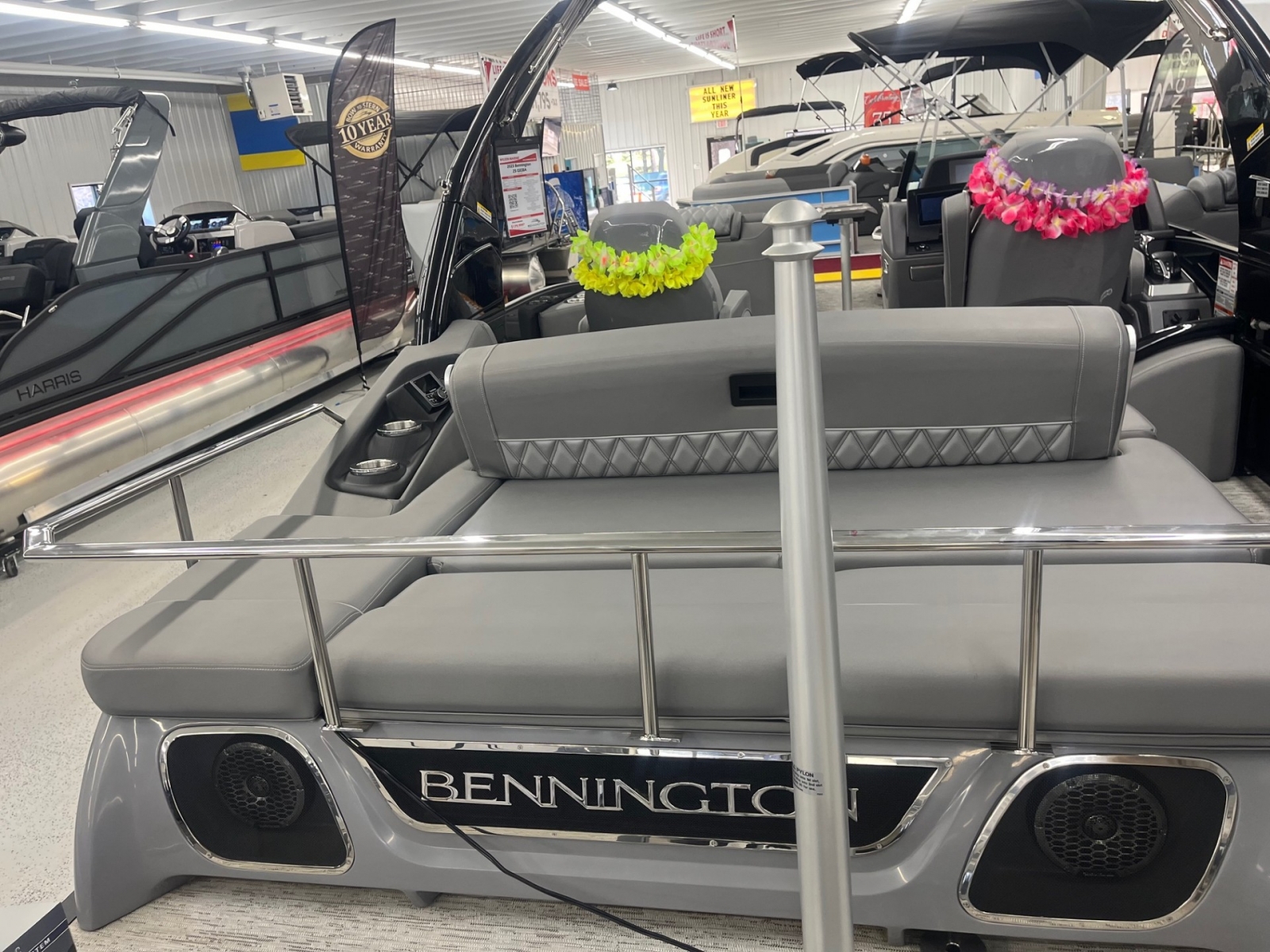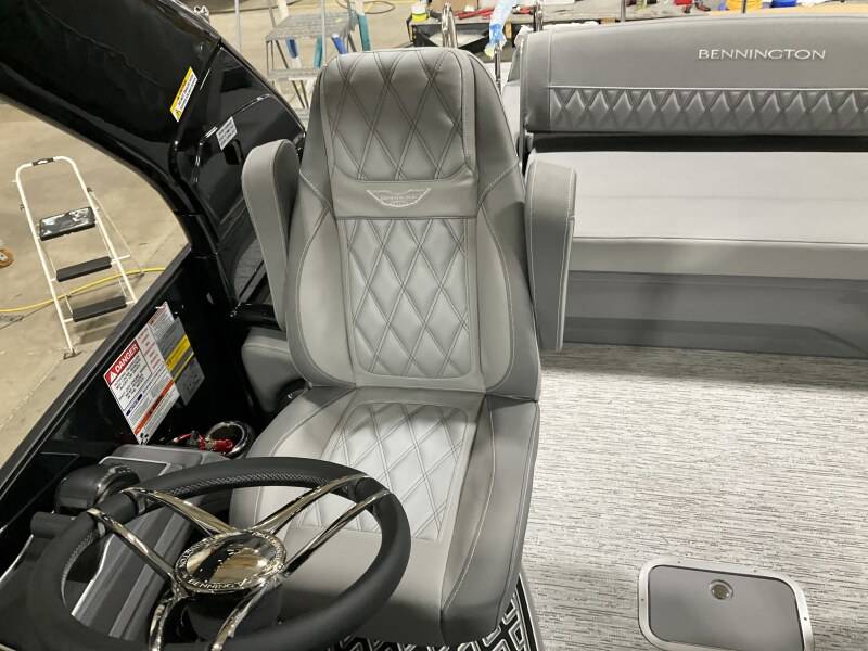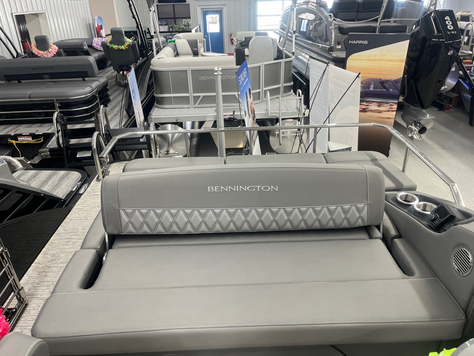 2025 Bennington 25QSBA powered by a Yamaha XF425NSB!Factory Installed Options:Exterior- smooth gemini black with smooth metallic silver top accentsInterior- pillowtop sport graphite simtex with perforated silver accentsBlack canvasBlackout luxeCladded power archValencia grey flooringUpgraded M2 speaker sub/ampLighted cupholdersToekick lightingLighted mesh logo on swingbackOttomanLuxury keeper railDeluxe swingback queen reclinerBlack rectangular bow tablePop up cleats aftESP upgrade 25' OB .125Fuel-73 galDual port battery switchLifted strakesWavetamer to bowIn floor storageSealed transomDisplay Garmin 12 Vivid 7Fender post with clipsAmerican flag54" ski pylon