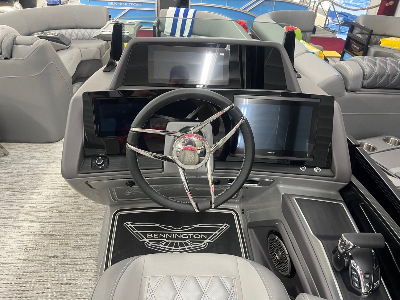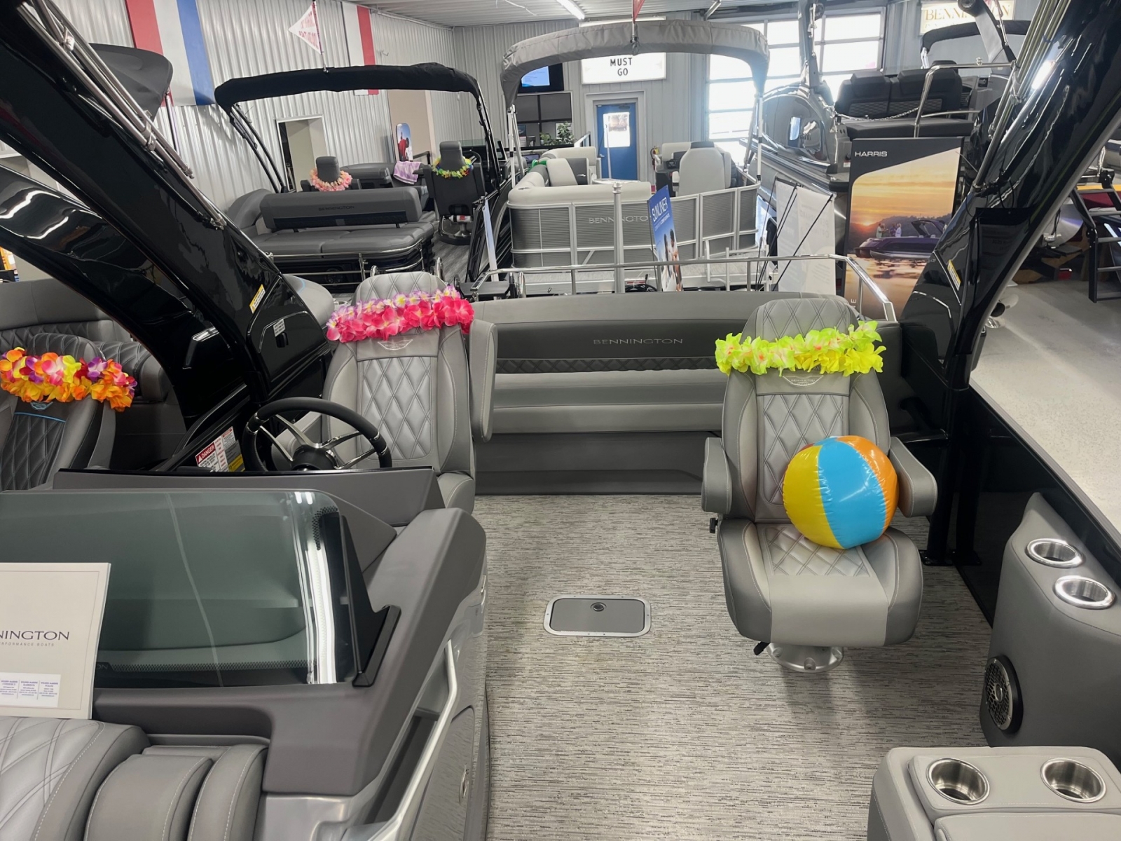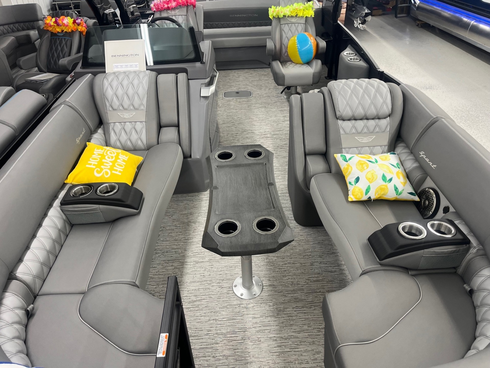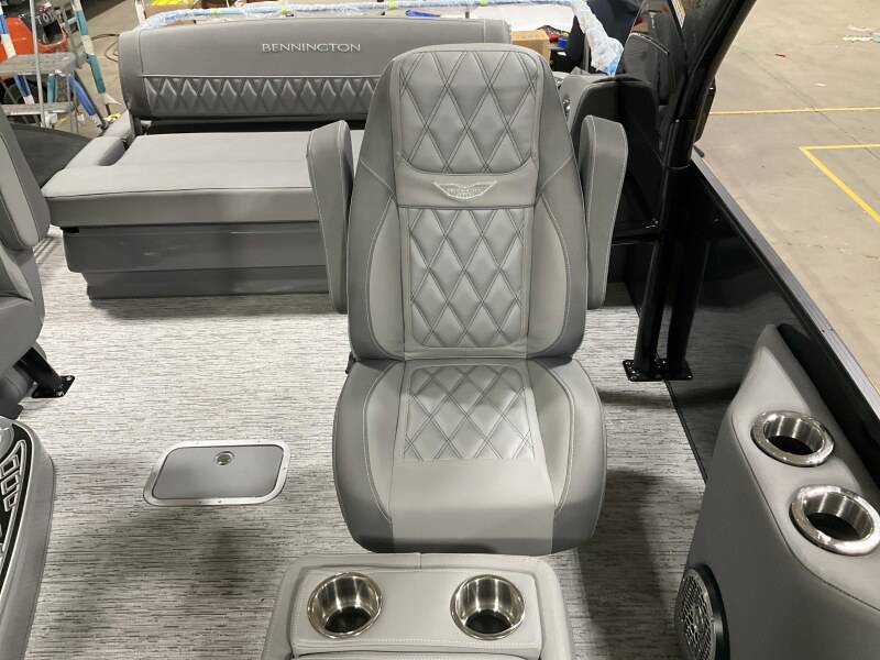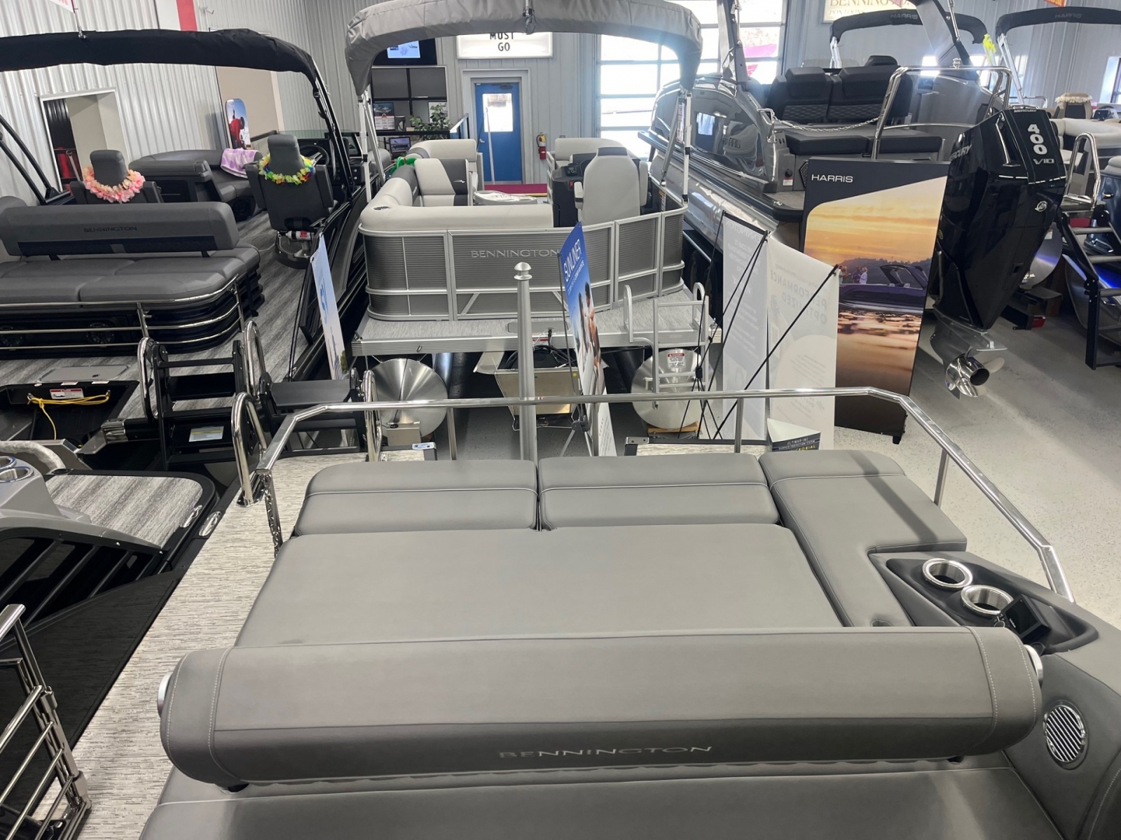 2025 Bennington 25QSBA powered by a Yamaha XF425NSB!Factory Installed Options:Exterior- smooth gemini black with smooth metallic silver top accentsInterior- pillowtop sport graphite simtex with perforated silver accentsBlack canvasBlackout luxeCladded power archValencia grey flooringUpgraded M2 speaker sub/ampLighted cupholdersToekick lightingLighted mesh logo on swingbackOttomanLuxury keeper railDeluxe swingback queen reclinerBlack rectangular bow tablePop up cleats aftESP upgrade 25' OB .125Fuel-73 galDual port battery switchLifted strakesWavetamer to bowIn floor storageSealed transomDisplay Garmin 12 Vivid 7Fender post with clipsAmerican flag54" ski pylon