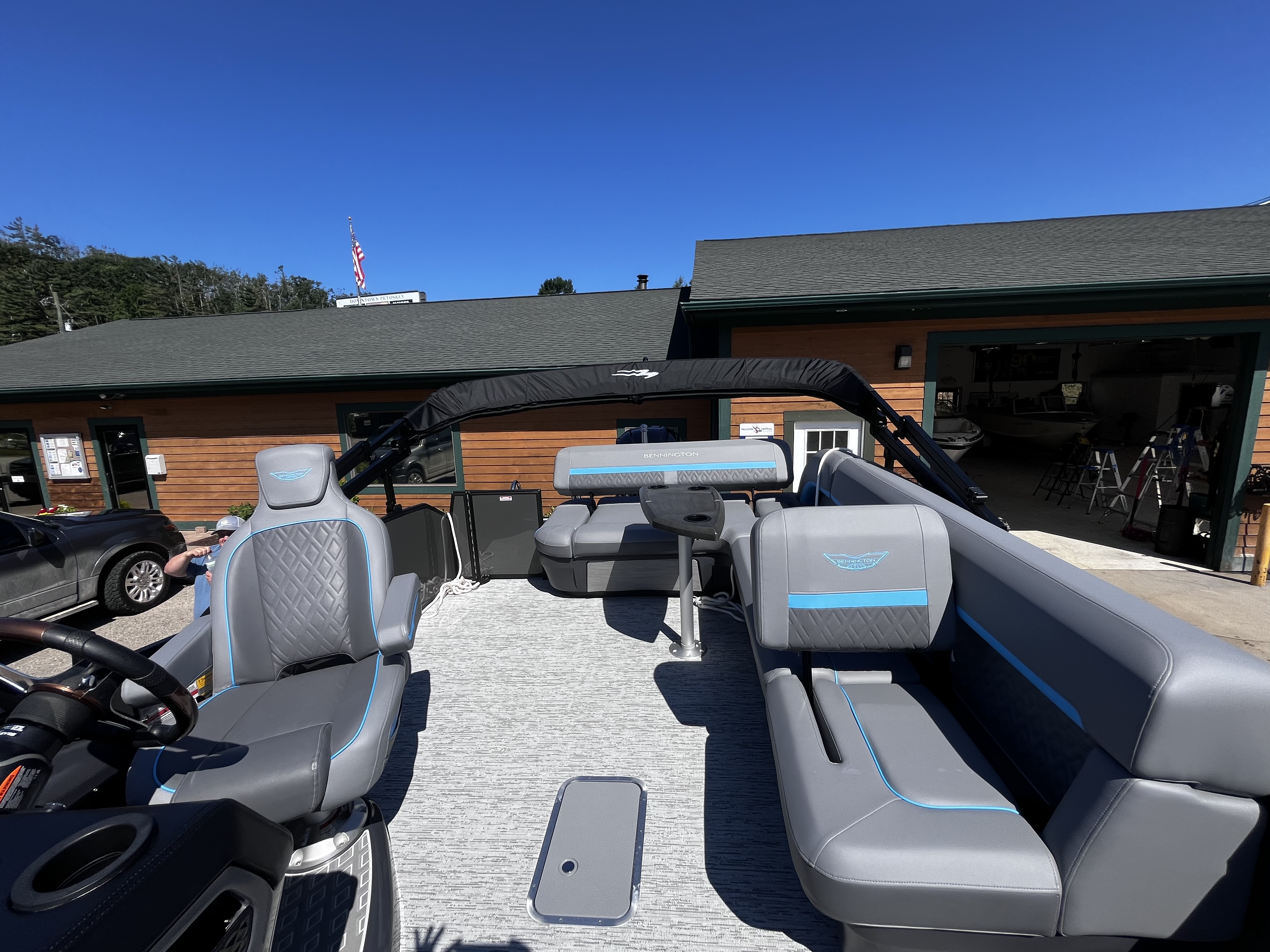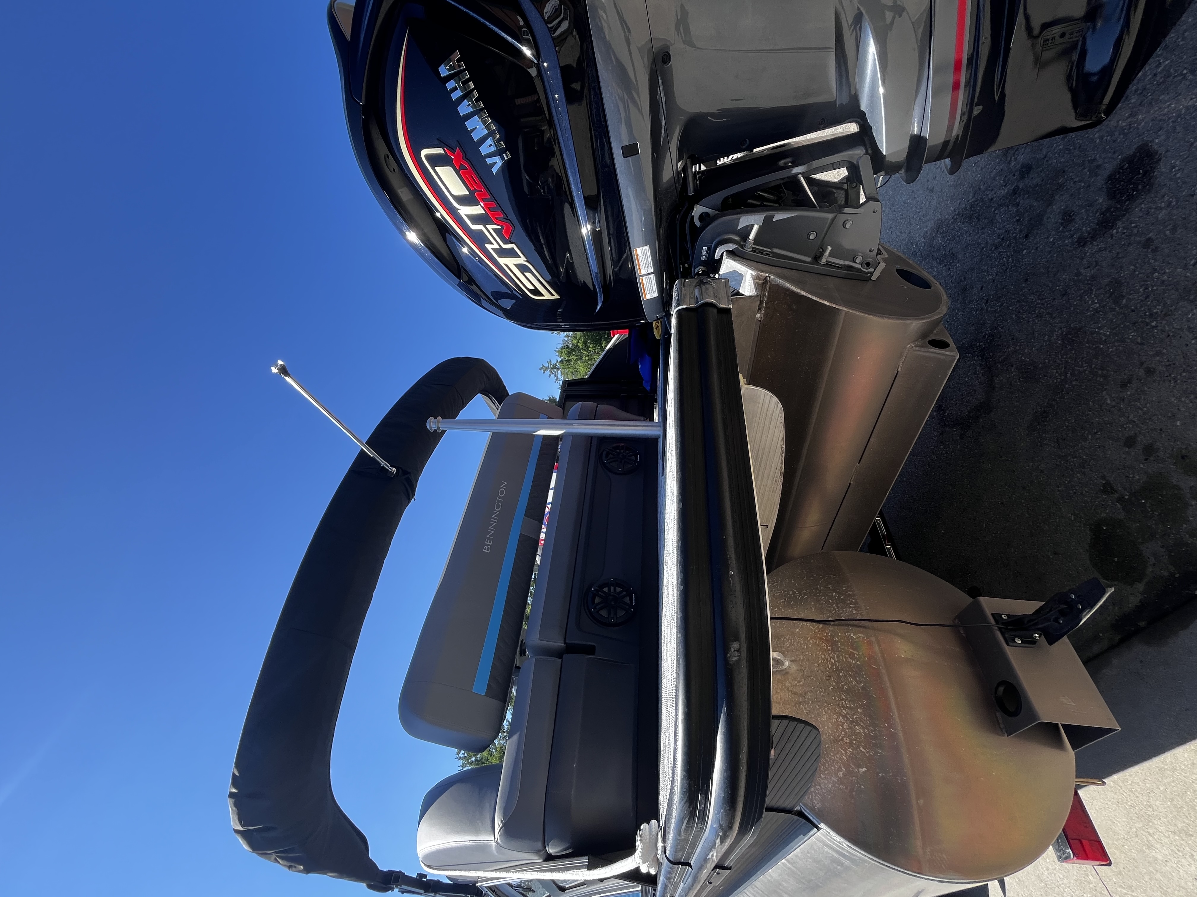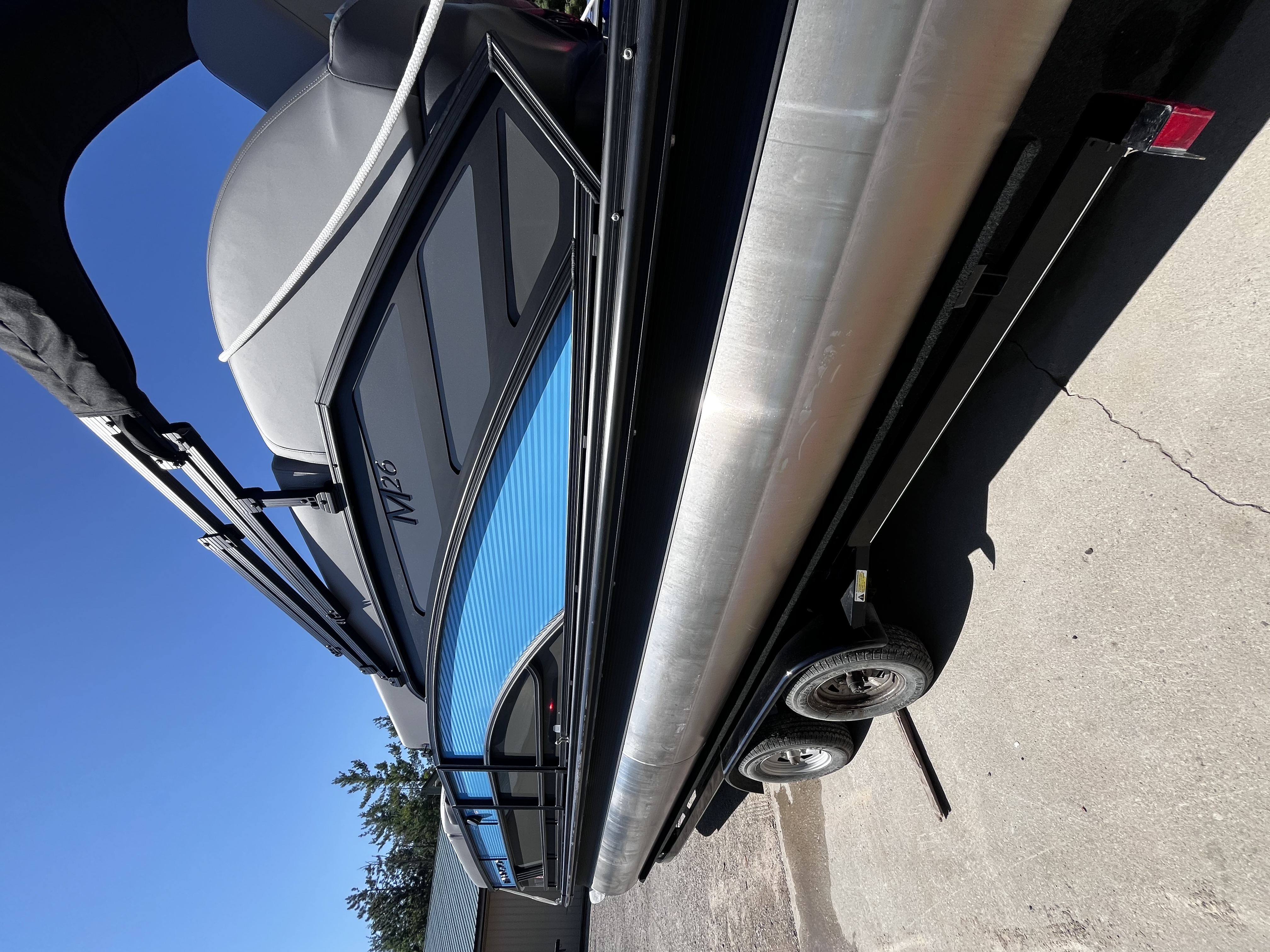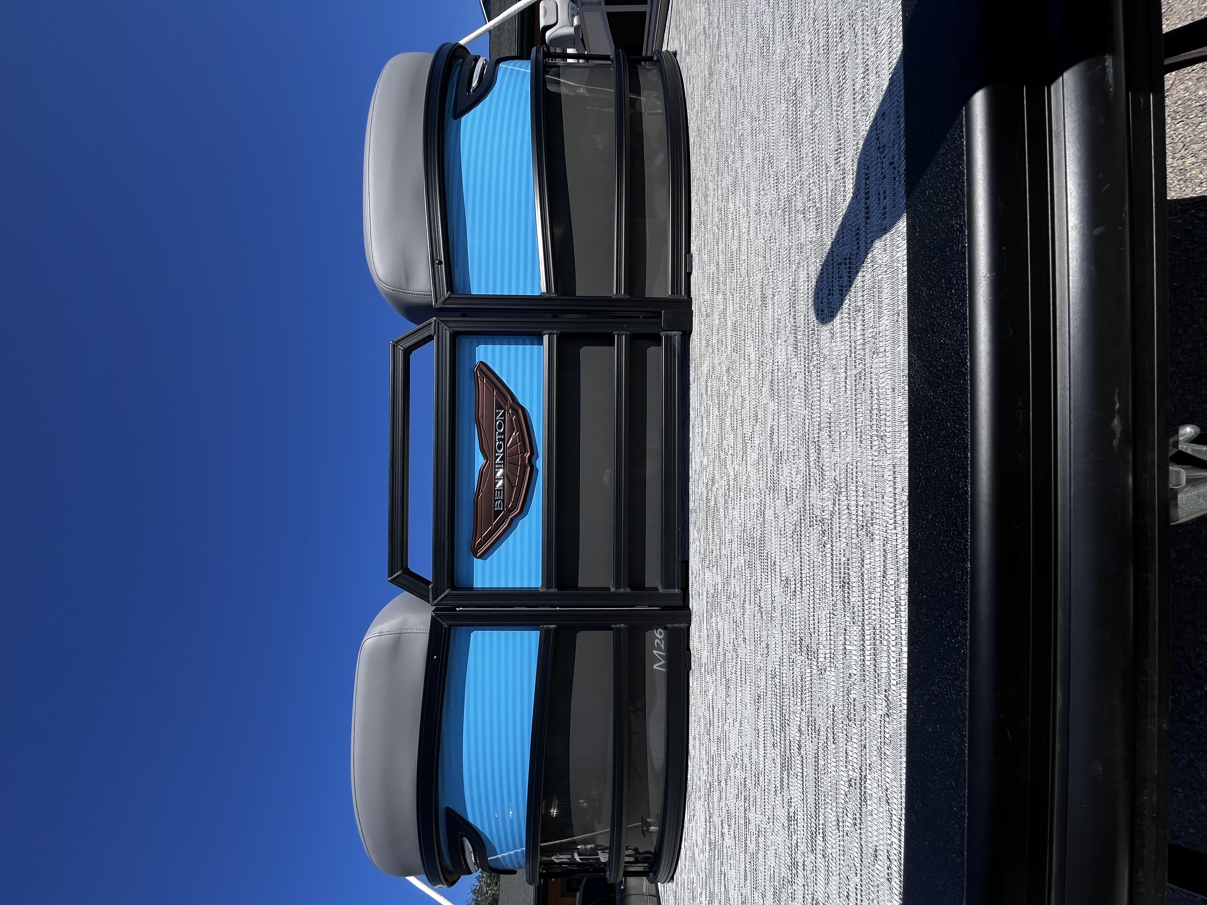 2025 Bennington 26ML L-Series Layout SPS tritoon (3- 25” tubes), smooth anthracite exterior with azure blue textured accent blackout luxe model, Yamaha 250hp VMax SHO outboard engine (VF250XB), black canvas, valencia gray vinyl flooring, veneto graphite upholstery with azure blue simtex accent, zebrawood slate matte trim accent, black/bronze luxe blackout wing logos, black heavy duty rub rail, M Series Luxe trim package, Garmin Vivid 7” multifunction display, elevated helm w/ mythos flooring, RGB speaker lighting, lumbar lighting, pop-up cleats bow & aft, SPS tritoon package, power assist hydraulic steering, center tube in-floor storage, dual battery system, 54” removable ski tow pylon. Rated for 13 people. 48 gallon center gravity tank. MSRP: $134,892. Our sale price was $106,228. Now Demo Sale price is $84,500