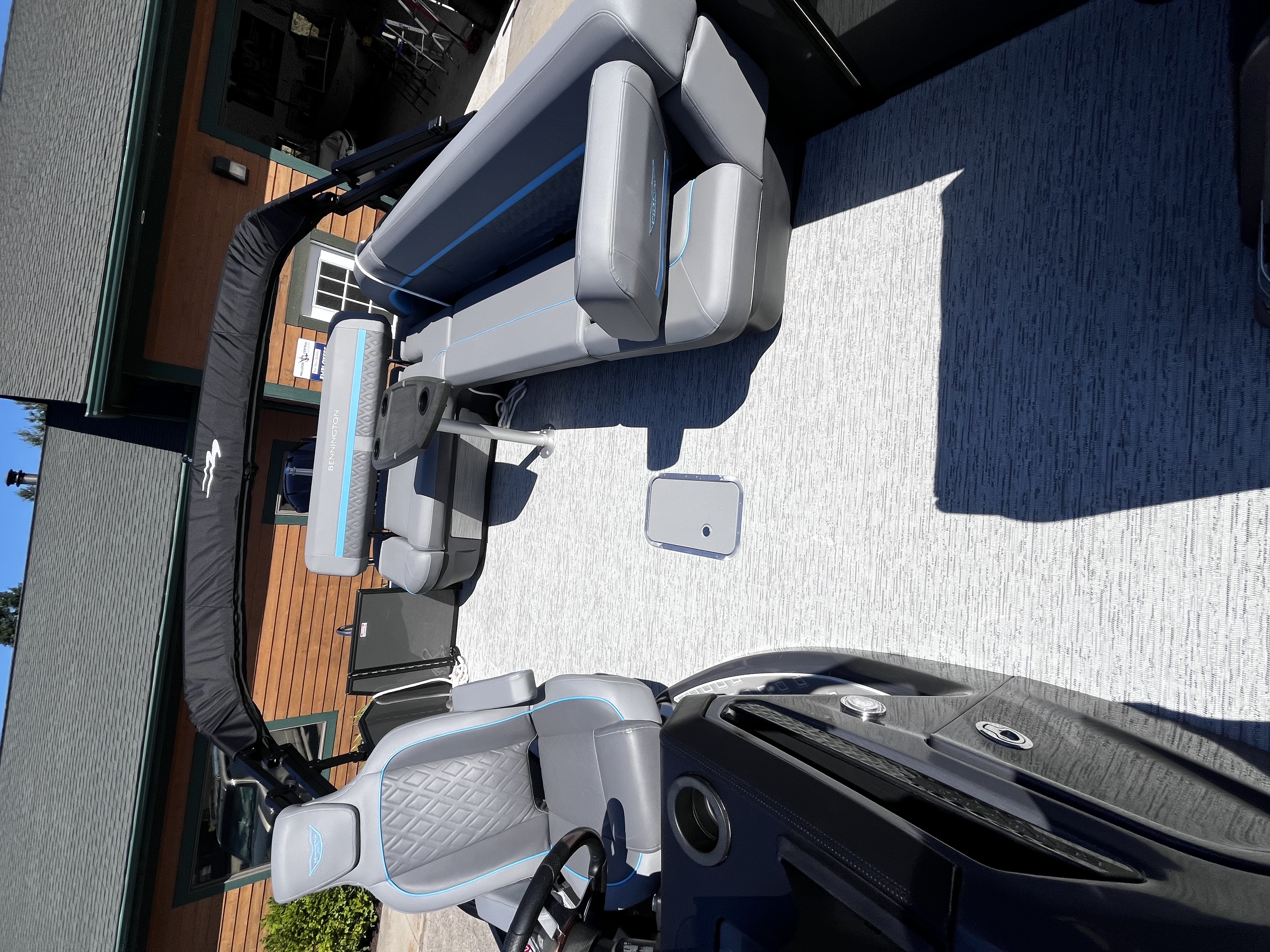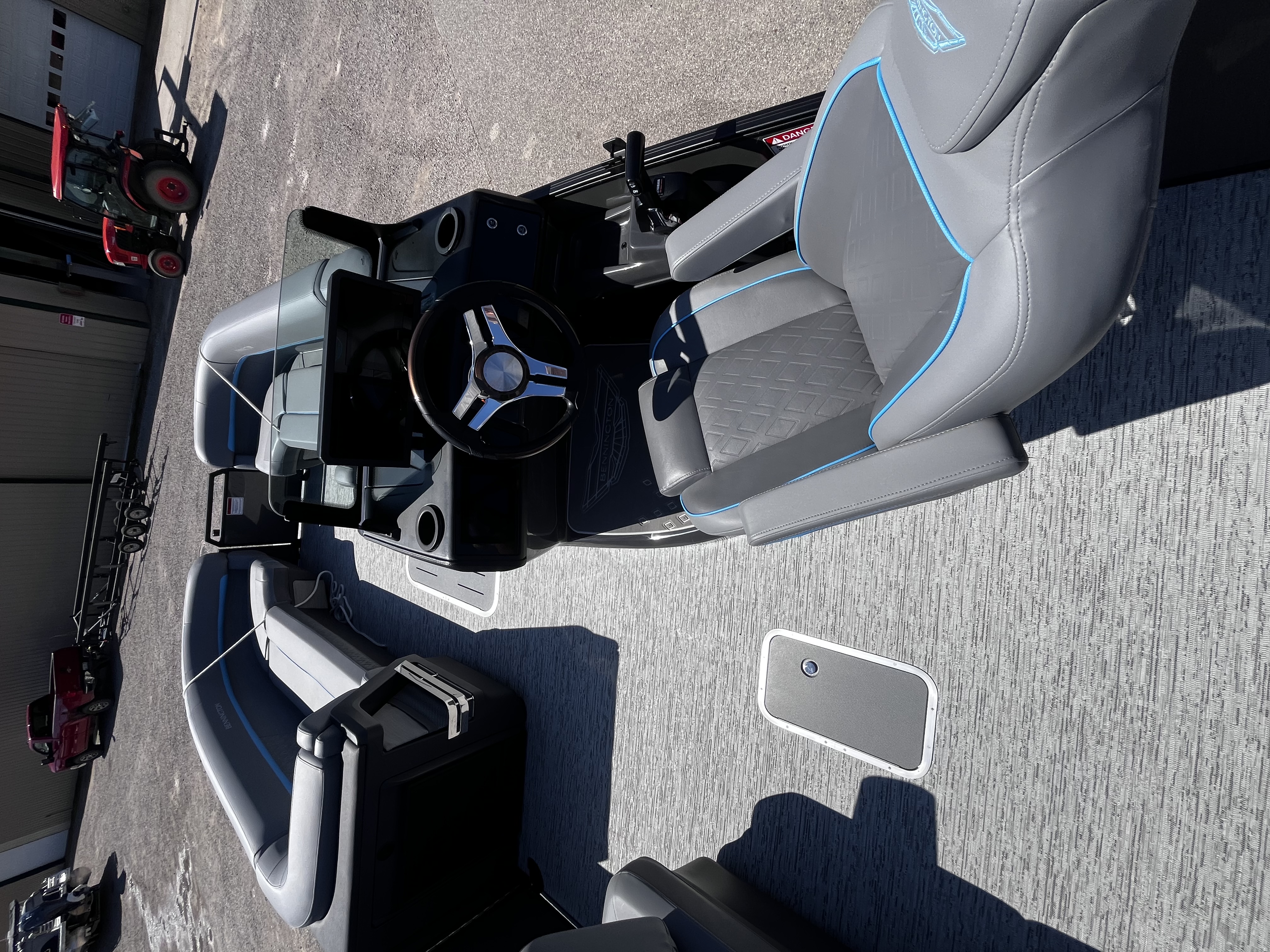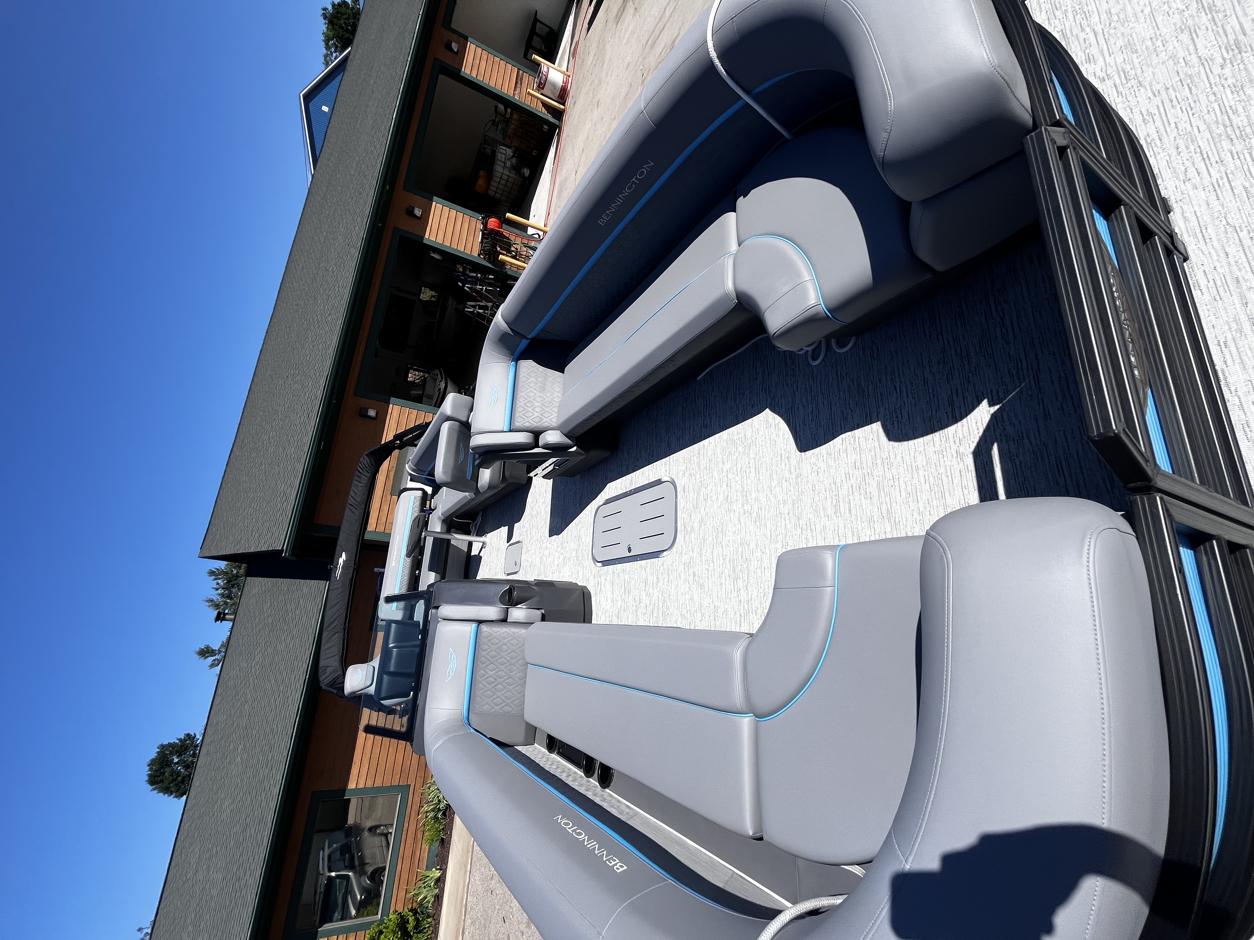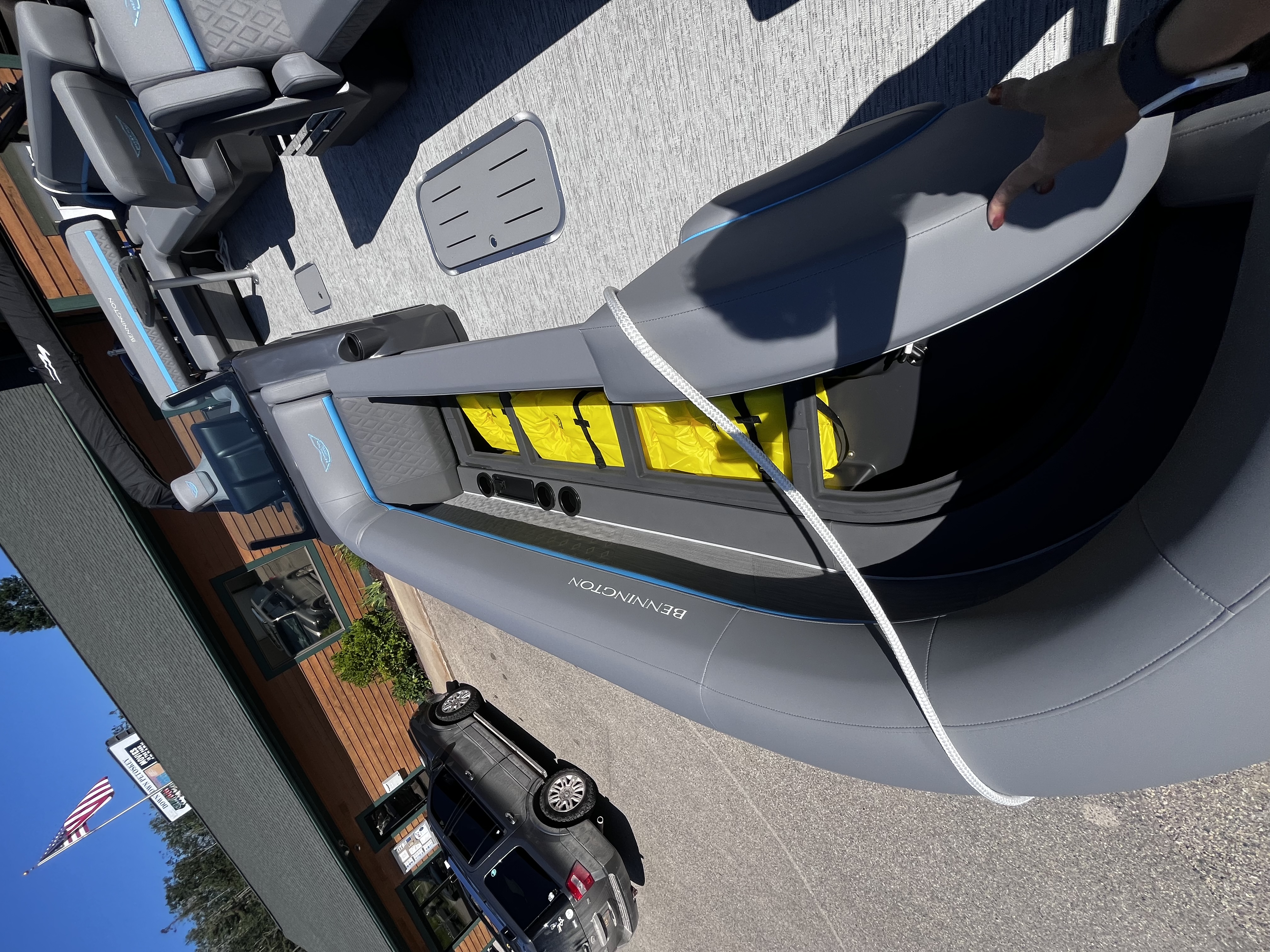 2025 Bennington 26ML L-Series Layout SPS tritoon (3- 25” tubes), smooth anthracite exterior with azure blue textured accent blackout luxe model, Yamaha 250hp VMax SHO outboard engine (VF250XB), black canvas, valencia gray vinyl flooring, veneto graphite upholstery with azure blue simtex accent, zebrawood slate matte trim accent, black/bronze luxe blackout wing logos, black heavy duty rub rail, M Series Luxe trim package, Garmin Vivid 7” multifunction display, elevated helm w/ mythos flooring, RGB speaker lighting, lumbar lighting, pop-up cleats bow & aft, SPS tritoon package, power assist hydraulic steering, center tube in-floor storage, dual battery system, 54” removable ski tow pylon. Rated for 13 people. 48 gallon center gravity tank. MSRP: $134,892. Our sale price was $106,228. Now Demo Sale price is $84,500