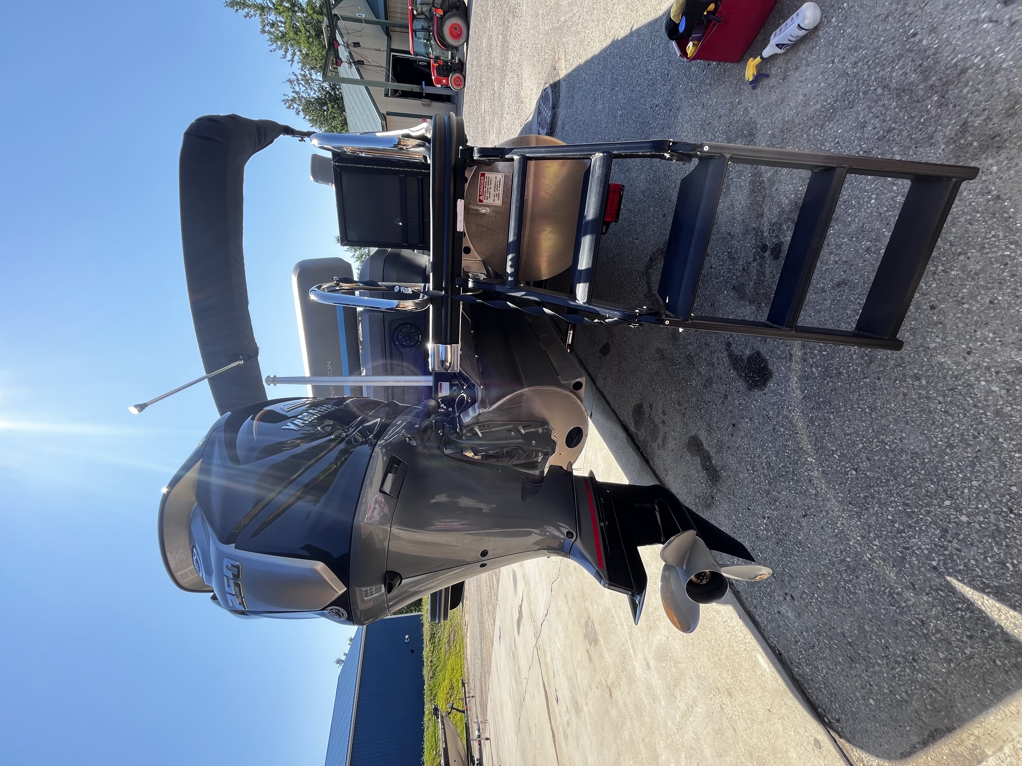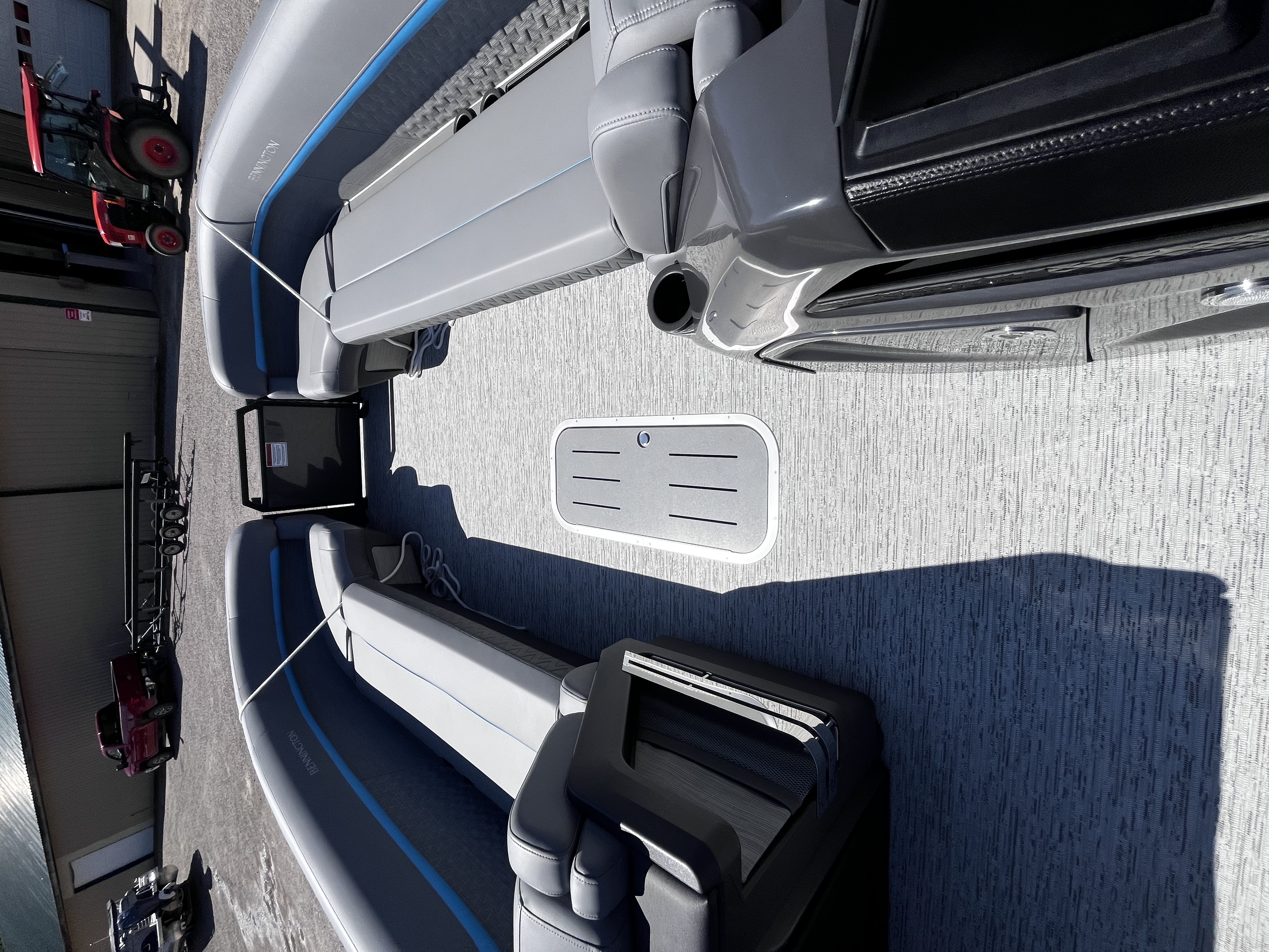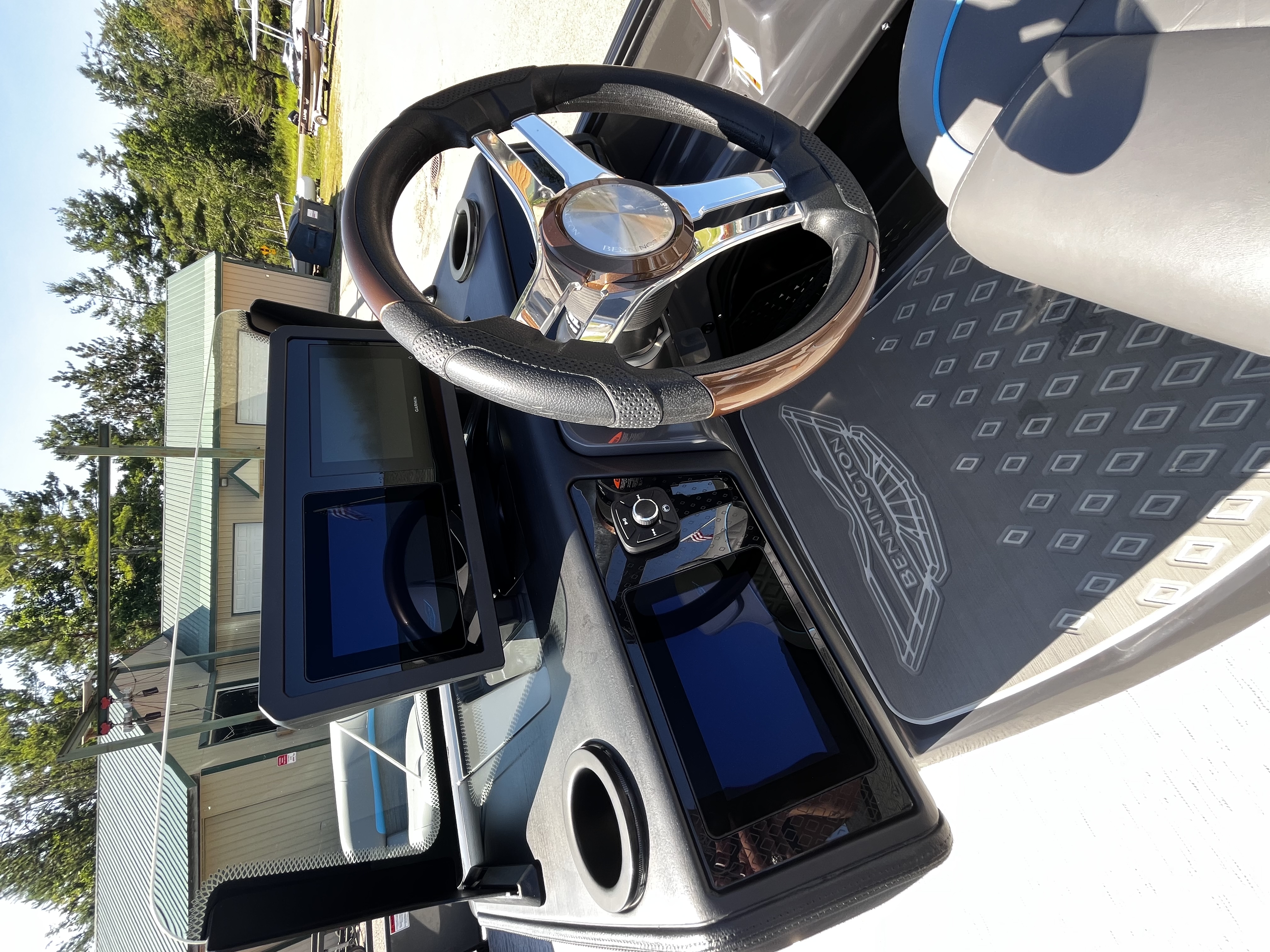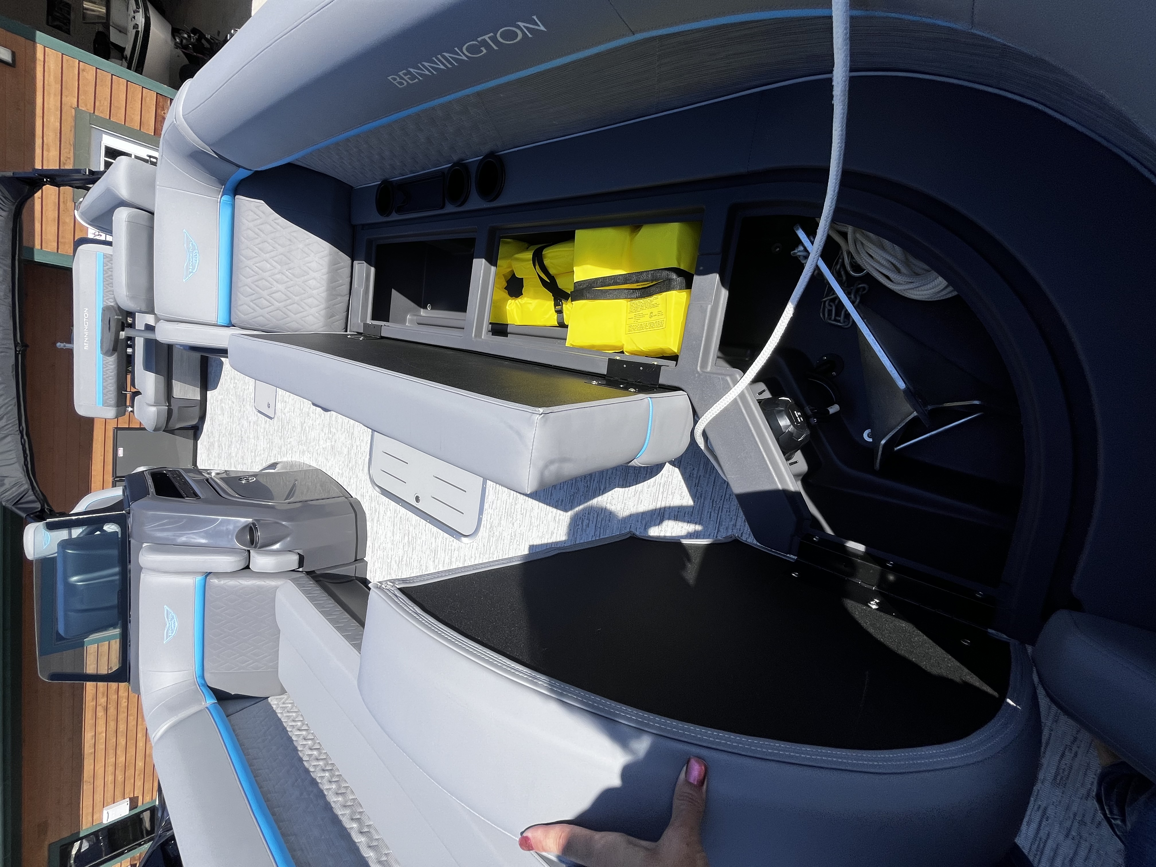 2025 Bennington 26ML L-Series Layout SPS tritoon (3- 25” tubes), smooth anthracite exterior with azure blue textured accent blackout luxe model, Yamaha 250hp VMax SHO outboard engine (VF250XB), black canvas, valencia gray vinyl flooring, veneto graphite upholstery with azure blue simtex accent, zebrawood slate matte trim accent, black/bronze luxe blackout wing logos, black heavy duty rub rail, M Series Luxe trim package, Garmin Vivid 7” multifunction display, elevated helm w/ mythos flooring, RGB speaker lighting, lumbar lighting, pop-up cleats bow & aft, SPS tritoon package, power assist hydraulic steering, center tube in-floor storage, dual battery system, 54” removable ski tow pylon. Rated for 13 people. 48 gallon center gravity tank. MSRP: $134,892. Our sale price was $106,228. Now Demo Sale price is $84,500