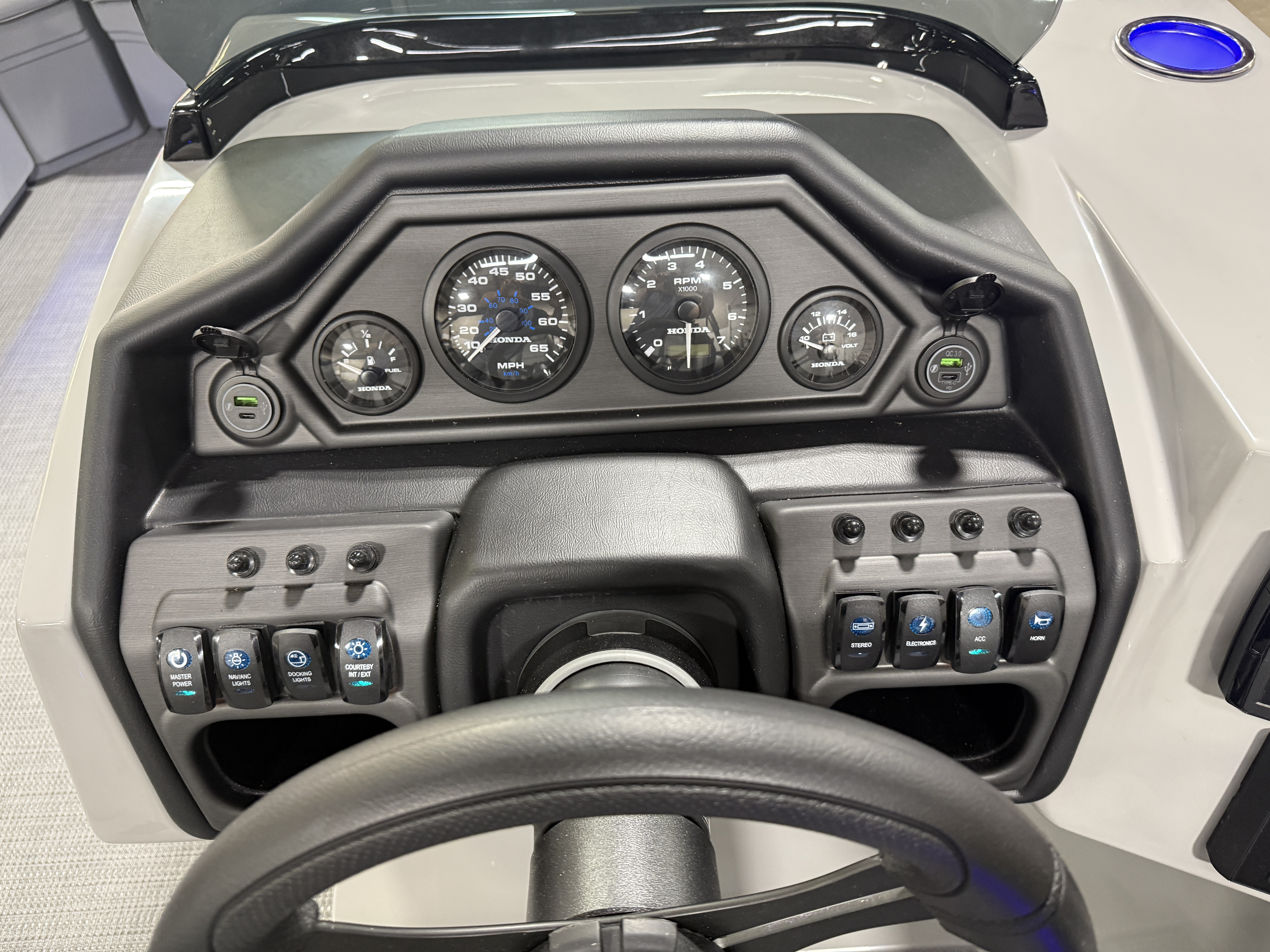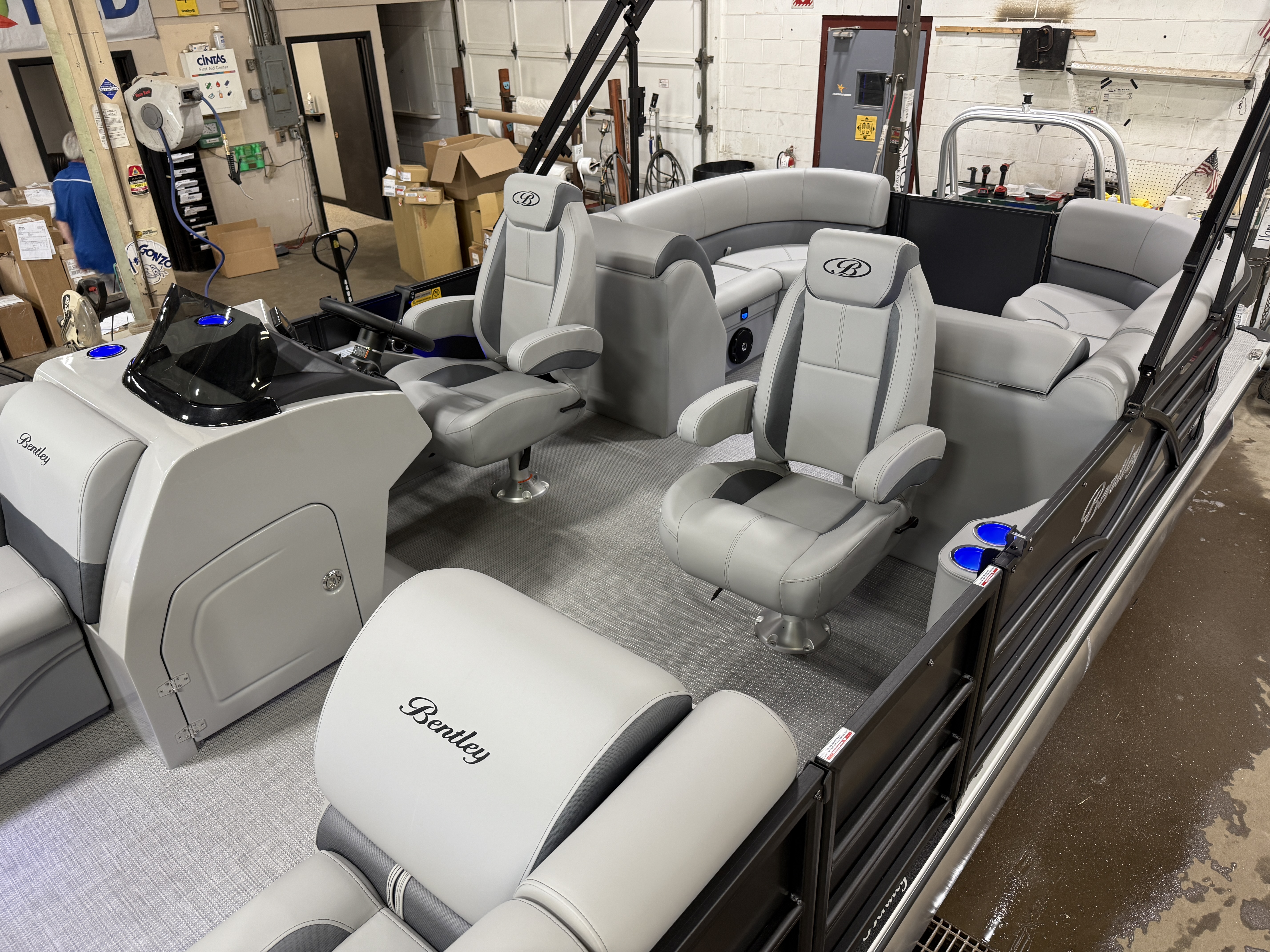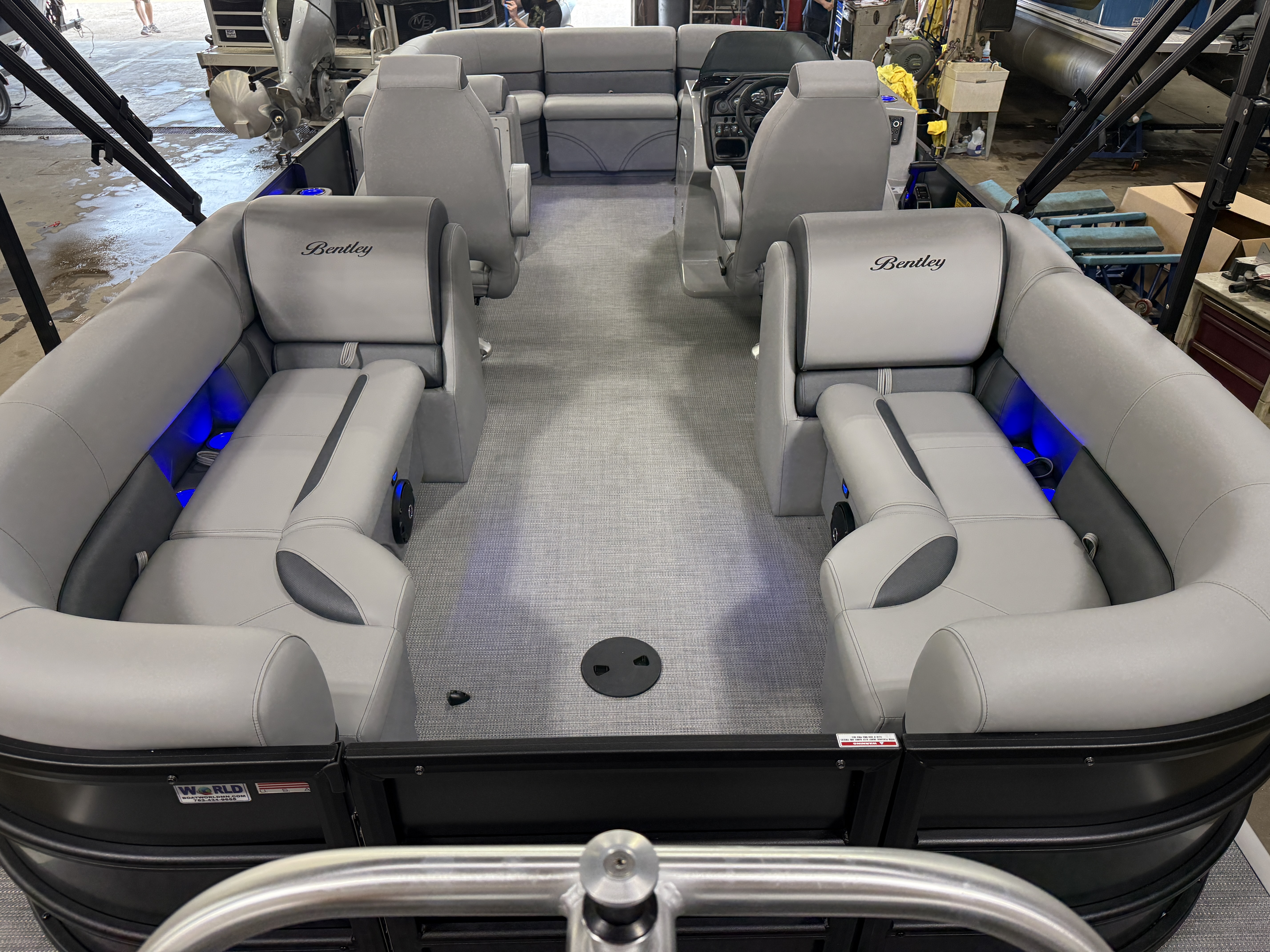 2025 Bentley 220 Navigator Quad Lounge Pontoon & Honda 4-Stroke EFI. This 22' Matte Black Walls Quad Lounger Has Front Chaise Lounge Seating With Storage, Two High-Back Reclining Captain's Seat, Two Chaise Lounge Seats In Aft With Storage, Interior Blue LED Package (Lighted Cup Holders & Courtesy Lights), Powder Coated Rails, Seagrass Vinyl Flooring, Livewell, Stainless Steel Flip Up Cleats, Humminbird Helix GPS & Depth Finder, Windshield, Ski Tow Bar, Bluetooth Radio w/4 Speakers, Table, Fiberglass Helm w/Storage, LED NAV Lights, LED Docking Lights, Built-In Cooler, Built-In Trash Can, Playpen Cover, Tilt Steering, Rear Ladder, Gauge Package w/ Hour Meter, 25" Tubes, New Battery, Bimini Top, Built-In 32 Gallon Gas Tank, Front And Rear Deck. Rated For 15 People.