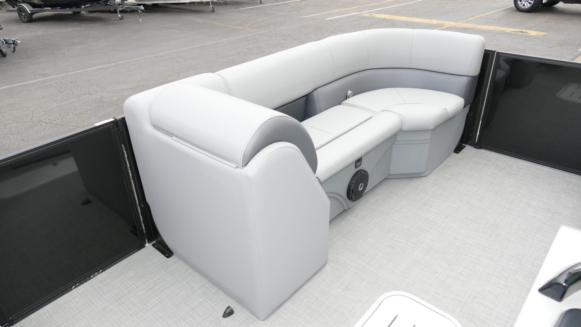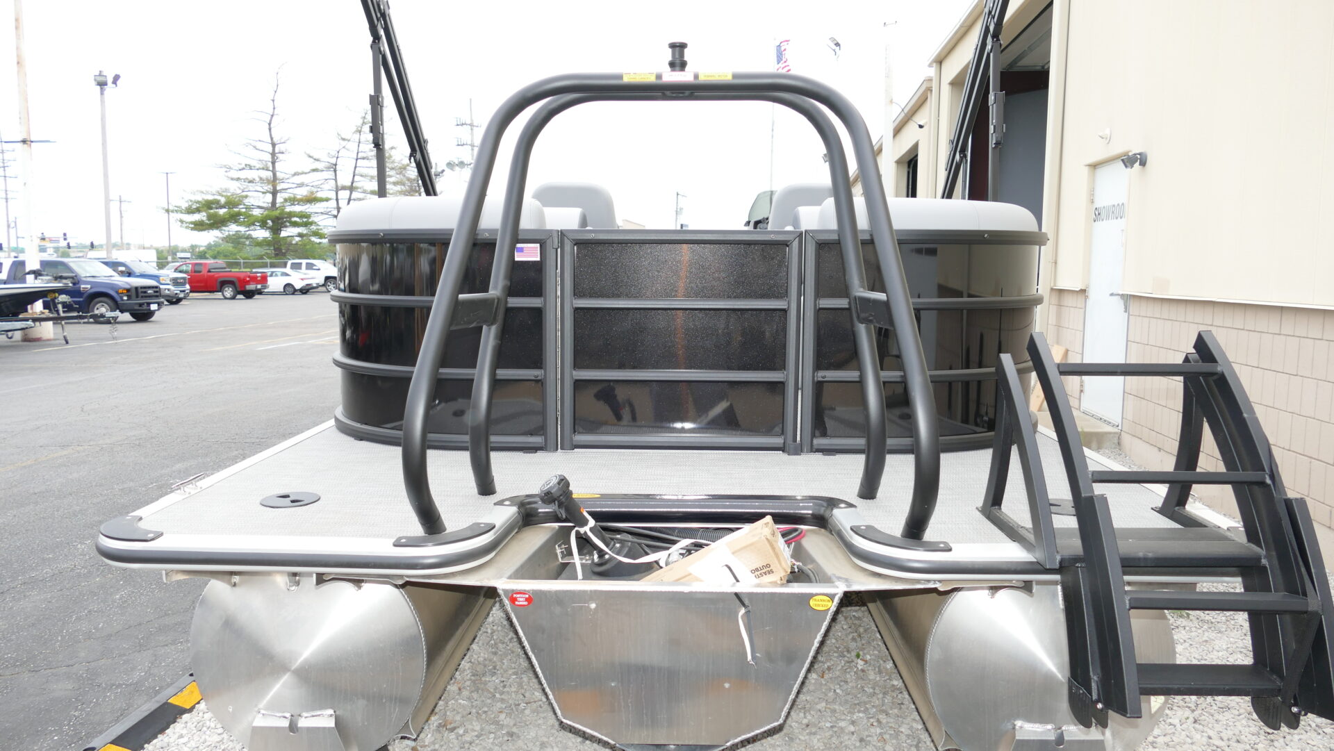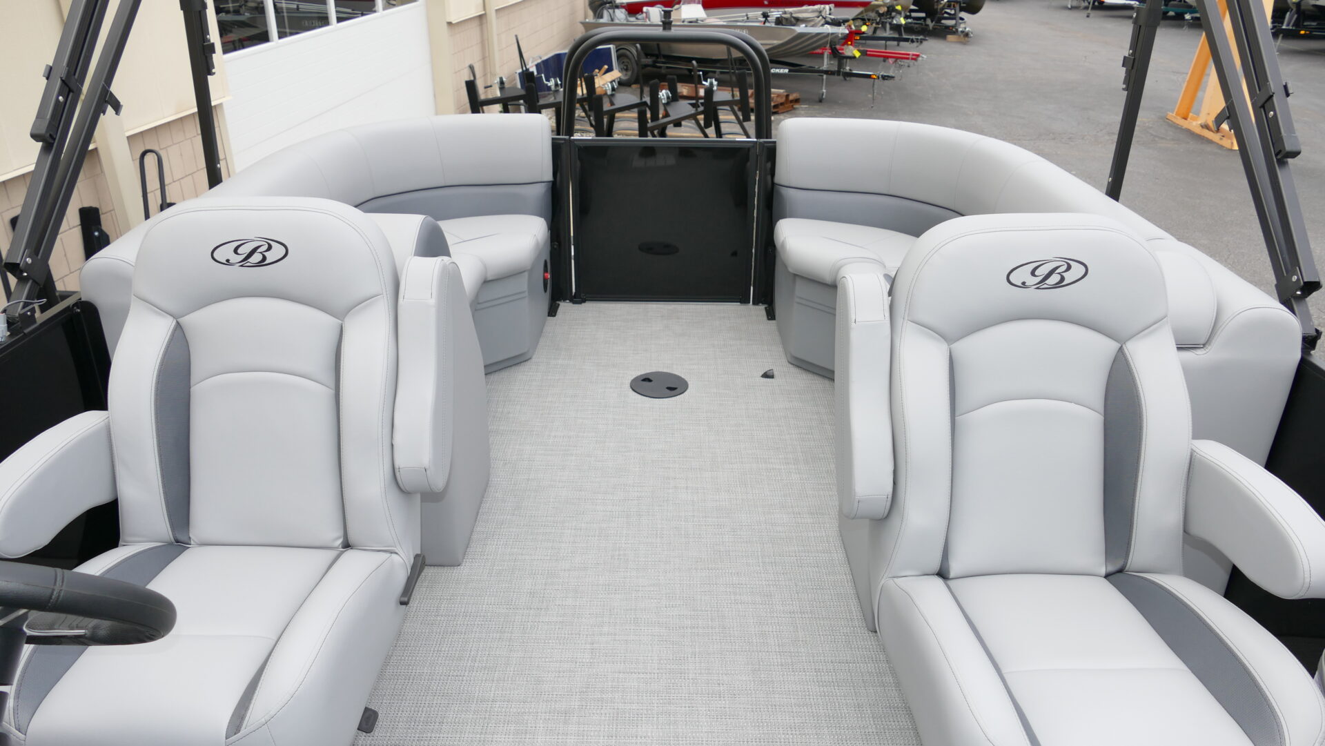 Exterior Colors : Black, Exterior Accent Color: Matte Black, Rail Color : Textured Black, Interior Colors : Gray, Flooring : Gray Seagrass Full Length Flooring. Honda BF150DLRA 4 Stroke, Sport Tri Toon Package: Lifting Strakes, Underskin, And Seastar Hydraulic Tilt Steering, SE Package Includes: Soft Touch Upholstery, Stainless Steel Cup Holders, Integrated Cupholders, In Floor Ski Locker, Ski Tow Bar, Windshield, 10′ Black Bimini Top Frame, Playpen Cover, Black Graphics Package, Aluminum Propeller, Installed Battery Cables With Cutoff, Honda Gauges, 1-24 Series Battery, Fire Extinguisher, Lifetime Plus 5 Year Warranty. Trailer Available For An Additional Cost.