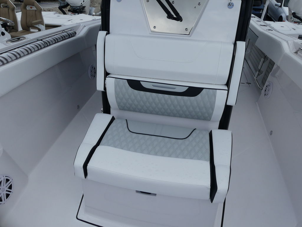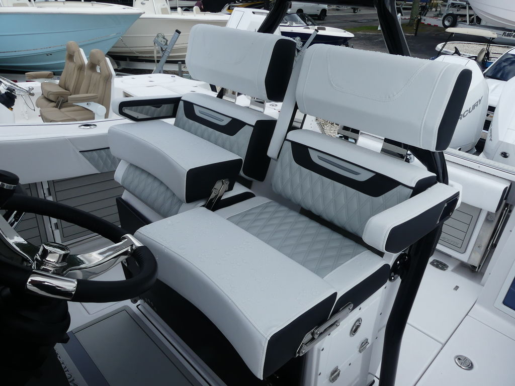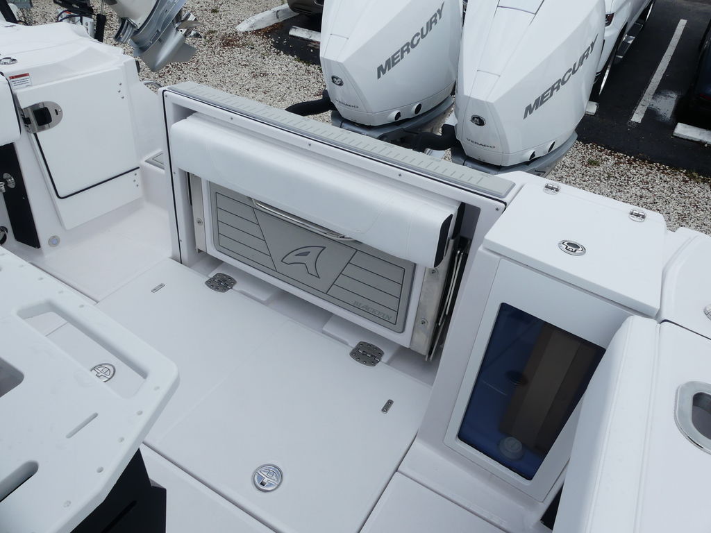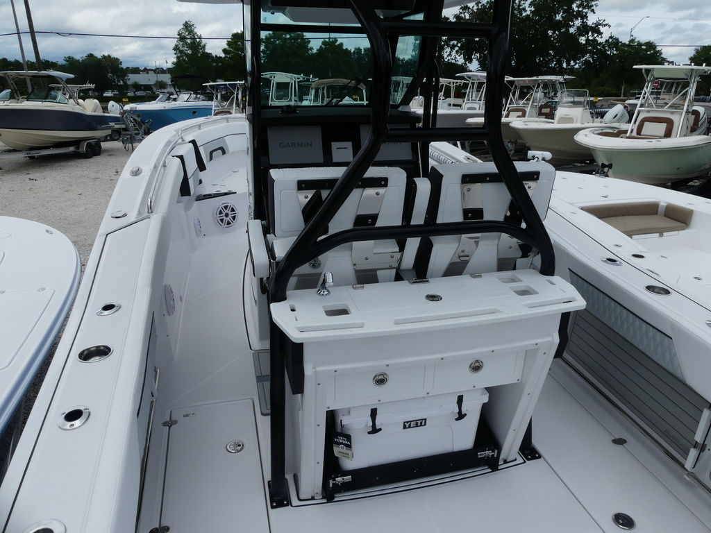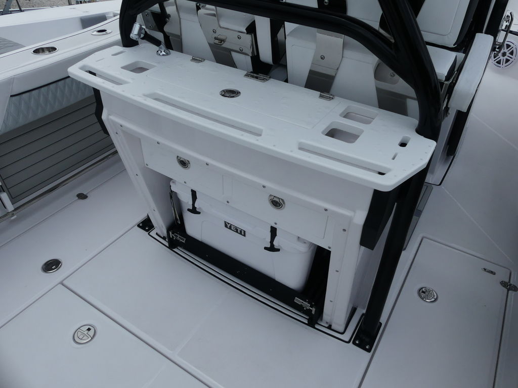 - Leaning Post, Fiberglass w/ Helm Seats & Flip-Up Bolsters, Pull-Out/Removable 45QT Yeti Tundra Cooler, Sink w/Fresh Water Pull-Out Sprayer, Bait Prep Station w/Cutting Board, Drink Holders, Storage Drawers (2), & Slide Out Tackle Utility Boxes (4)