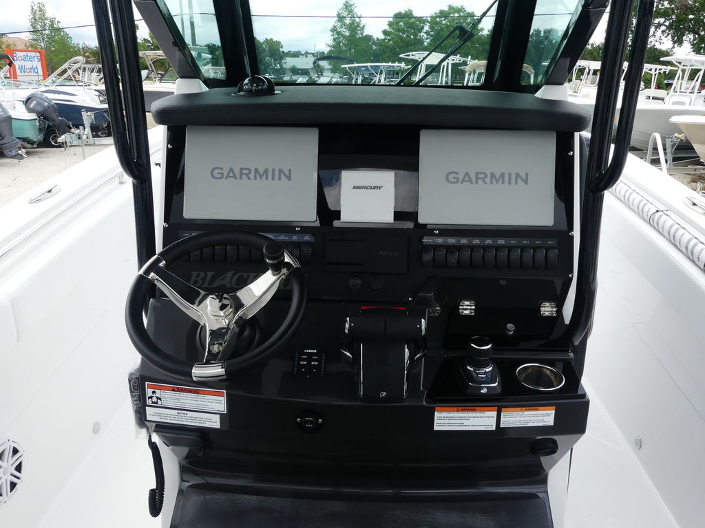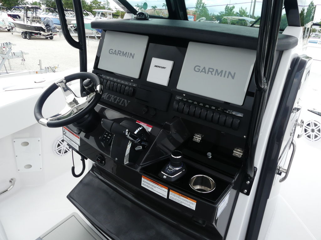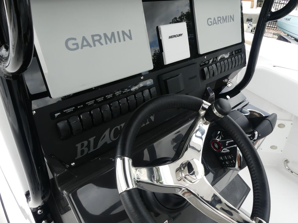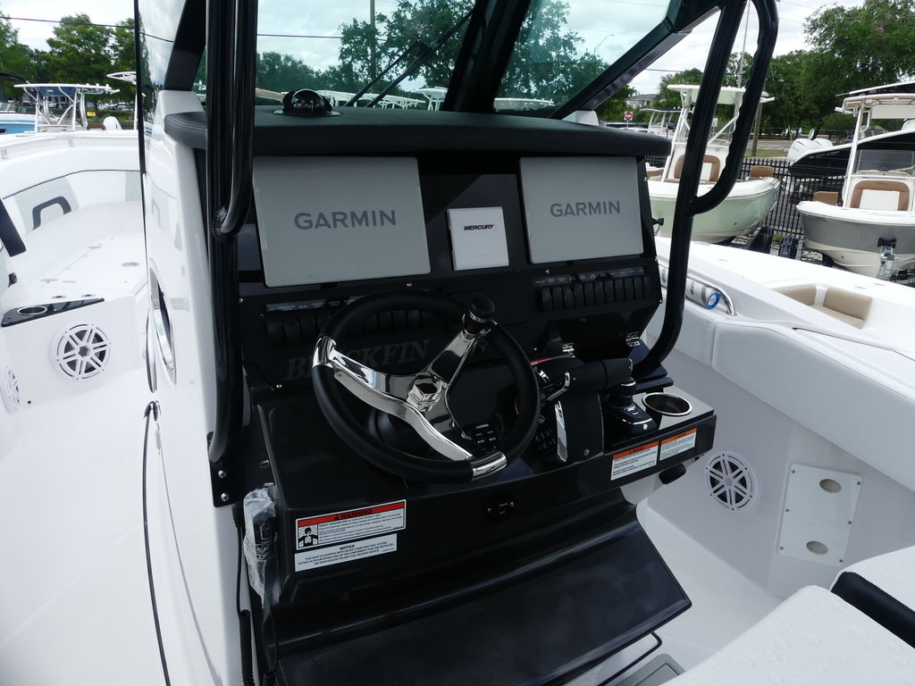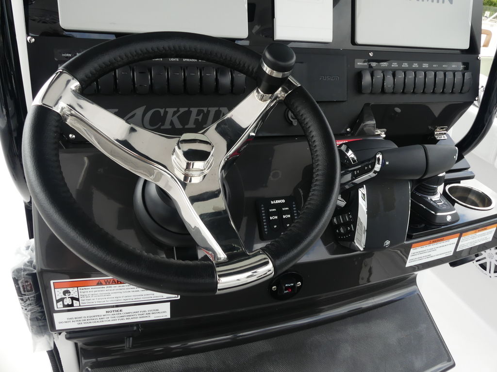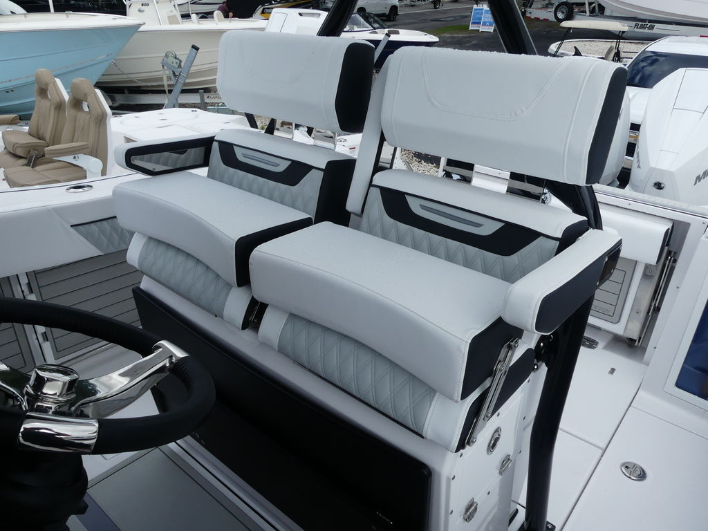 - Leaning Post, Fiberglass w/ Helm Seats & Flip-Up Bolsters, Pull-Out/Removable 45QT Yeti Tundra Cooler, Sink w/Fresh Water Pull-Out Sprayer, Bait Prep Station w/Cutting Board, Drink Holders, Storage Drawers (2), & Slide Out Tackle Utility Boxes (4)