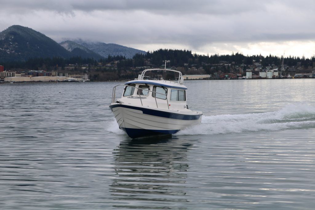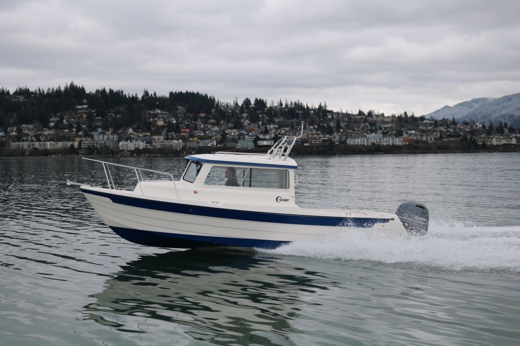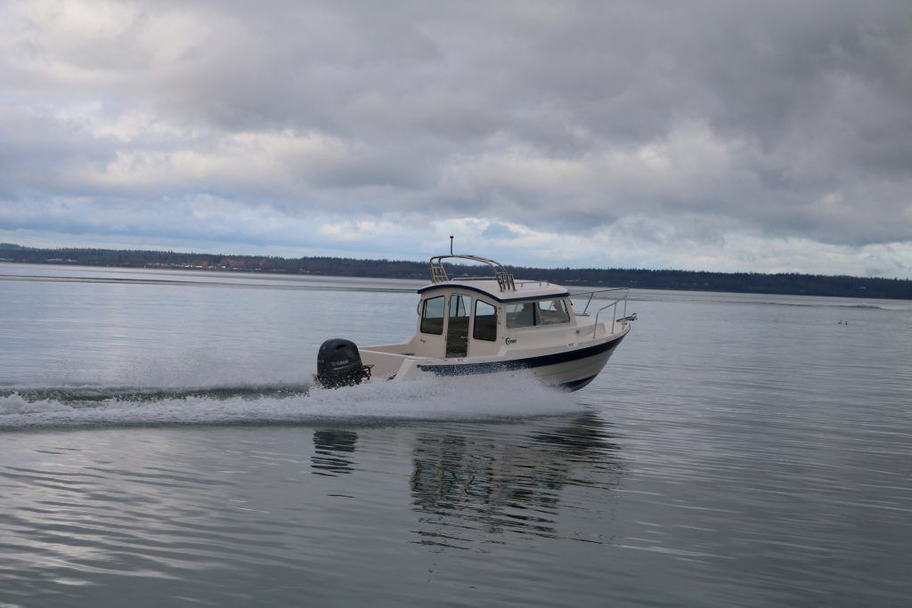 Although very similar to the classic C-Dory design, this new model features a deeper V, a little more deadrise and reverse chines to provide very smooth cruising in the open water. Maneuverability at speed is balanced and predictable, even in heavy seas. The boat holds her course with little effort. The hull’s flatness toward the stern with reverse chines greatly reduces the rolling motions, making cruising in rough water much more pleasant. And with only 8” draft and a thick bottom, she can easily be beached on sand for beach combing adventures.