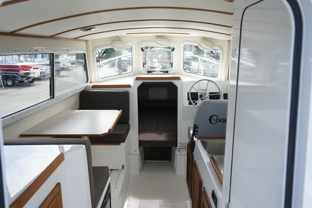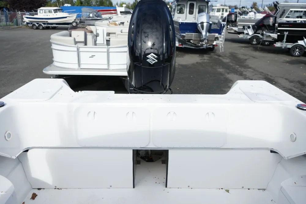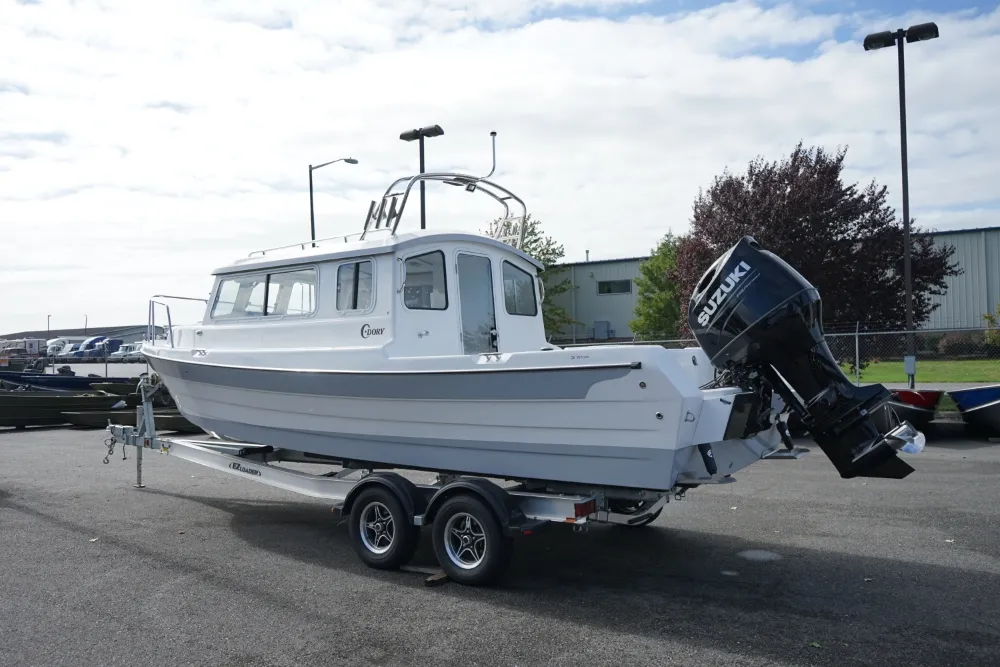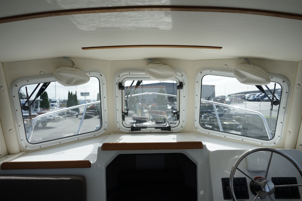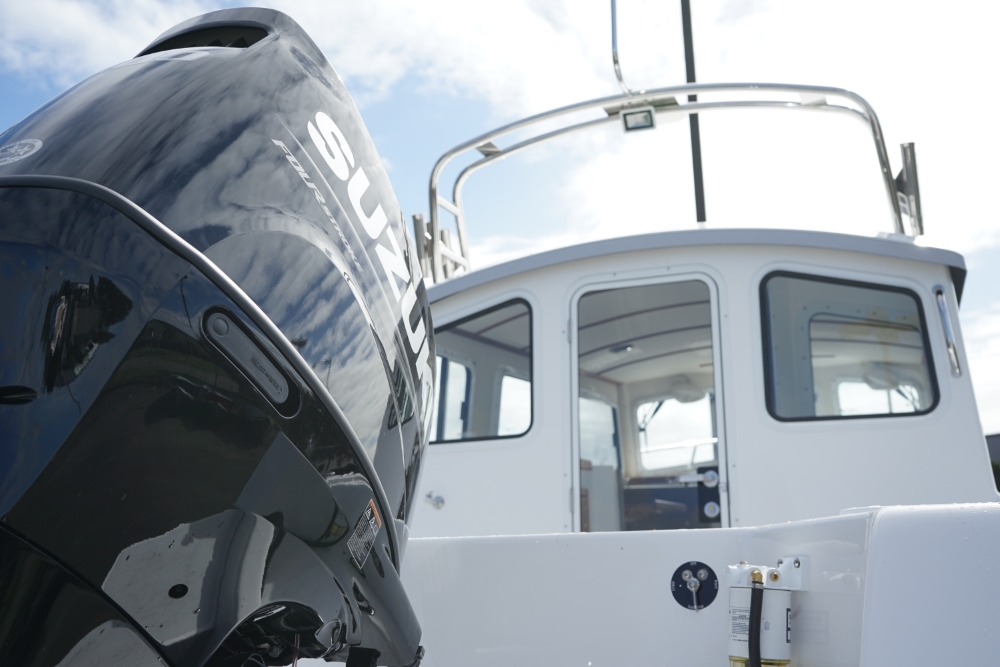 Maneuverability at speed is balanced and predictable, even in heavy seas. The boat holds her course with little effort. The hull’s near flatness toward the stern and reverse chines greatly reduces the rolling motions, making cruising in rough water much more pleasant. Fishermen will love the way the boat tracks at trolling speeds, allowing the focus to remain on the fishing. And with only 8” of draft and a thick bottom she can easily be beached or anchored for beach combing adventures.• Suzuki DF200ATX5 • Lewmar Pro 700 Windlass • LED Cockpit Deck Light • Macerator Discharge for Marine Head • Stainless Radar Arch with Rocket Launchers • Snap Curtains • Swim Step and Ladder • Wash Down Pump • Wallas Diesel Two Burner Cooktop/Heater • Kicker Bracket • Hydraulic Steering • Refrigerator • Shore Power • Trim Tabs • Electric Wipers • 12 Volt Outlet • Hot Water System • EZ Loader Trailer with Disc Brakes Master Marine Boat Center | To learn more about this listing, give us a CALL or TEXT at (360) 336-2176, email us at sales@mastermarine.com, or visit our website at mastermarine.com.