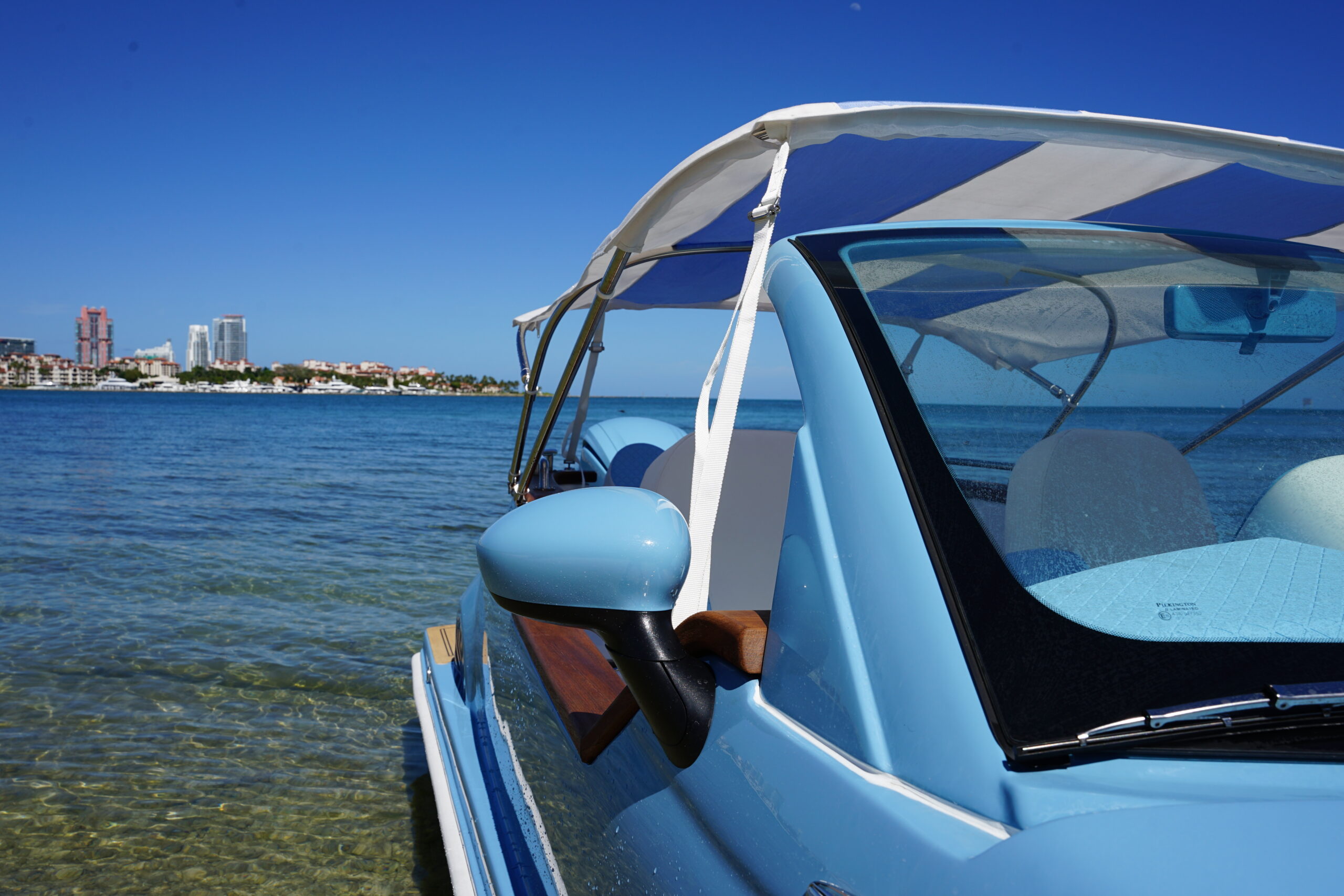 a clean classic style model with features inspired by the Fiat 500 Italian style icon. The project successfully combines luxury, efficiency, style and comfort. The natural curved lines and the absence of straight lines, offer a dynamic movement and a unique character to the design. Thus combining the beauty of boating with the comfort of driving on the road.