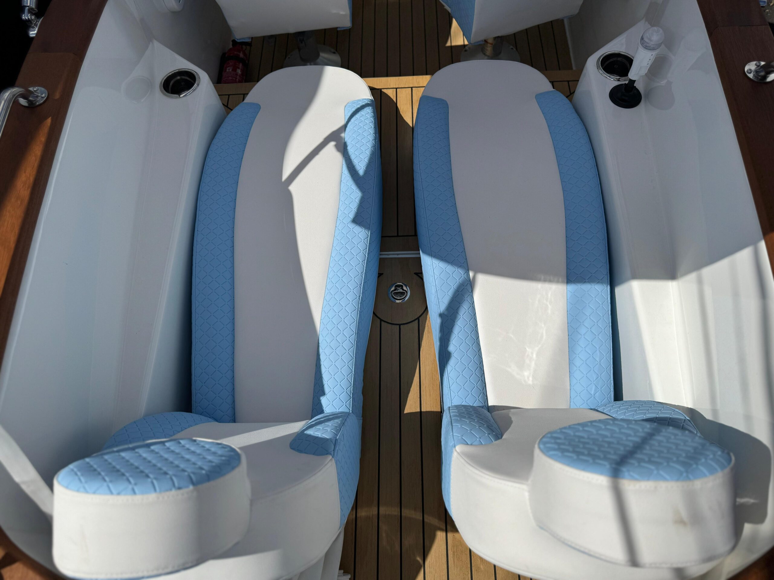 Every piece of the Sky interior, to the Waterjet stainless steel seats and from the steering wheel to the speakers and switches, is specially designed and handcrafted with attention to detail. The details of the dashboard, the on-board indicators offer a functional and comfortable cockpit to drive. The handrail and the teak flooring create a perfect chromatic combination, on which two completely handcrafted Chaise-longues stand out.