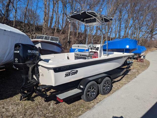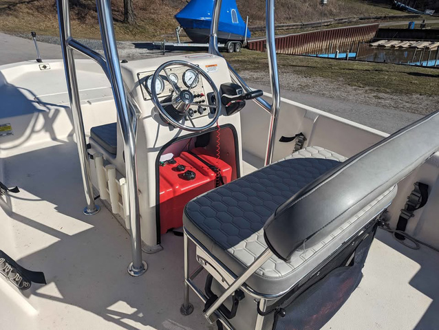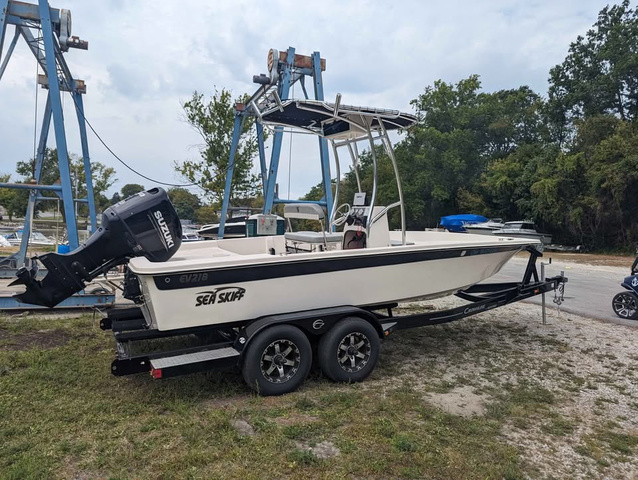 BEHOLD! A SLIGHTLY USED CENTER CONSOLE. The rarest of boat species. Only a few sightings each year. Aluminum ultra durable T-Top frame, Simrad GPS/Depth/Fish Finder & Transducer all added on to boat. Substantial additions to consider when shopping for price. T-Tops on this boat easily cost an extra $5k at least. Carolina Skiff's 21' 8" Sea Skiff center console. Includes new Go 9 Simrad touch screen with fish finder. A skiff with a deep V design, perfect for the Lagoons and Rivers of Ohio with the ability to still run well out on the Great Lakes. We rented this one out for half a year alongside a smaller version of the same boat, we can say on good authority that this boat can handle any chop you would consider boating in. In fact, these Carolina Skiff hulls are renown for their remarkable durability. Suffice to say that this boat will put up with anything any passengers could ever even consider boating in. It is equipped with 140HP Suzuki and hyd. tilt steering and beautiful black hull side color. Of course equipped for fishing and trolling - its a Carolina Skiff! Includes 70 quart cooler and rod holders. Contact anytime to discuss this slightly used EV218 or any other Carolina Skiff Models ranging from 16' to 35' Sea Chaser blue water center consoles. Covered with confidence by Carolina Skiff's best in class 10 year warranty program. Dare to compare! The value and build quality is unparalleled. Everything a Boston Whaler can do for a fraction of the price. Built here in the United States. Get ahold of us today to schedule a test drive!