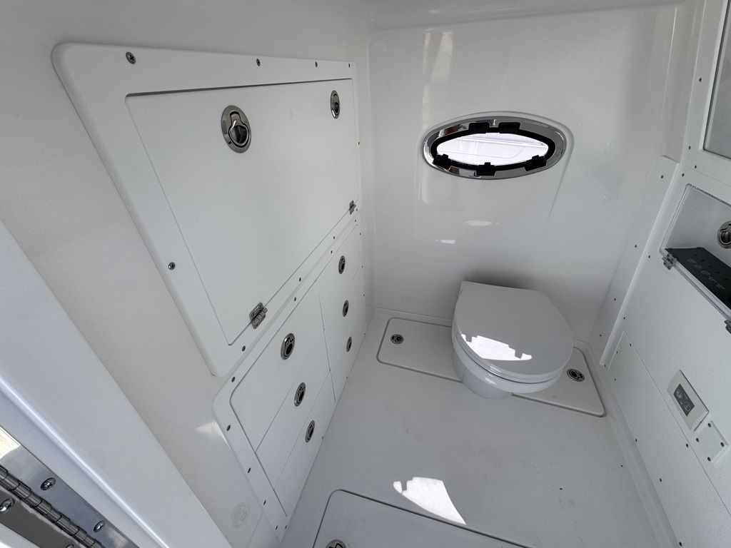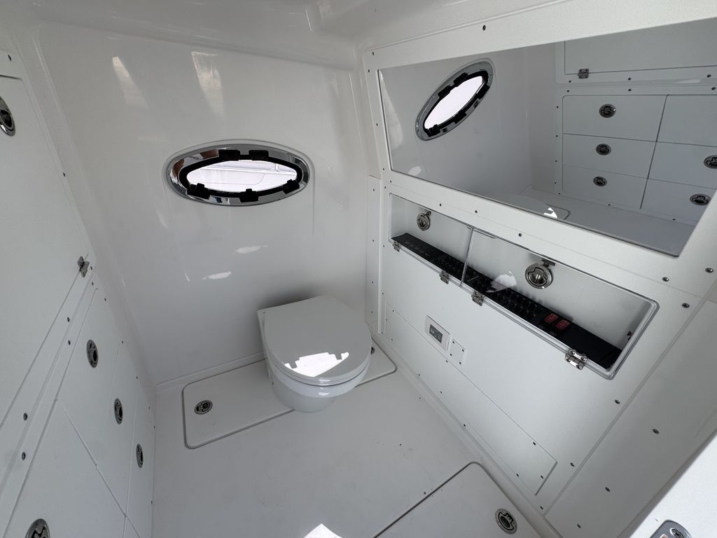 The 34 CT won’t know or understand boundaries and will be ready to take anything Mother Nature throws its way. With the double stepped, semi-asymmetric hulls and plenty of bow flair, you can fish in comfort through water you’d never brave with another center console in its class. The 34 CT contains six insulated plumbed storage boxes, totaling 3,000 qt of storage connected to macerator pumps. With two storage compartments forward, two mid-ship, and two in the cockpit floor, you can choose where you want to utilize the space for storage versus fishboxes. A 70 gallon transom livewell is standard, with options to add two 25 gallon live wells alongside, as well as plumbing the two after insulated storage boxes as livwells, for a total of 5 bait tanks all fed by a Hooker sea chest and Hooker electric pumps.