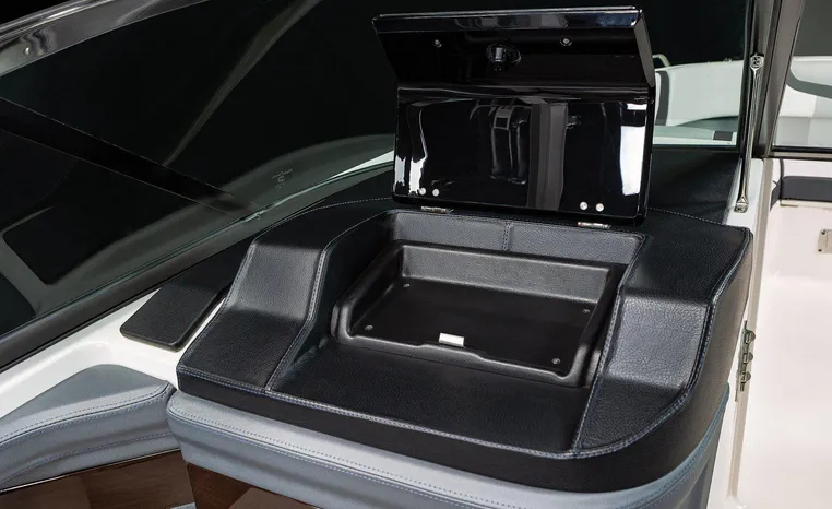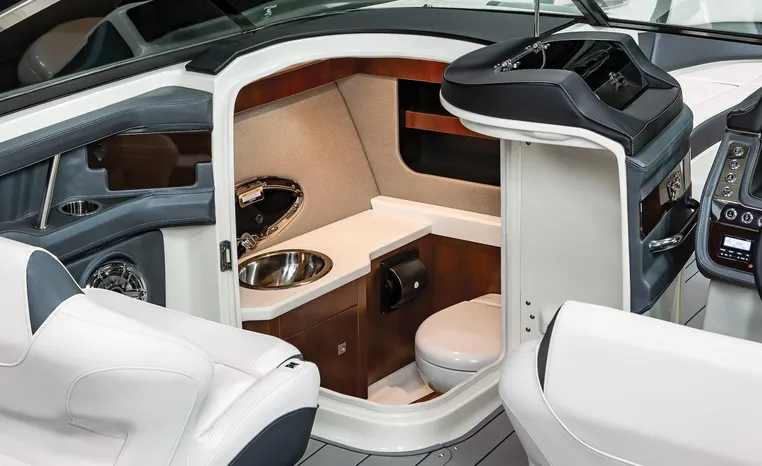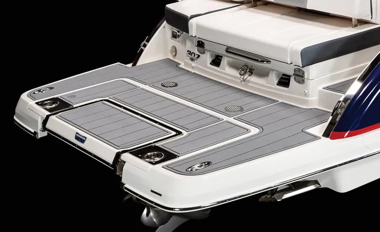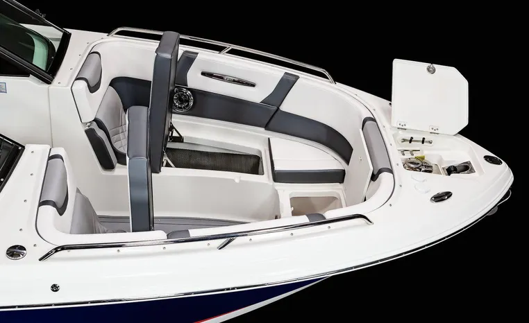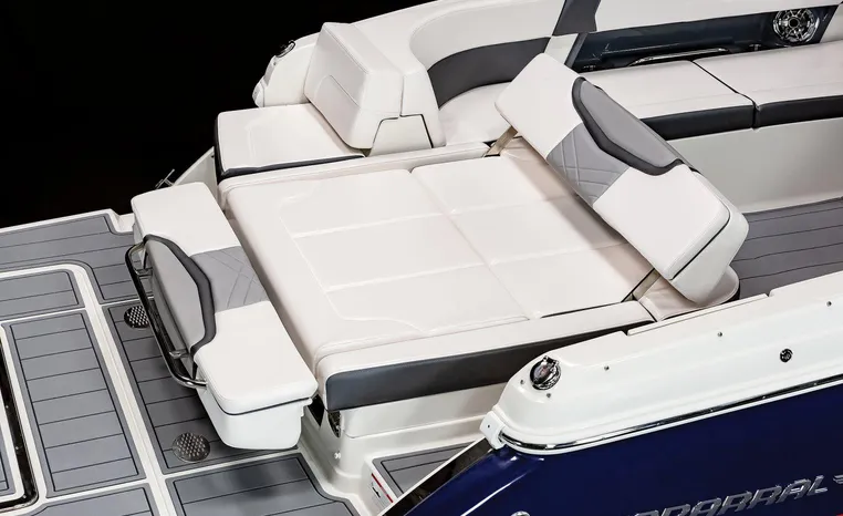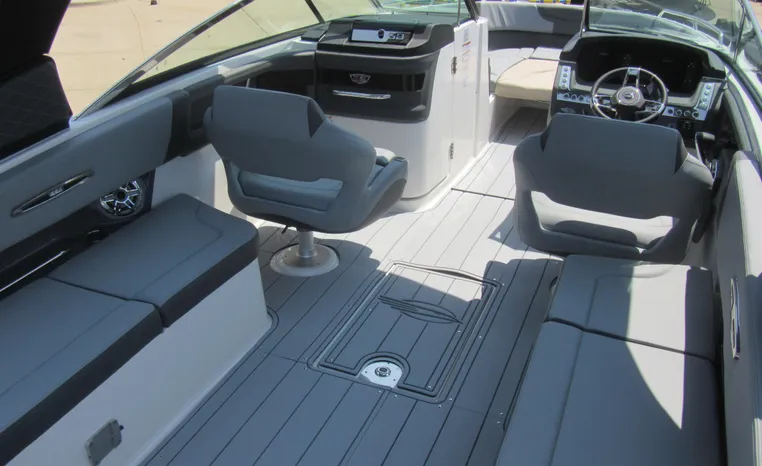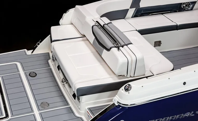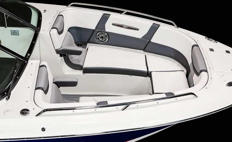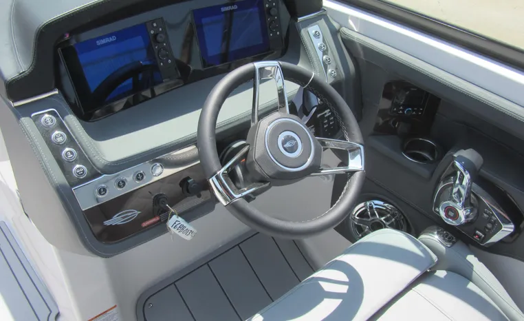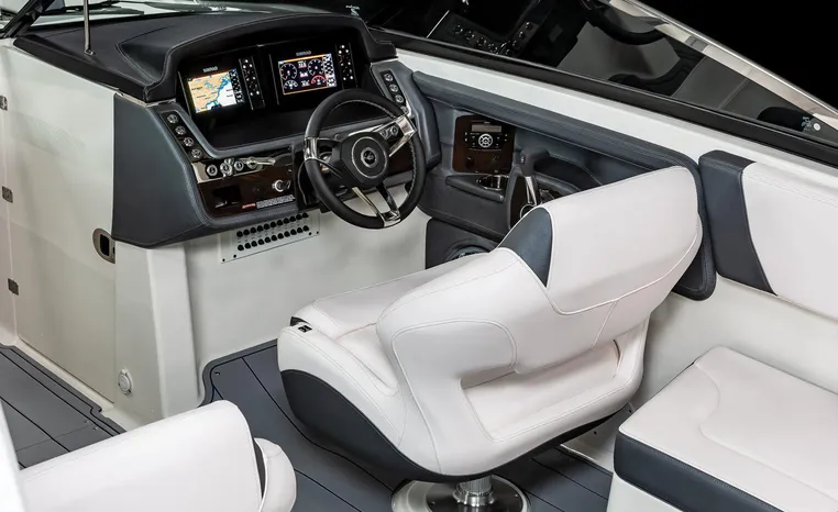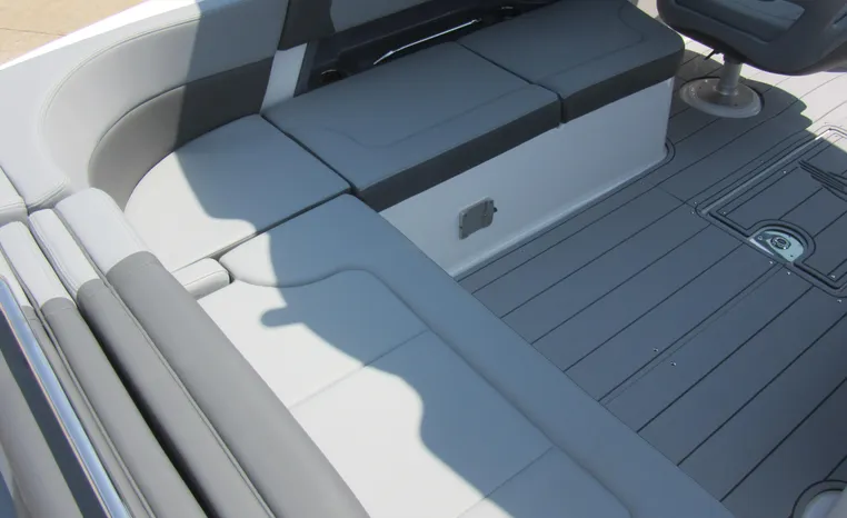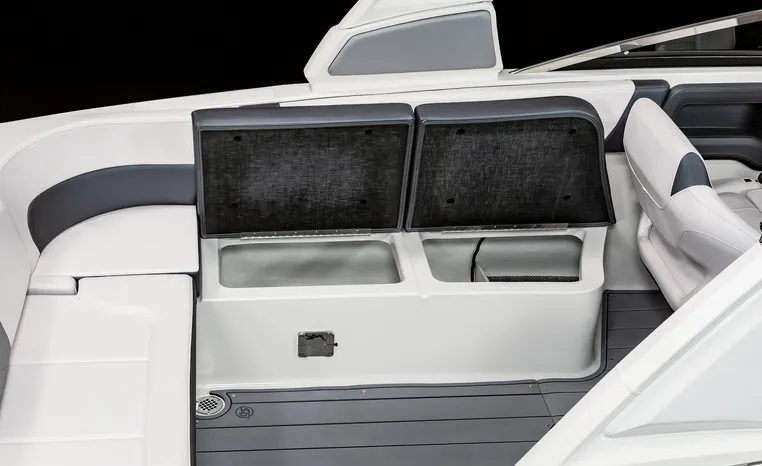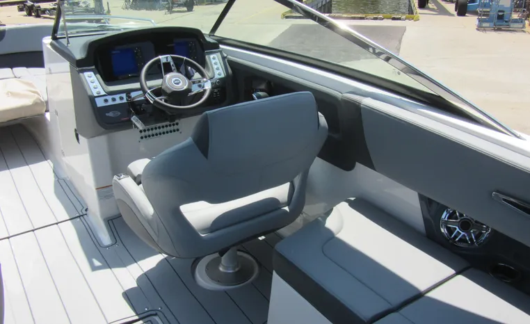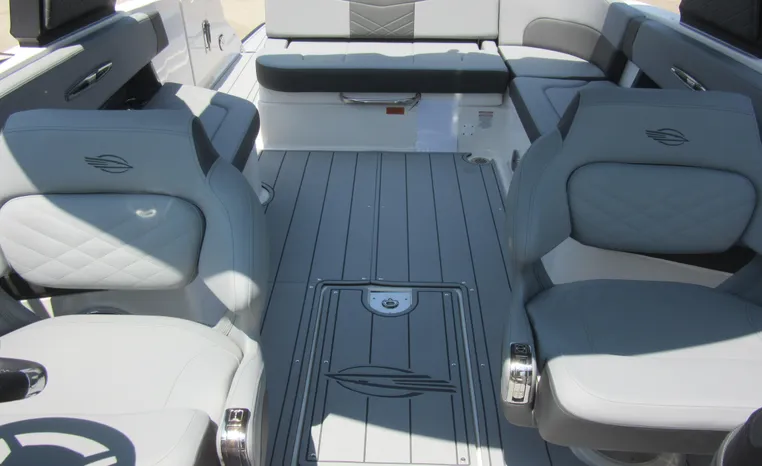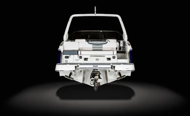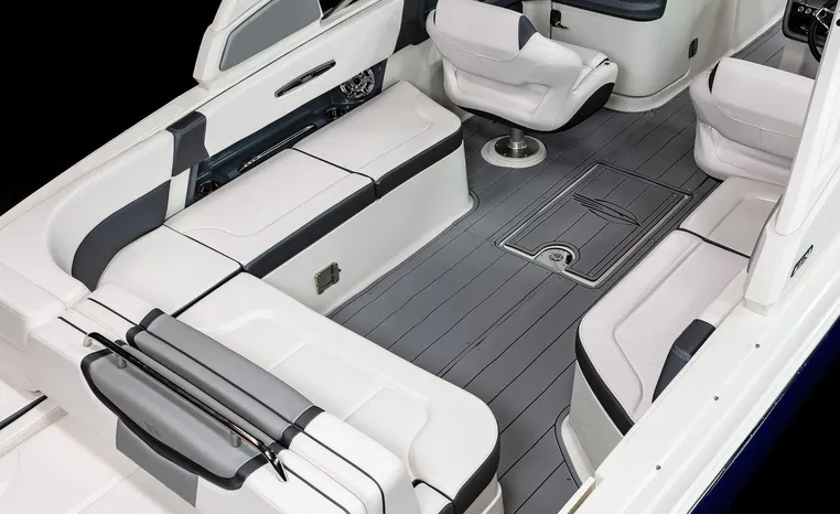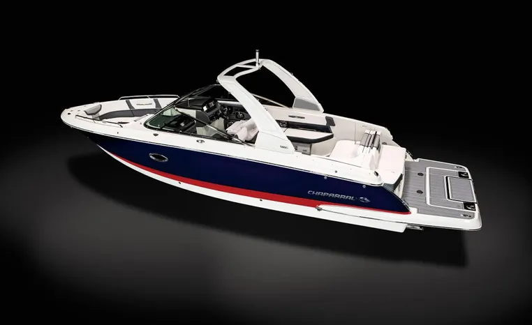 The 307 SSX is a leader in design, performance, and function. The helm features an all-new glass dash with dual touchscreen displays. The cockpit is open, and spacious and features a multi-position sun lounger aft. The 9' beam means the cockpit is wide open all the way to the bow area which features hinged storage beneath luxuriously appointed upholstery. The standard Infinity Power Step swim platform makes watersports setup a breeze. Chaparral went to great lengths to create a powerful and agile craft that glides through the water with minimal noise.