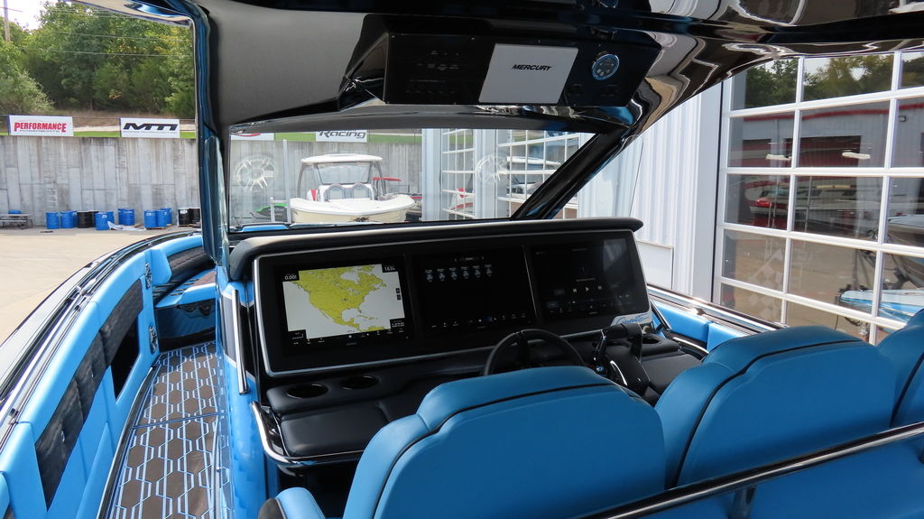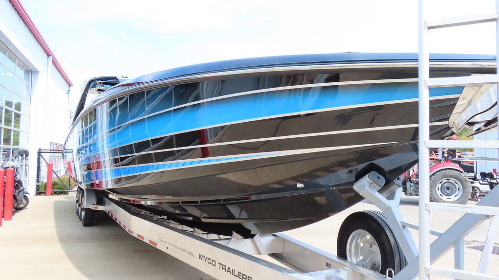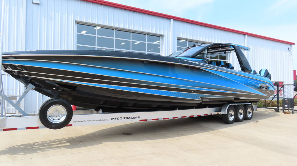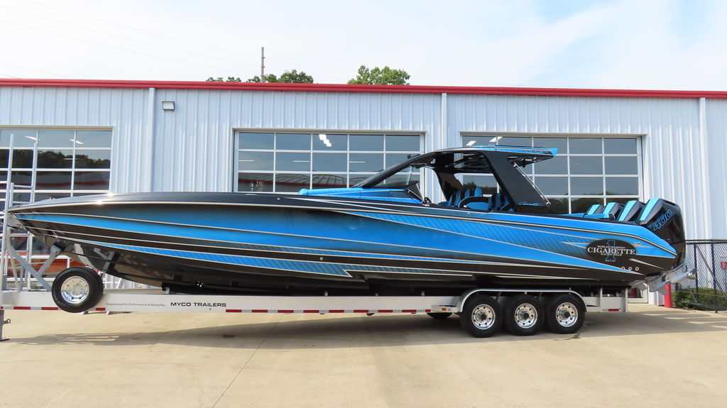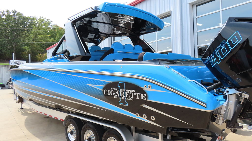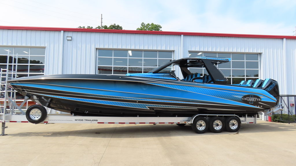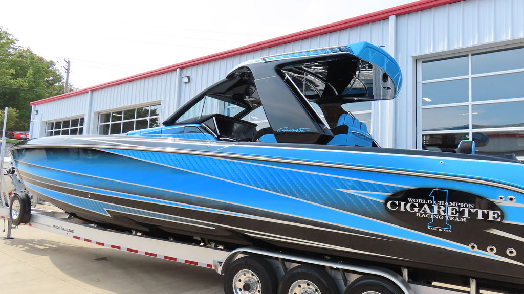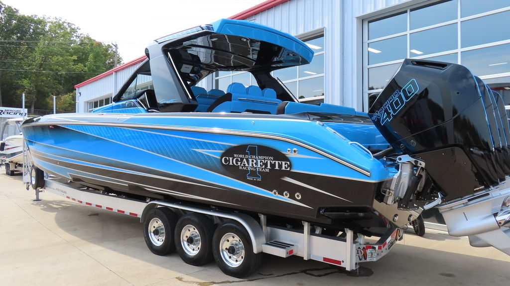 2025 Cigarette 41 Nighthawk powered by quad Mercury Racing 400R V10s. (ONLY 10 HOURS), upgraded second row of Bolsters, (3) Garmin GPS with C-Map switches, Mercury Vessel View 903, electric battery switches on dash, soft touch vinyl, HyrdaFoam Flooring, bow thruster, Rear facing seat behind bolsters, Cigarette JL Audio upgrade, power rear sunshade, Garmin convenience package, windlass anchor, dive door, port and starboard fender storage and trash receptacles, cabin sink, vacu flush head, shore power, and onboard charger, Automatic Sun shade, Aluminum Triple axle Trailer Included.
