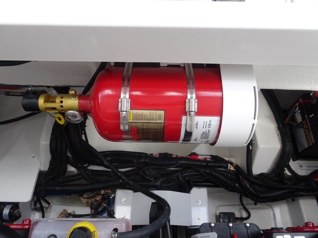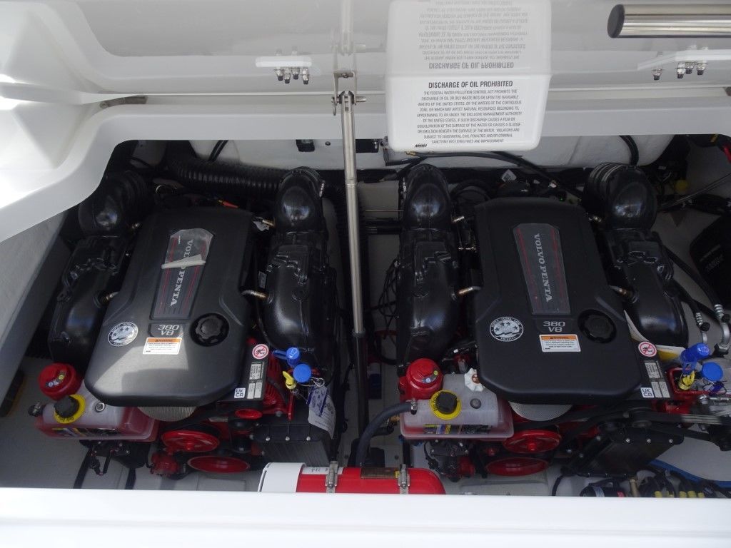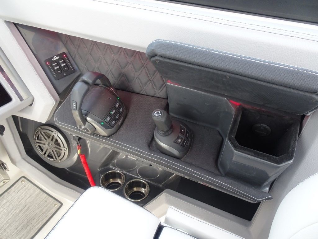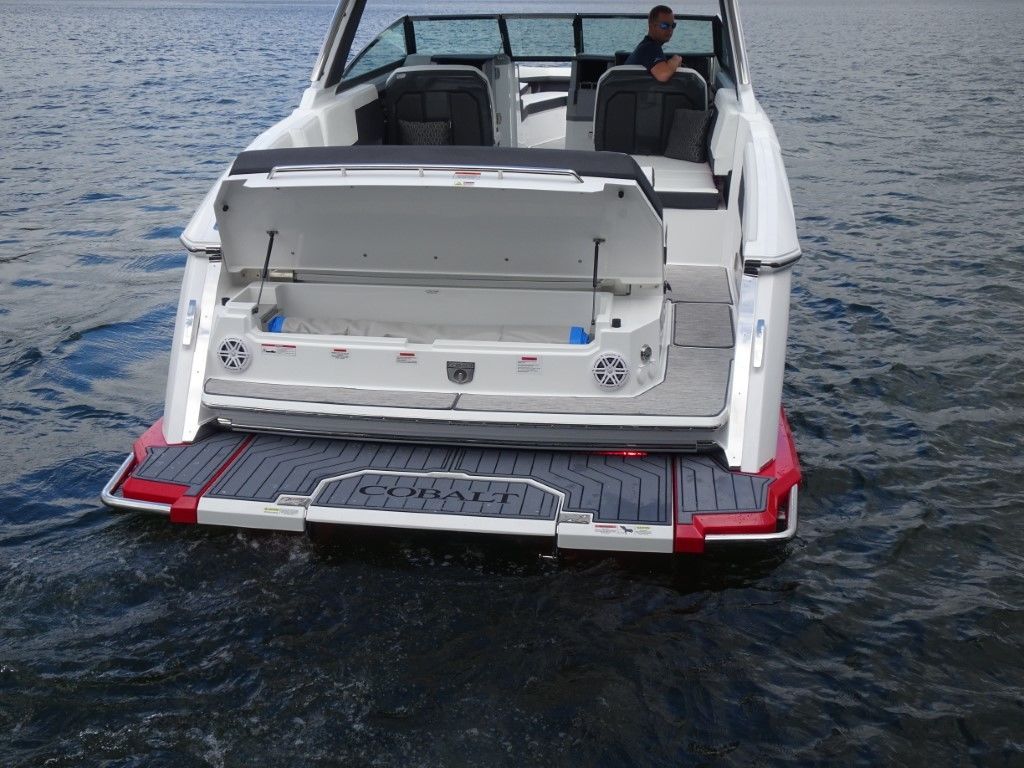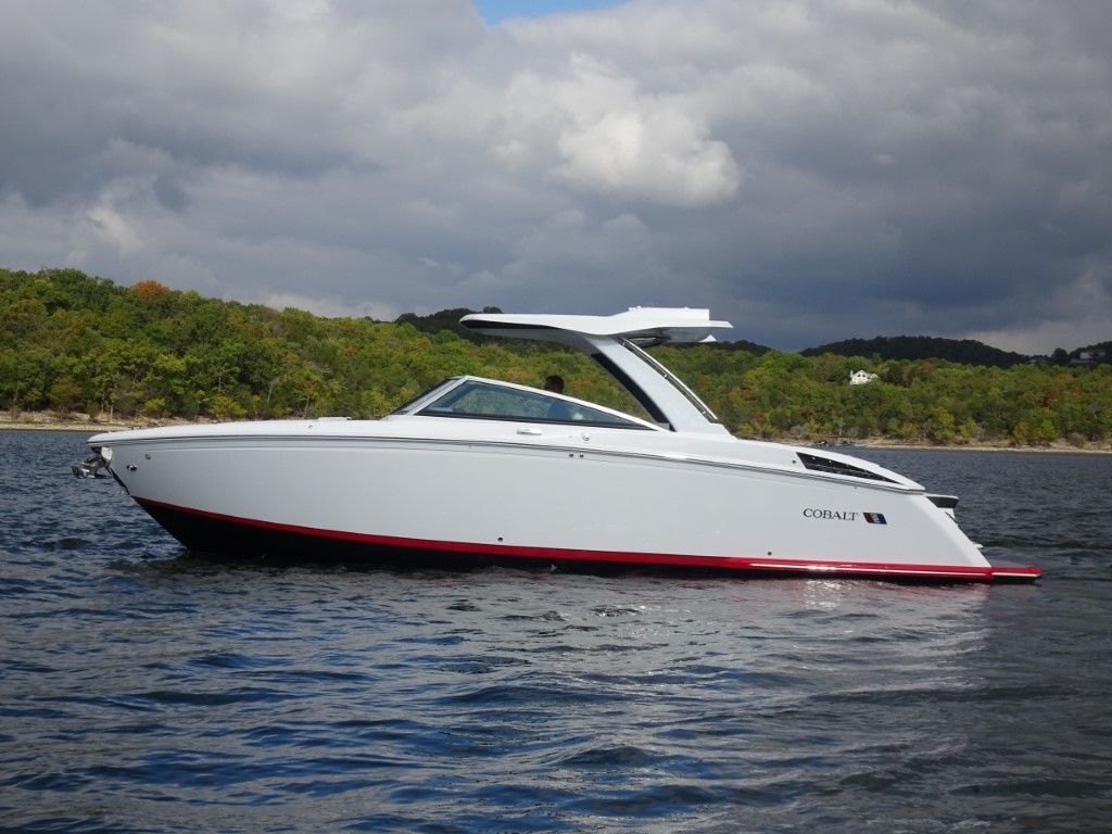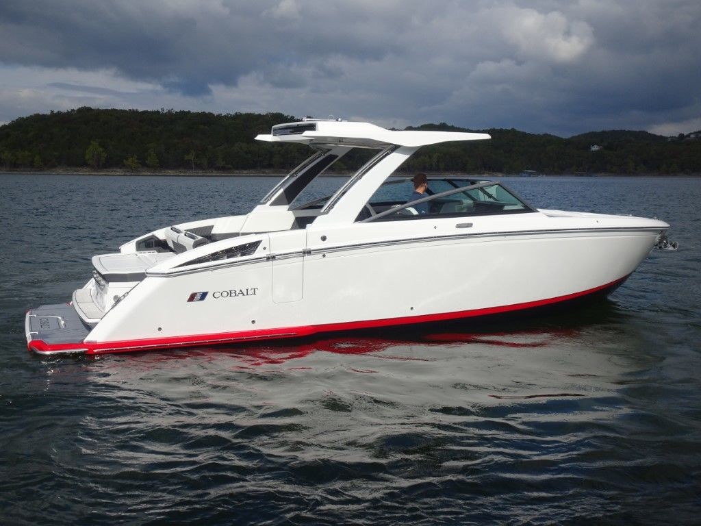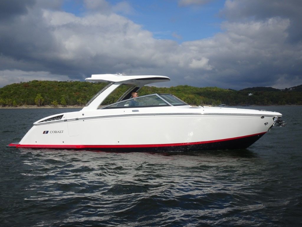 This is a new 2025 Cobalt R33 in Accent Stripe KO Red w/Rich Ebony bottom and Summit/Frost Interior. It is powered by twin Volvo Penta 380hp Dual Prop's w/joystick. It also has the following options: