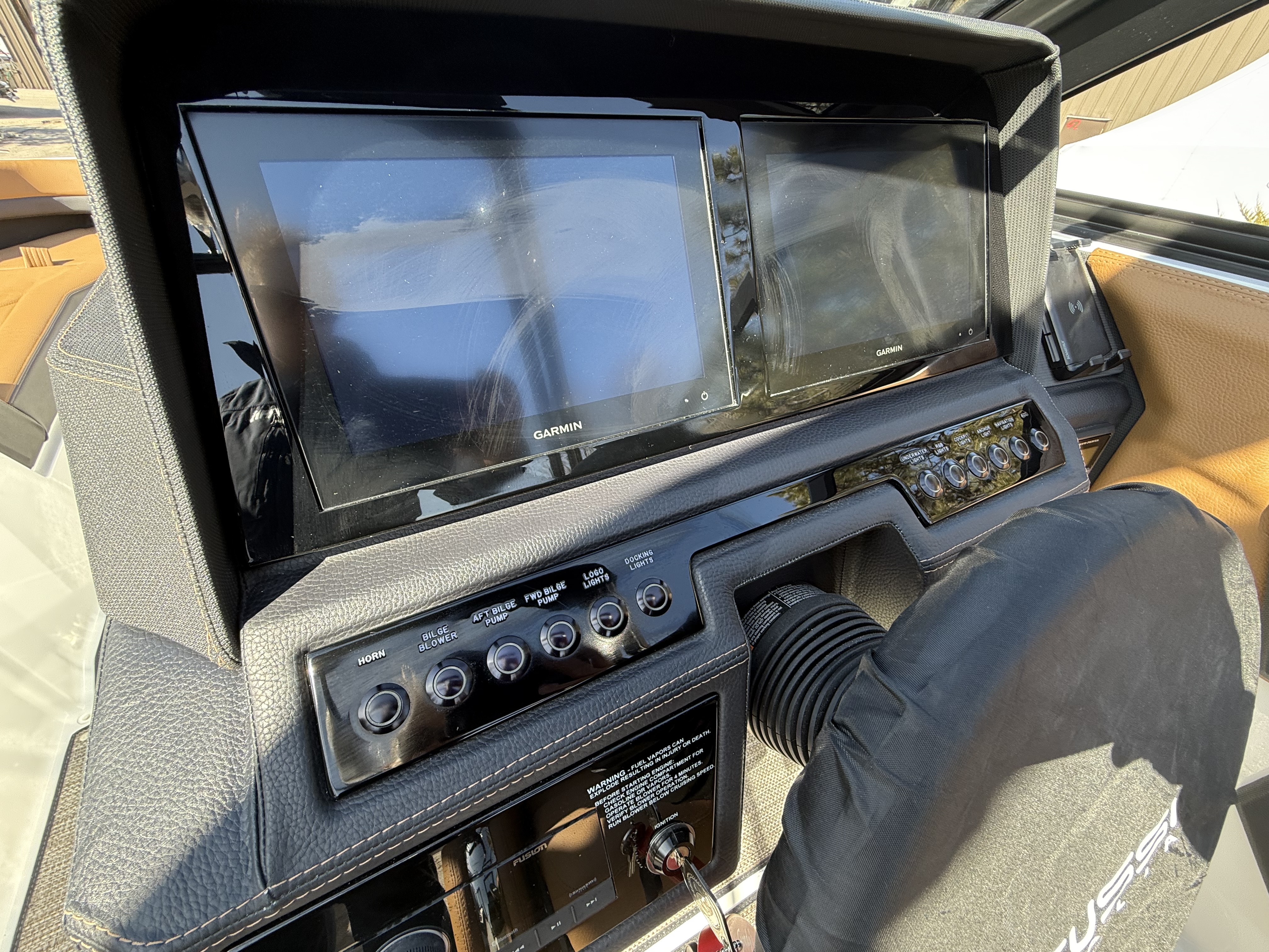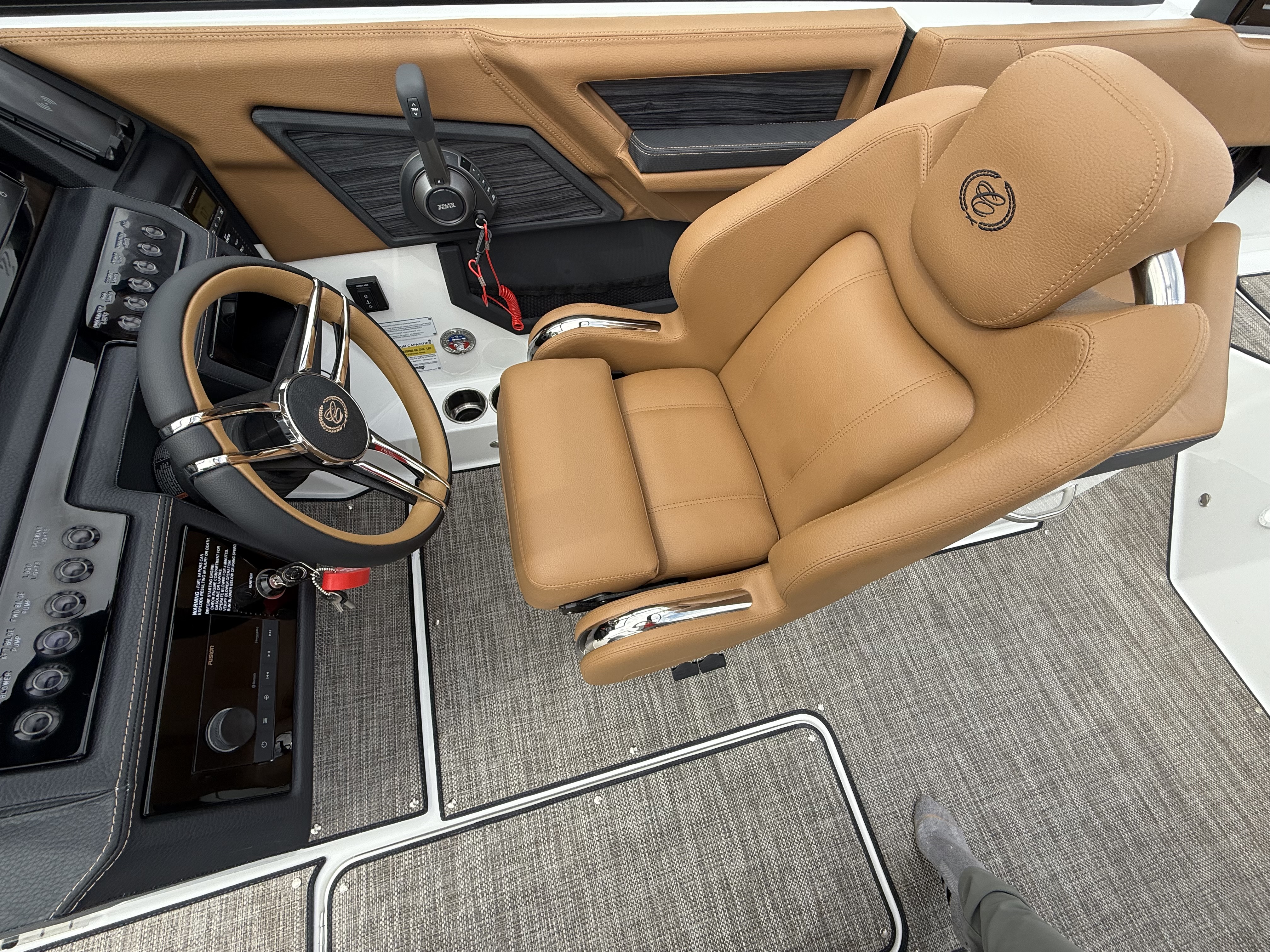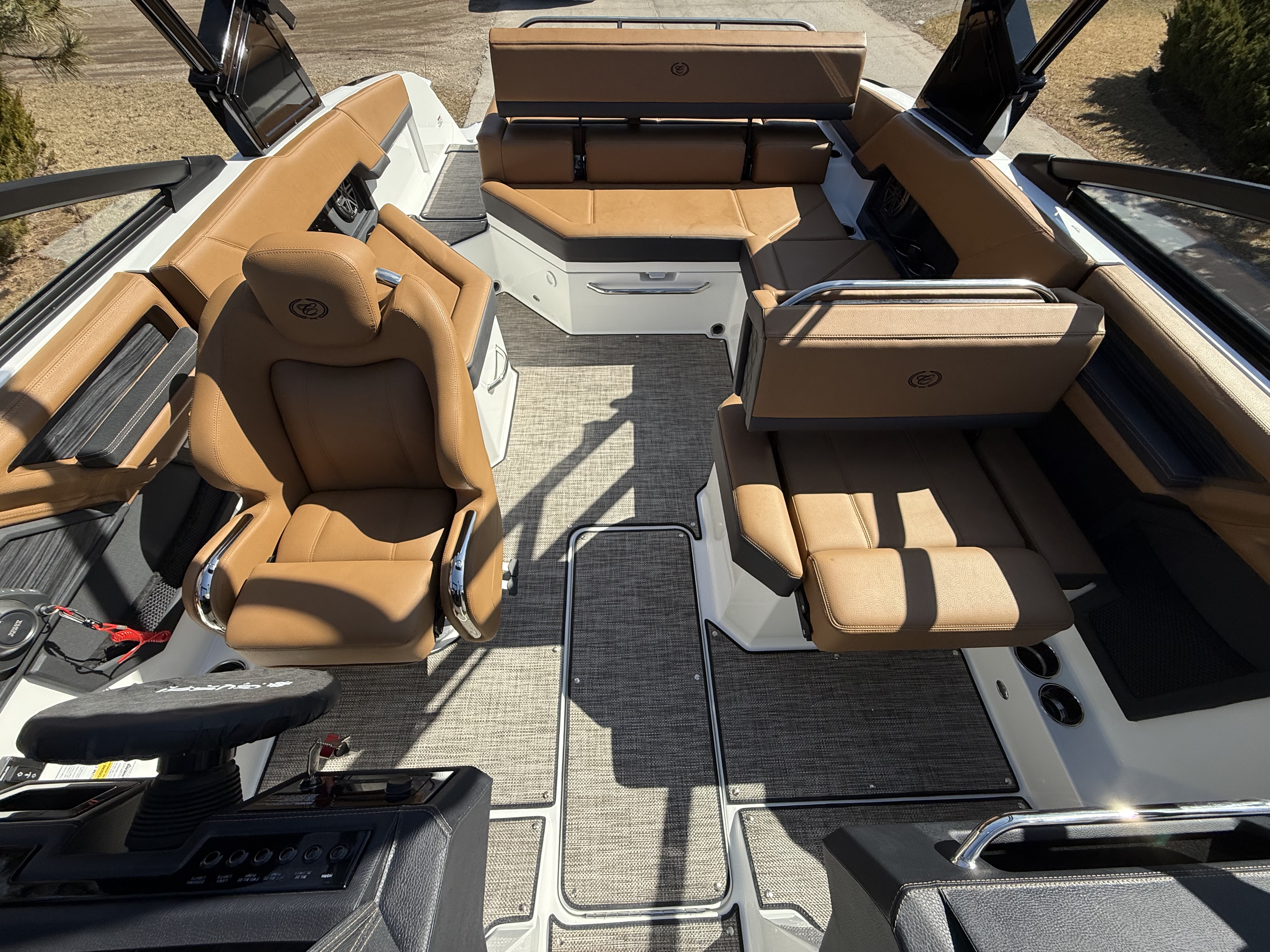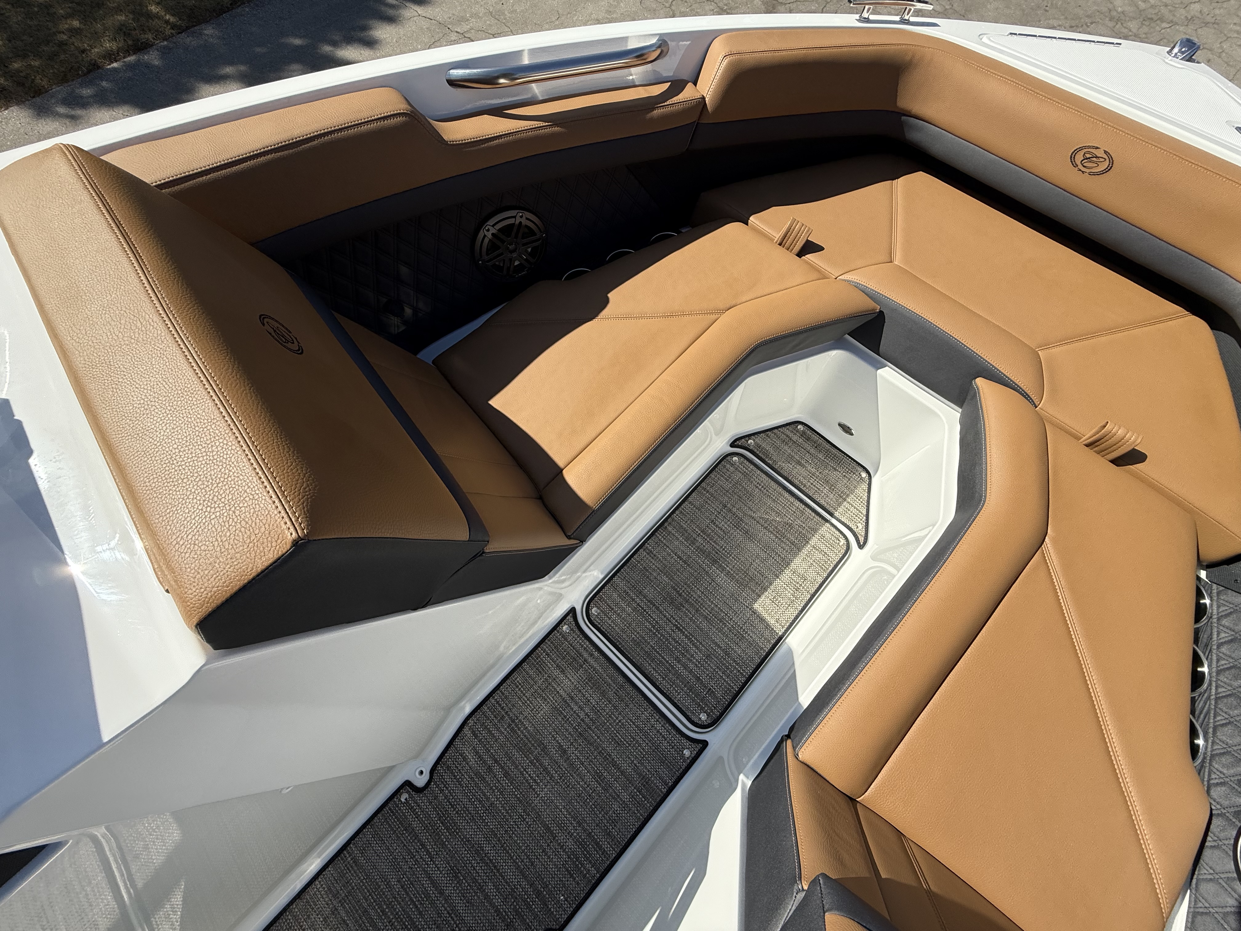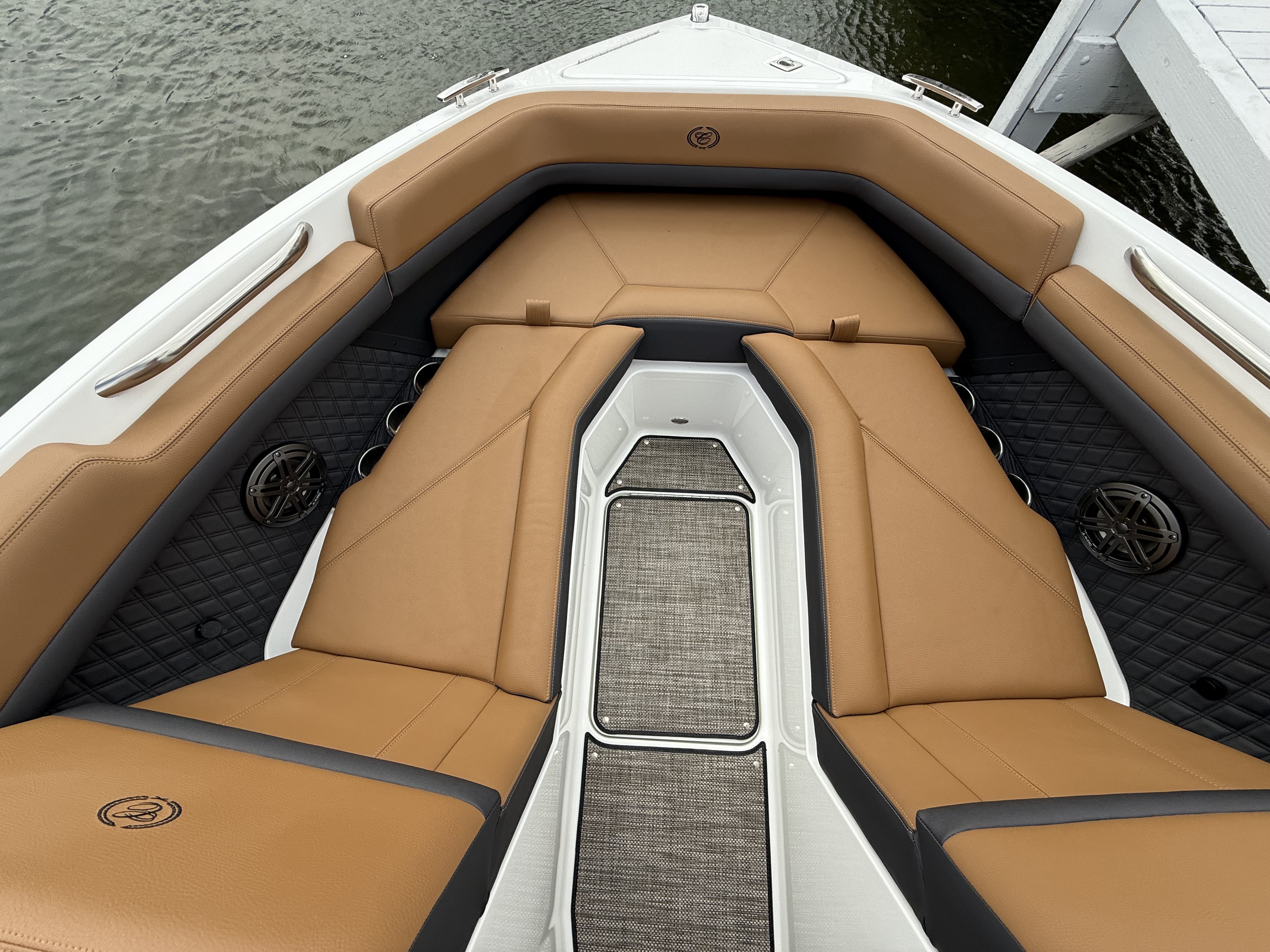 Sleek & Stylish Exterior: A striking Rich Ebony hull with Graphite Gray accents and a custom three-color design with swim platform accent ensures this boat turns heads on the water.