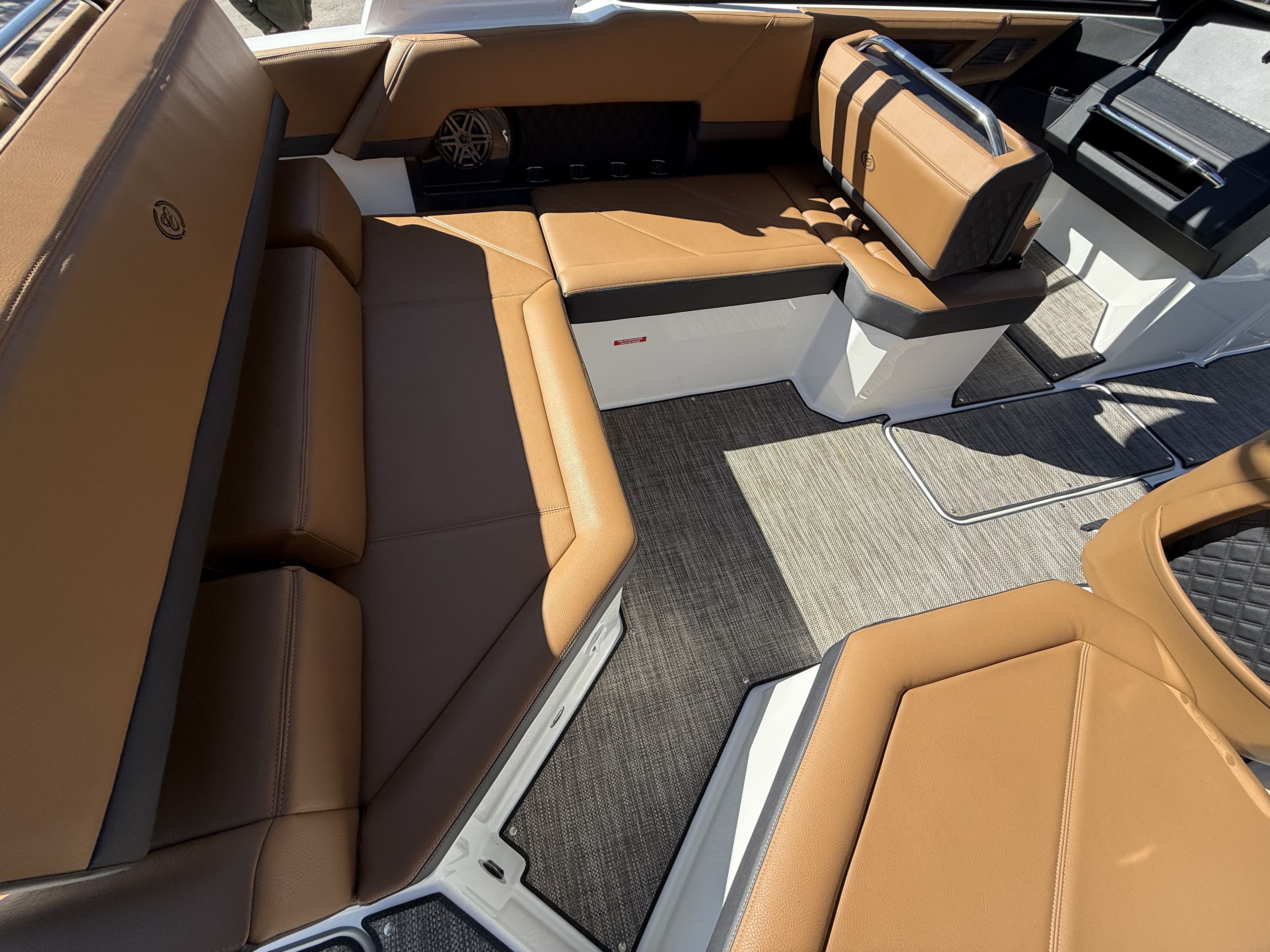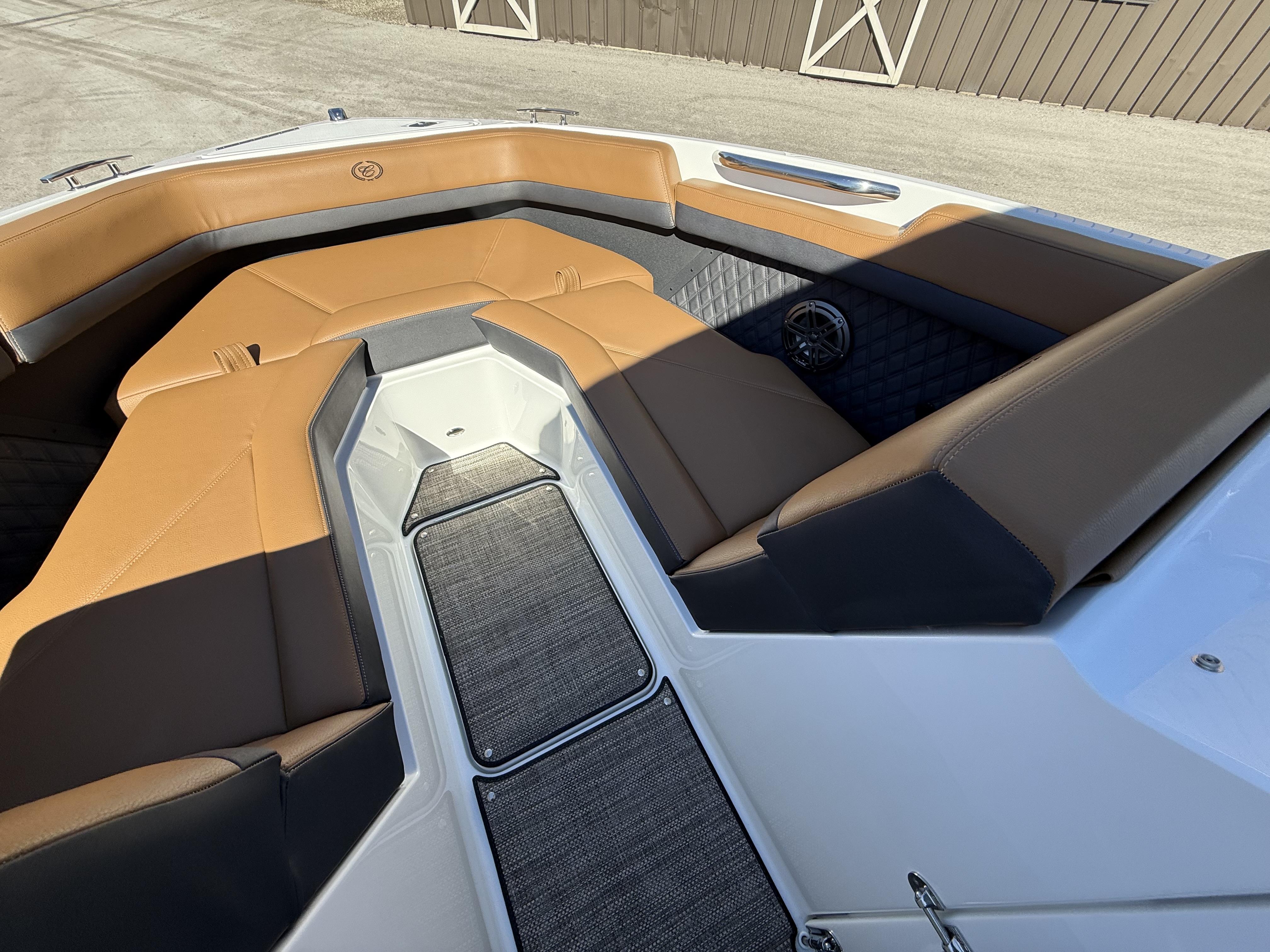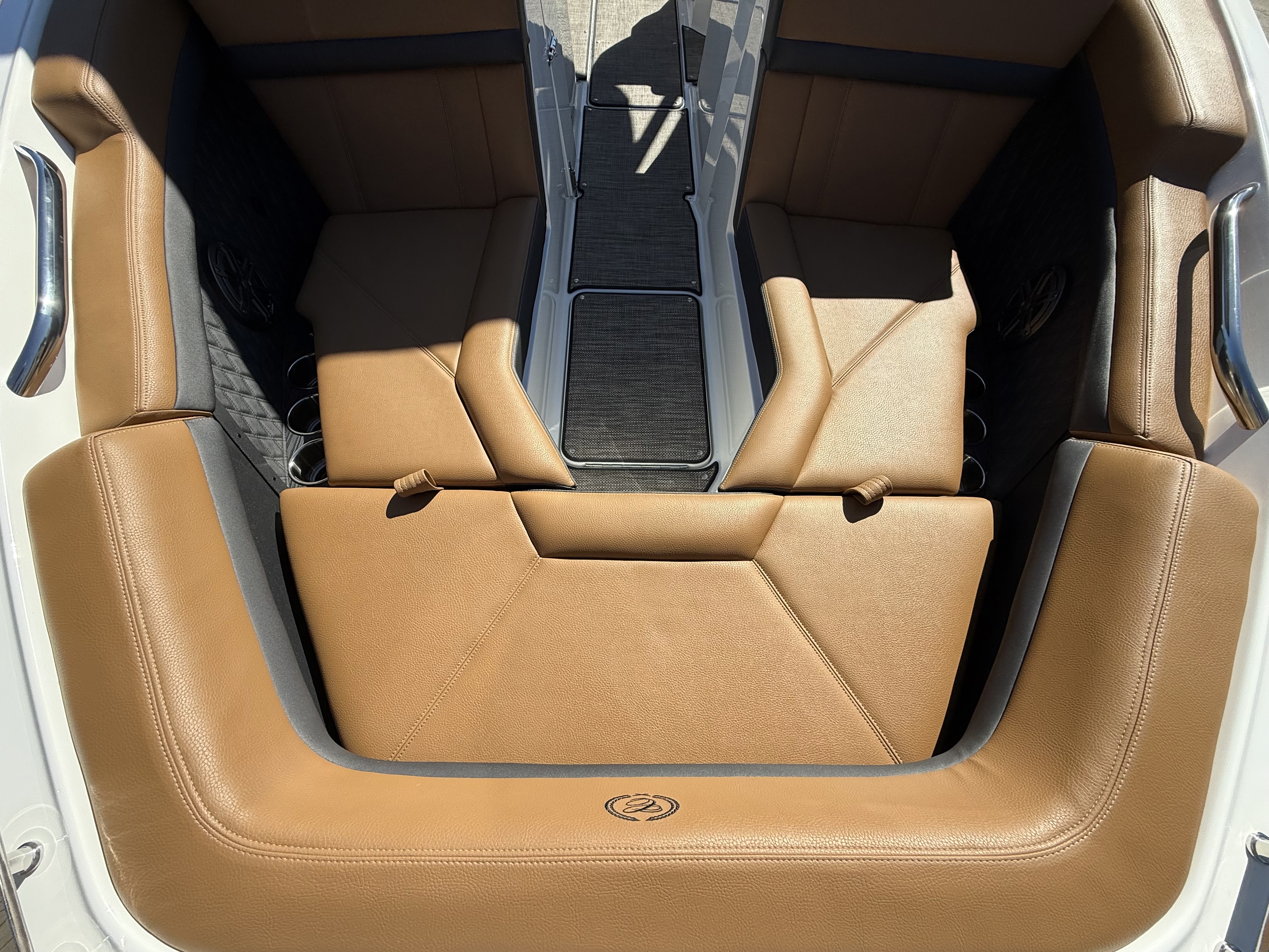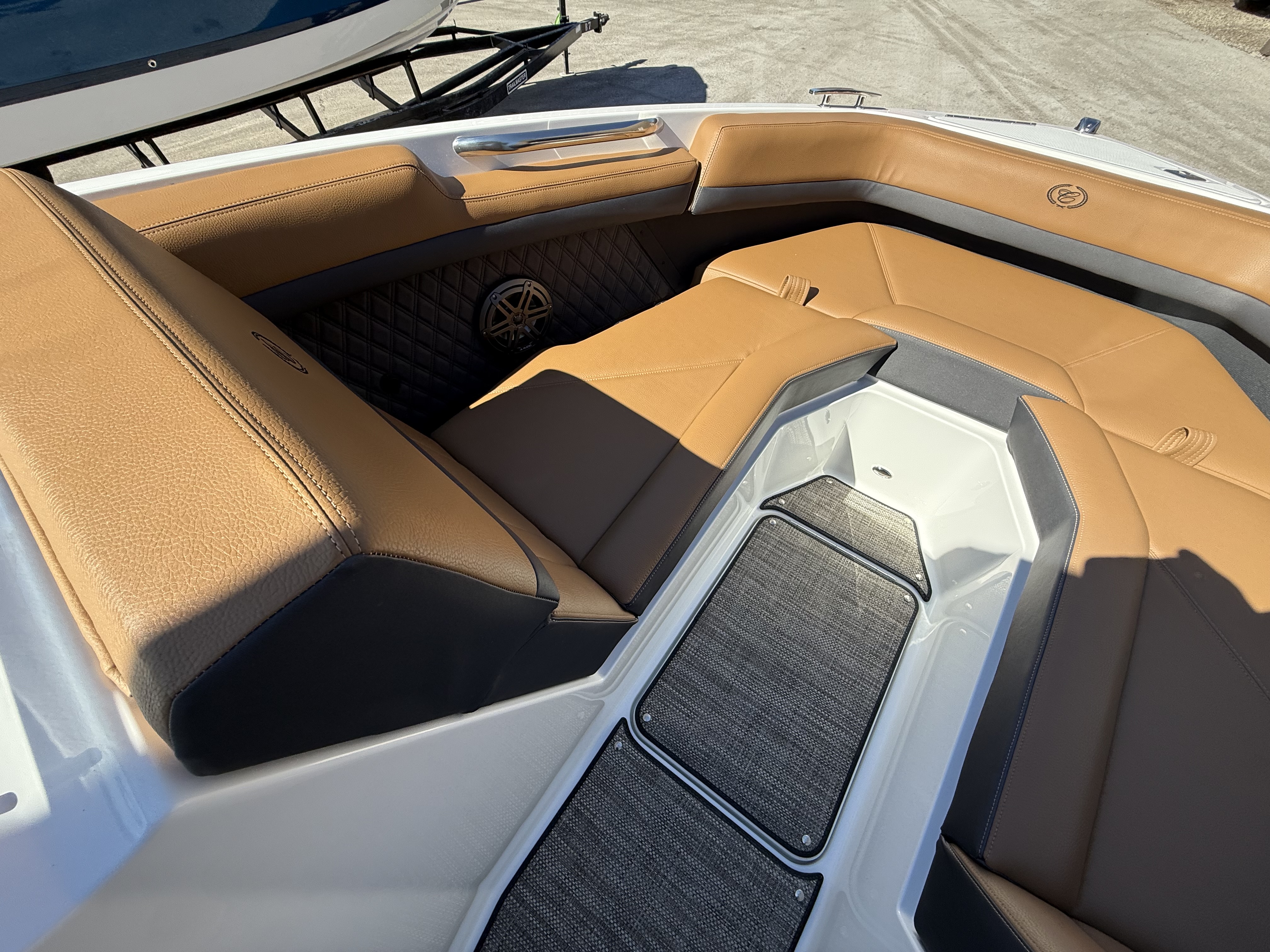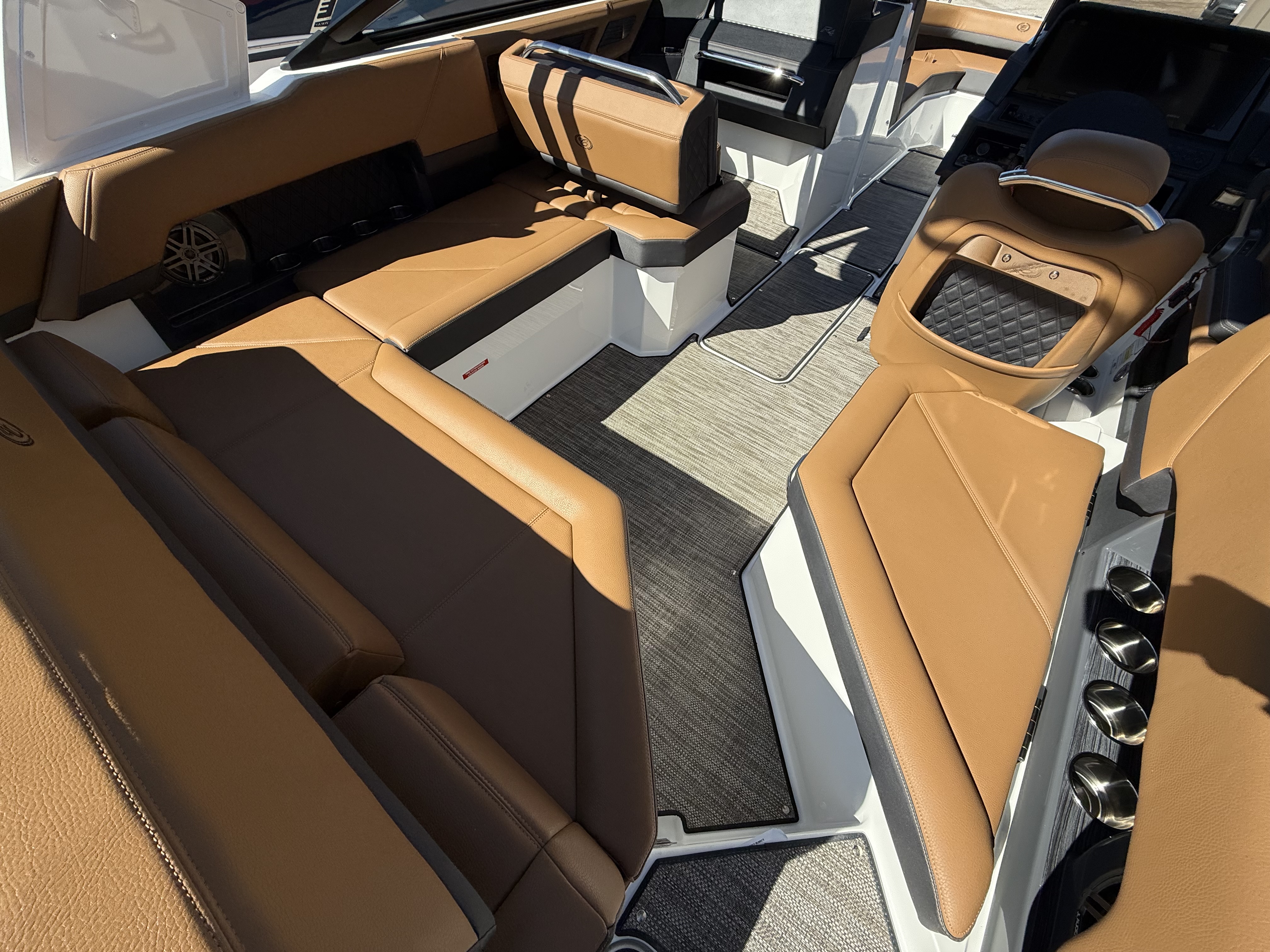 Dressed in a bold Knockout Red and Navy exterior with a custom three-color graphic and swim platform accent, this boat is designed to make a statement. Inside, the Caramel/Carbon interior with the wood interior accent package adds warmth and elegance, while the Sea Grass floor covering ensures premium comfort underfoot.