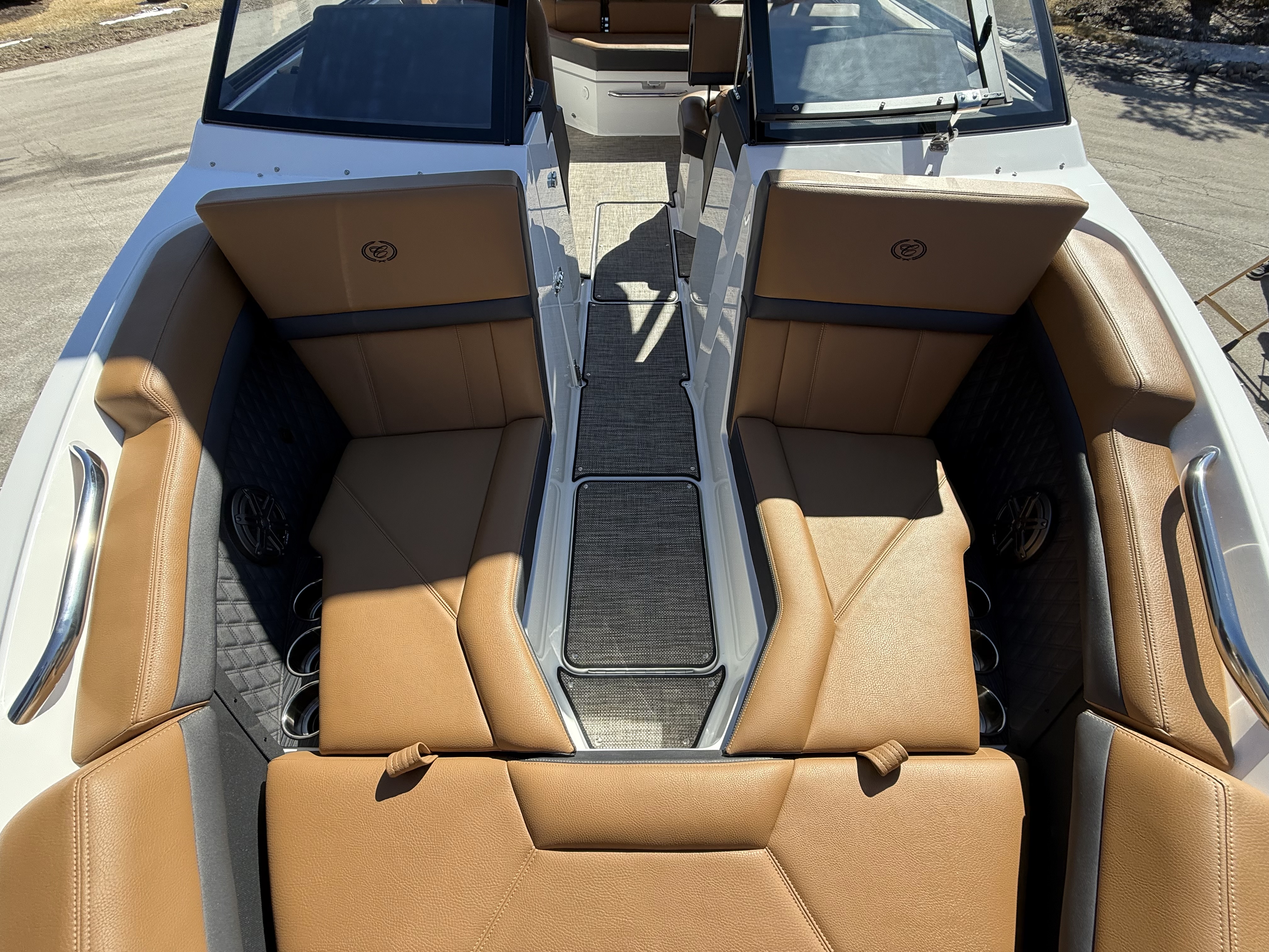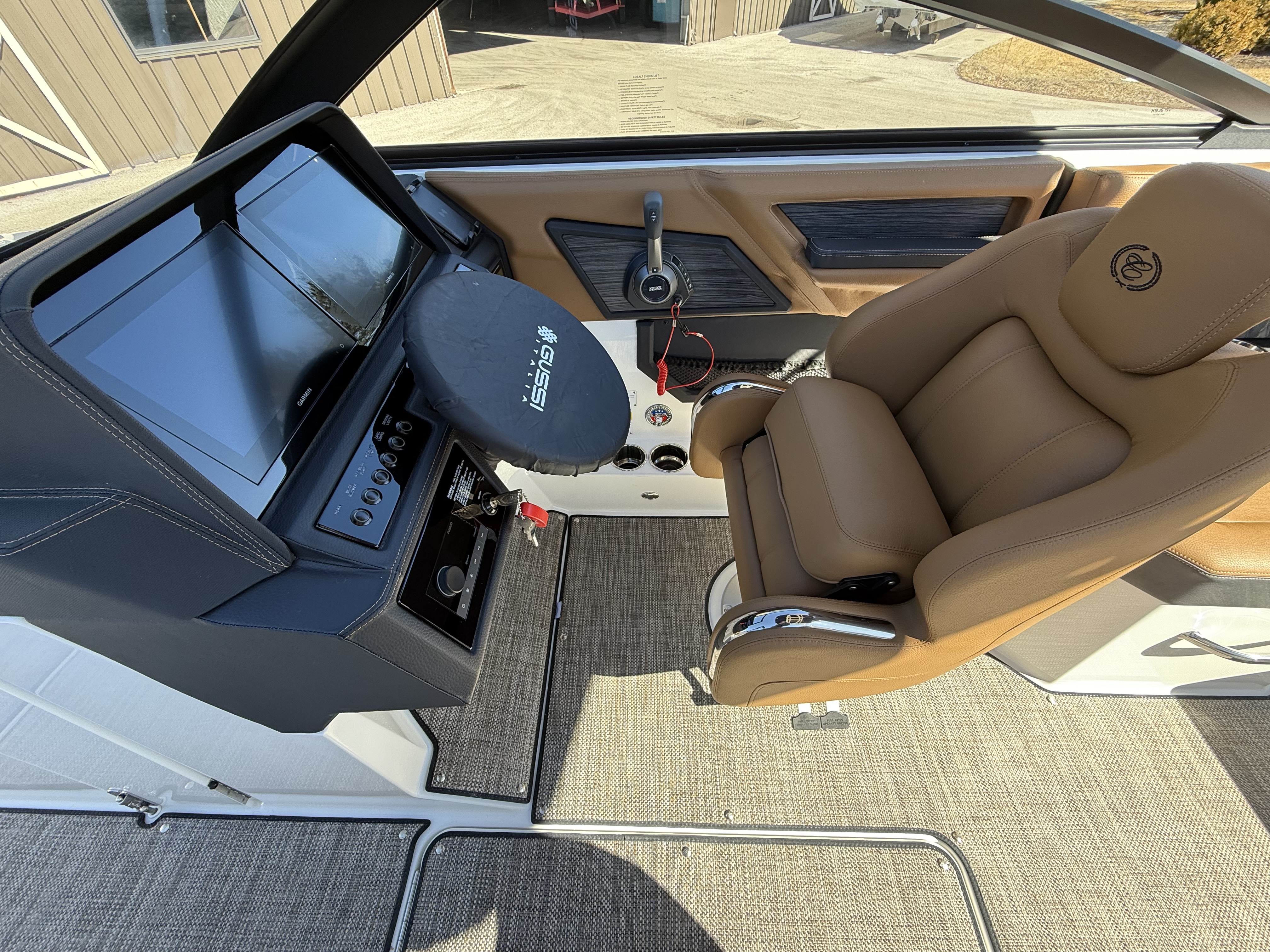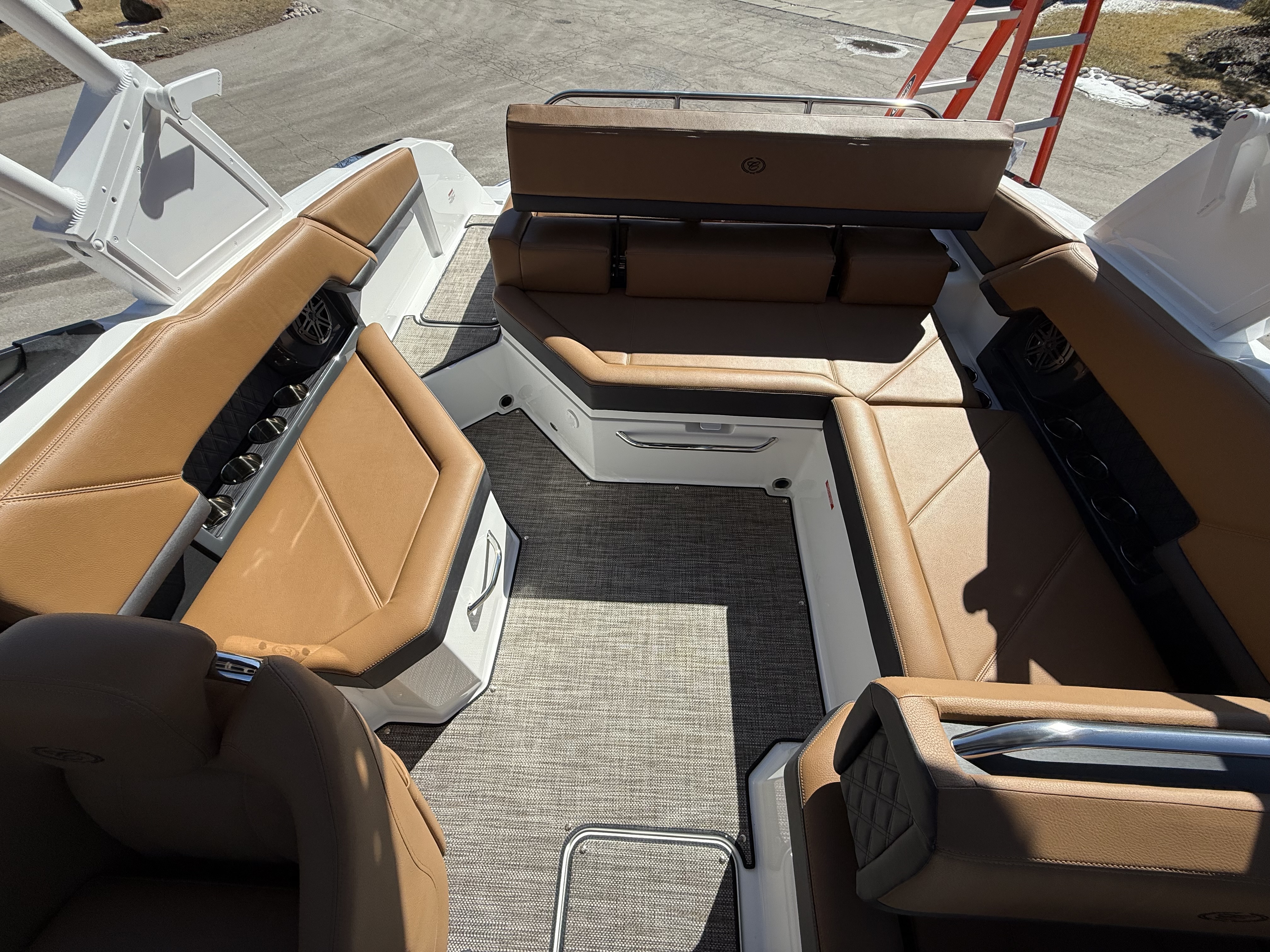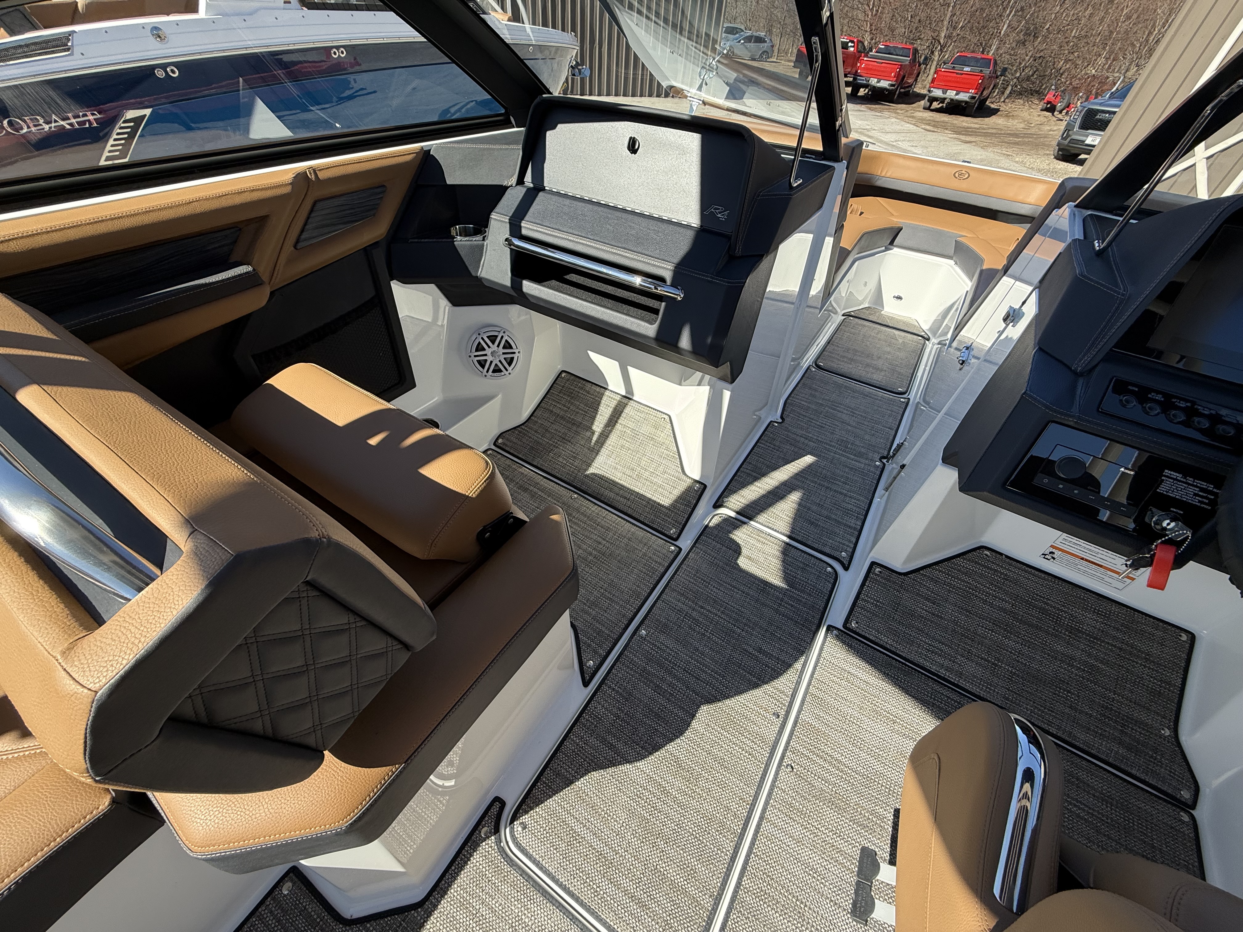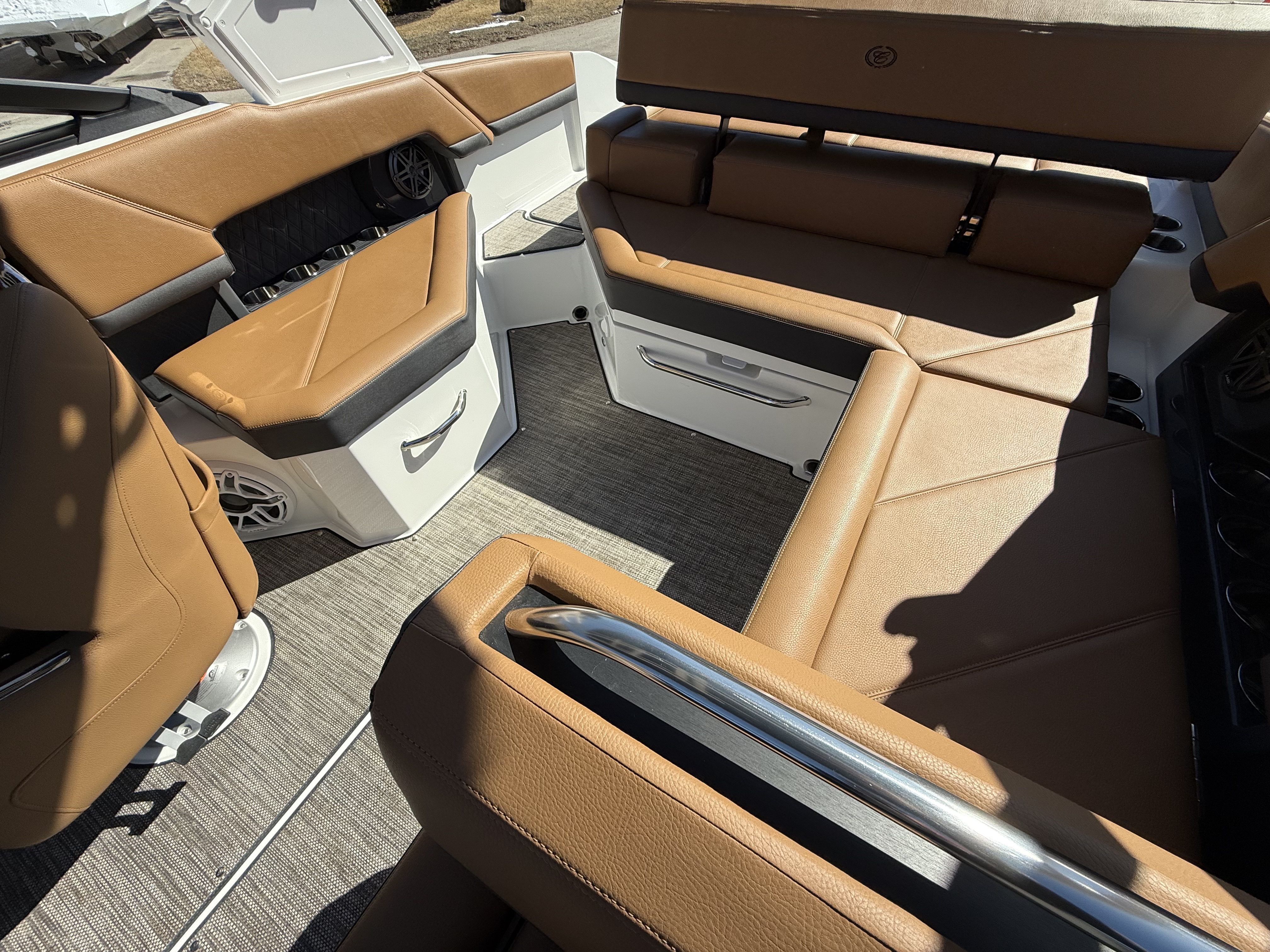 Dressed in a bold Knockout Red and Navy exterior with a custom three-color graphic and swim platform accent, this boat is designed to make a statement. Inside, the Caramel/Carbon interior with the wood interior accent package adds warmth and elegance, while the Sea Grass floor covering ensures premium comfort underfoot.