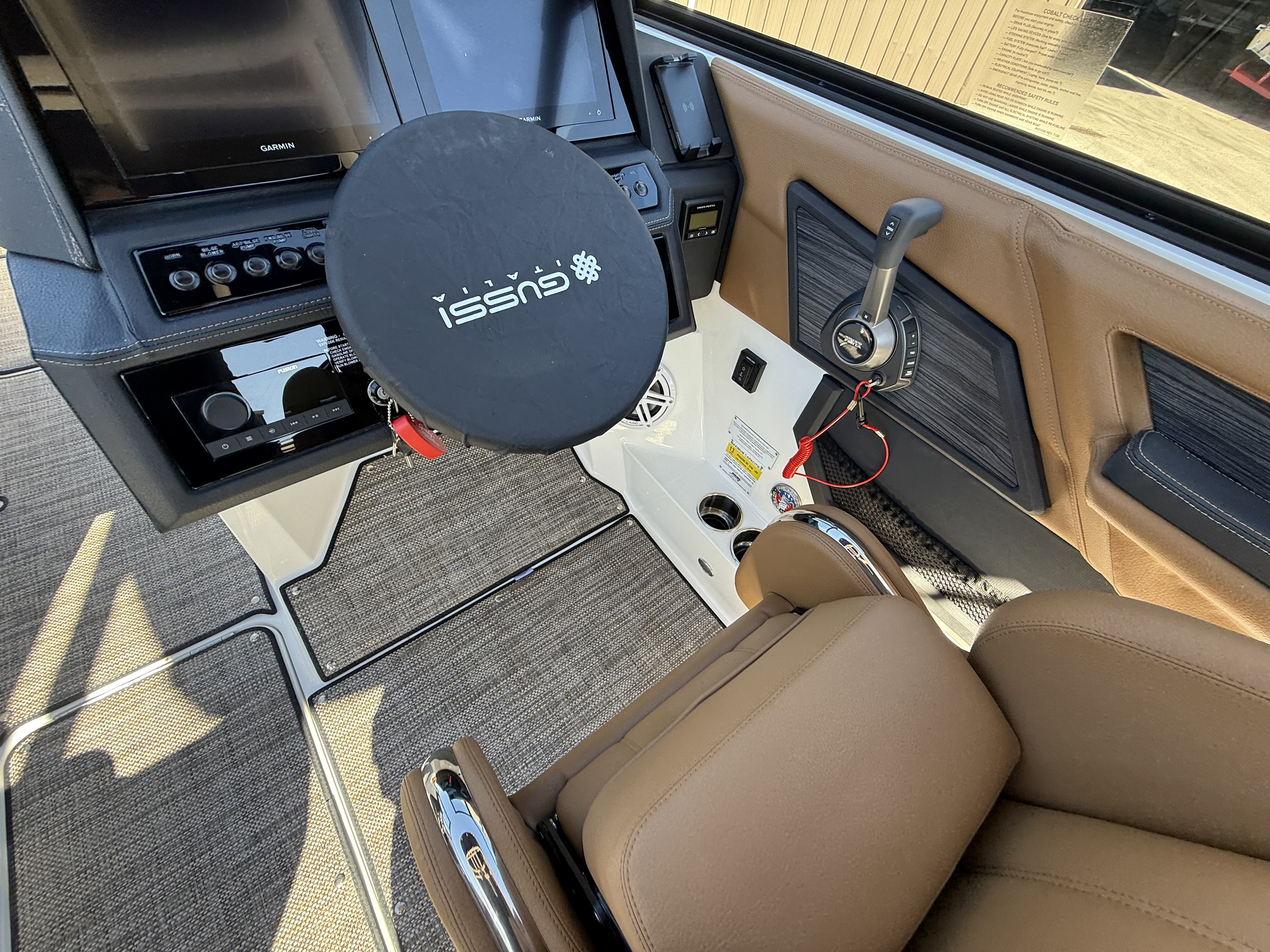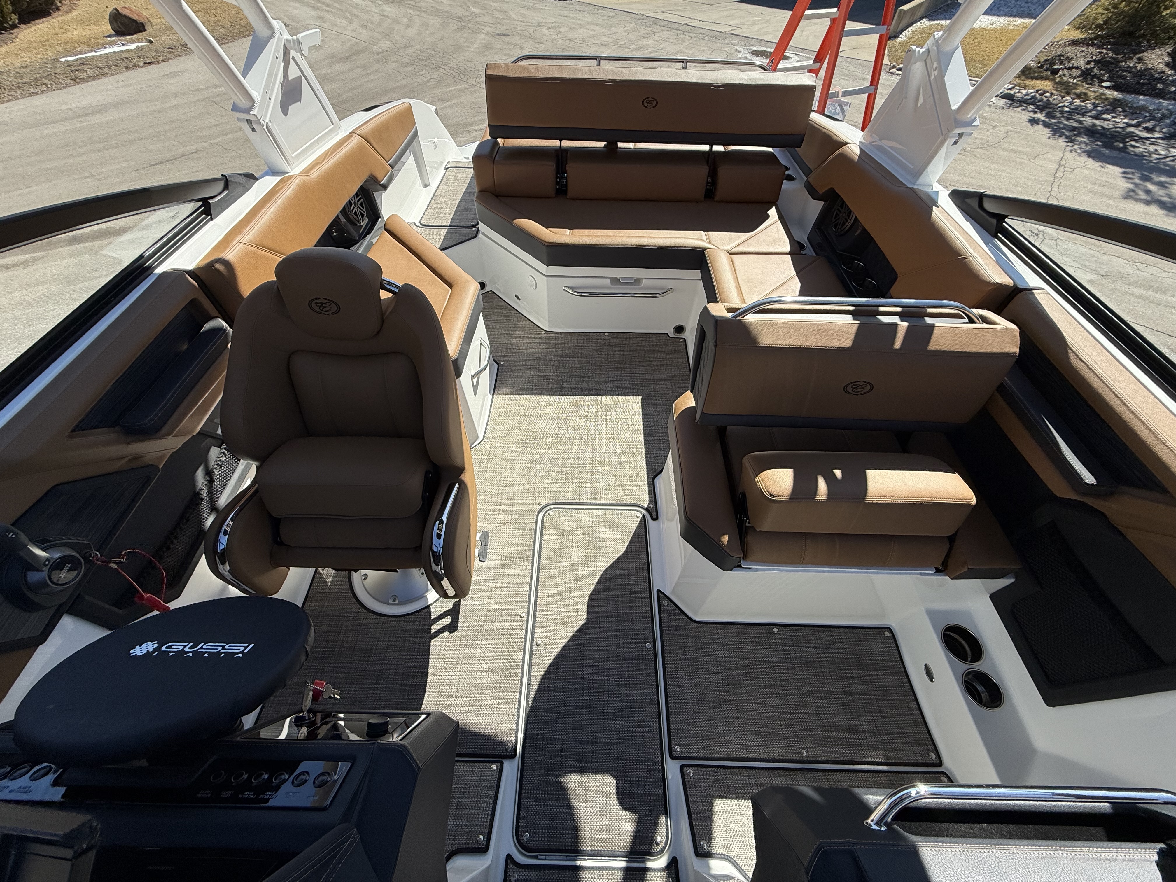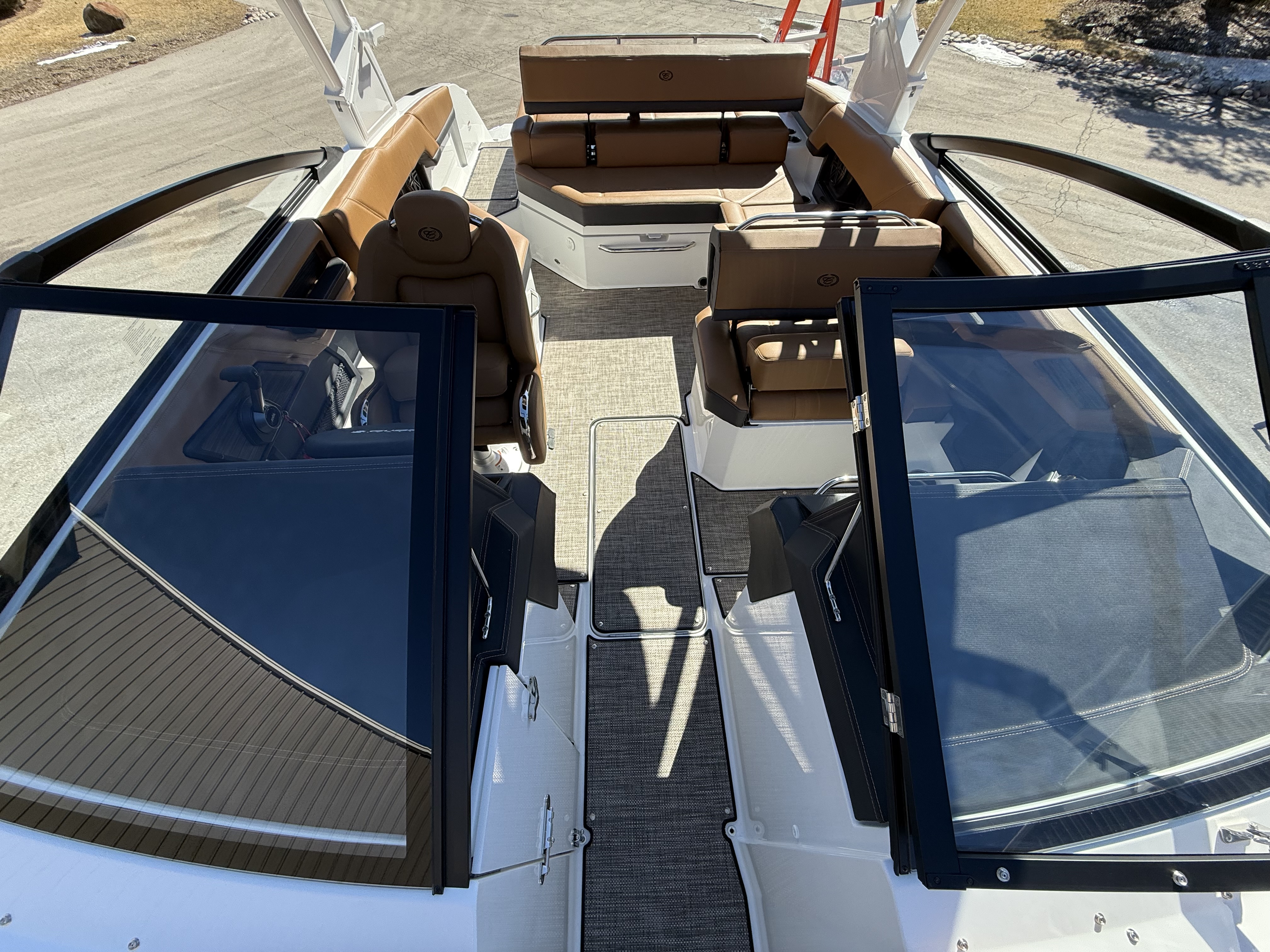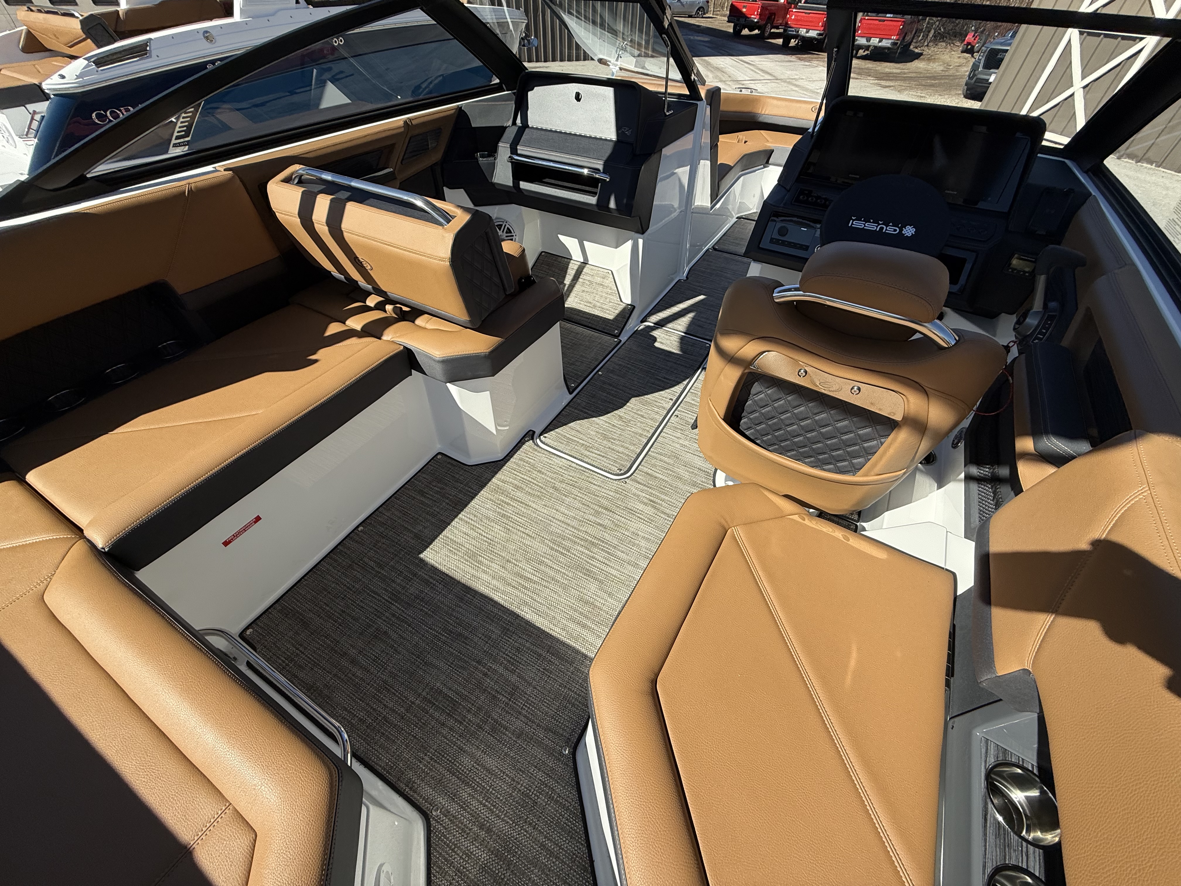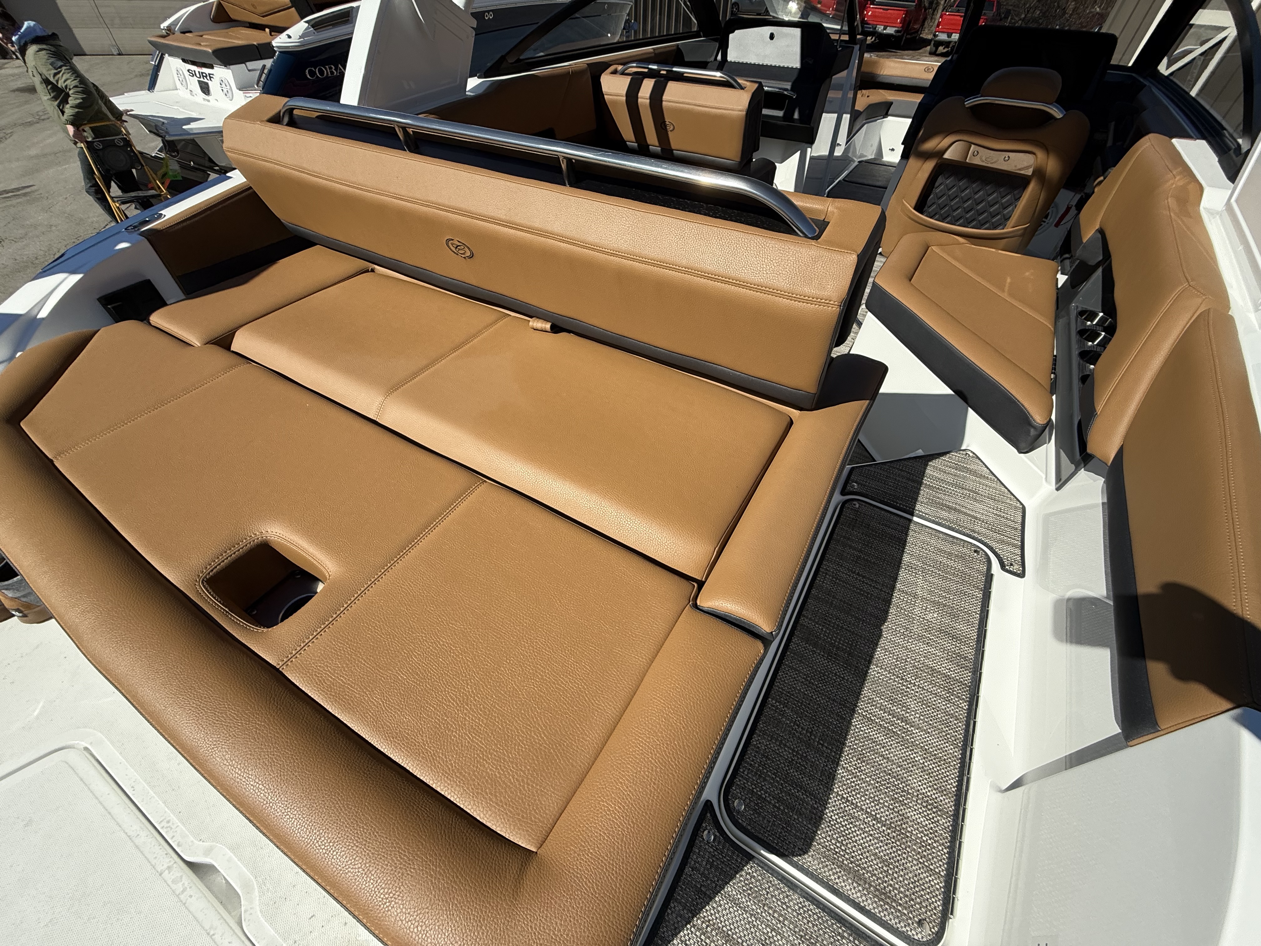 Dressed in a bold Knockout Red and Navy exterior with a custom three-color graphic and swim platform accent, this boat is designed to make a statement. Inside, the Caramel/Carbon interior with the wood interior accent package adds warmth and elegance, while the Sea Grass floor covering ensures premium comfort underfoot.