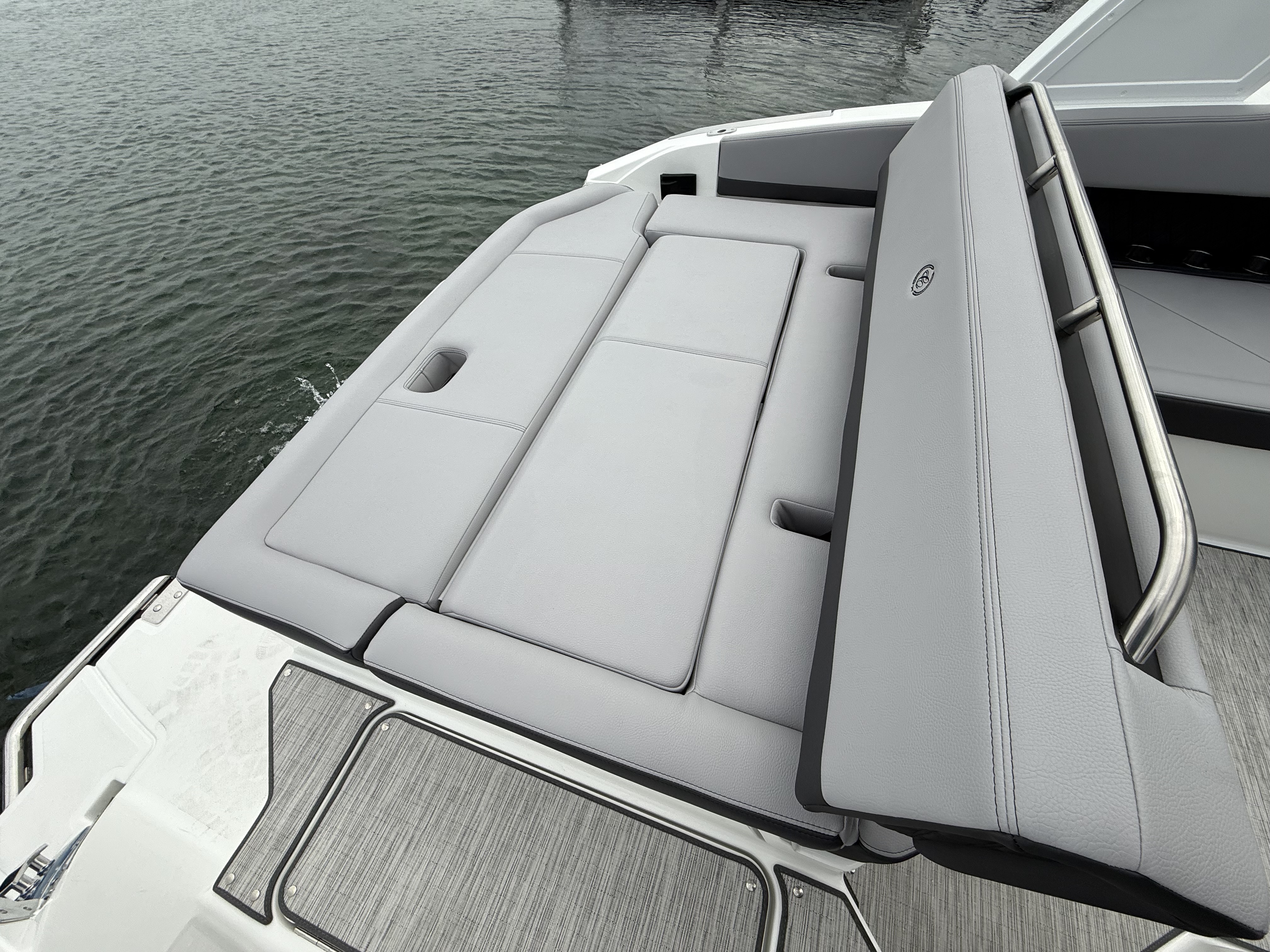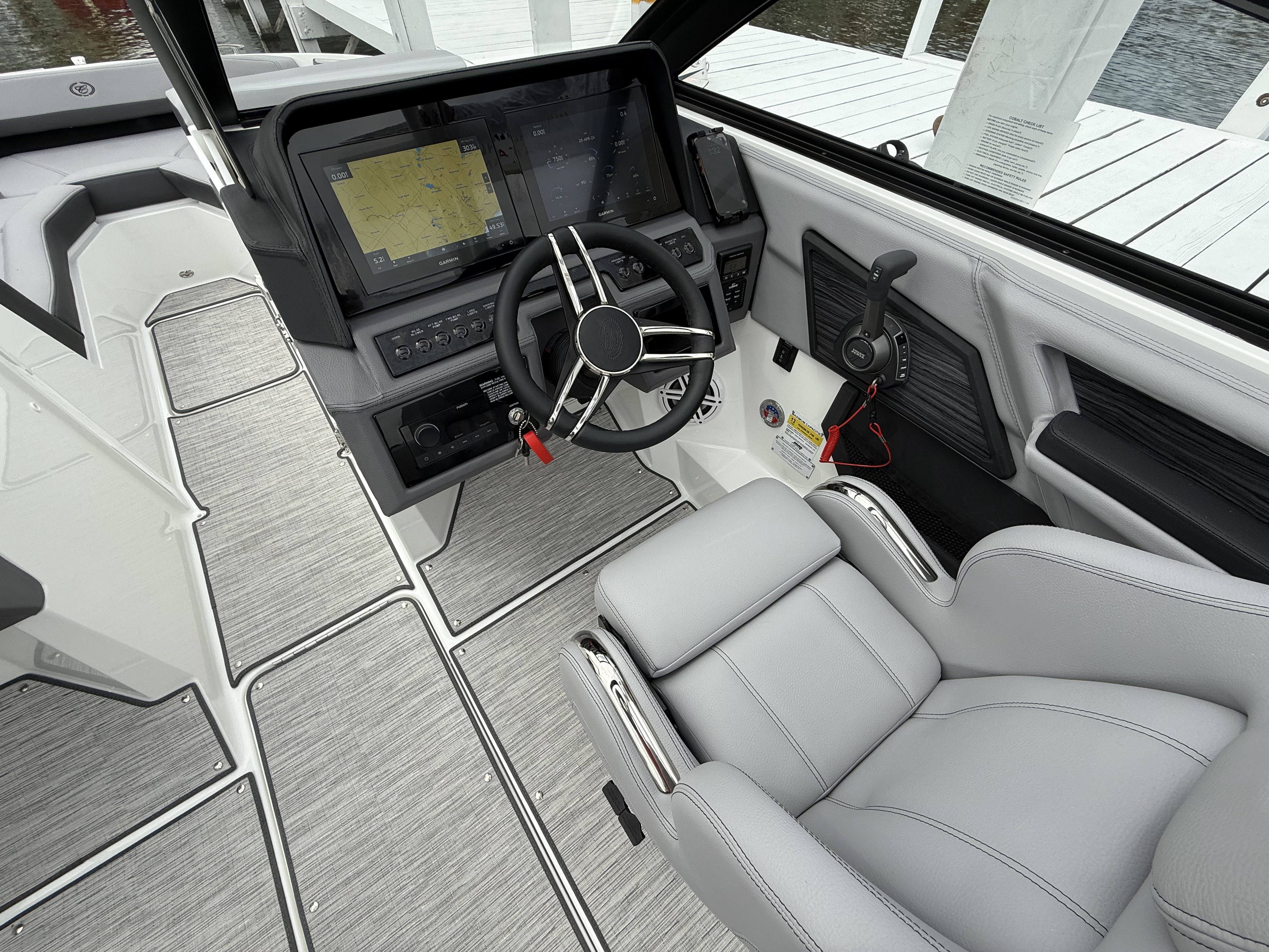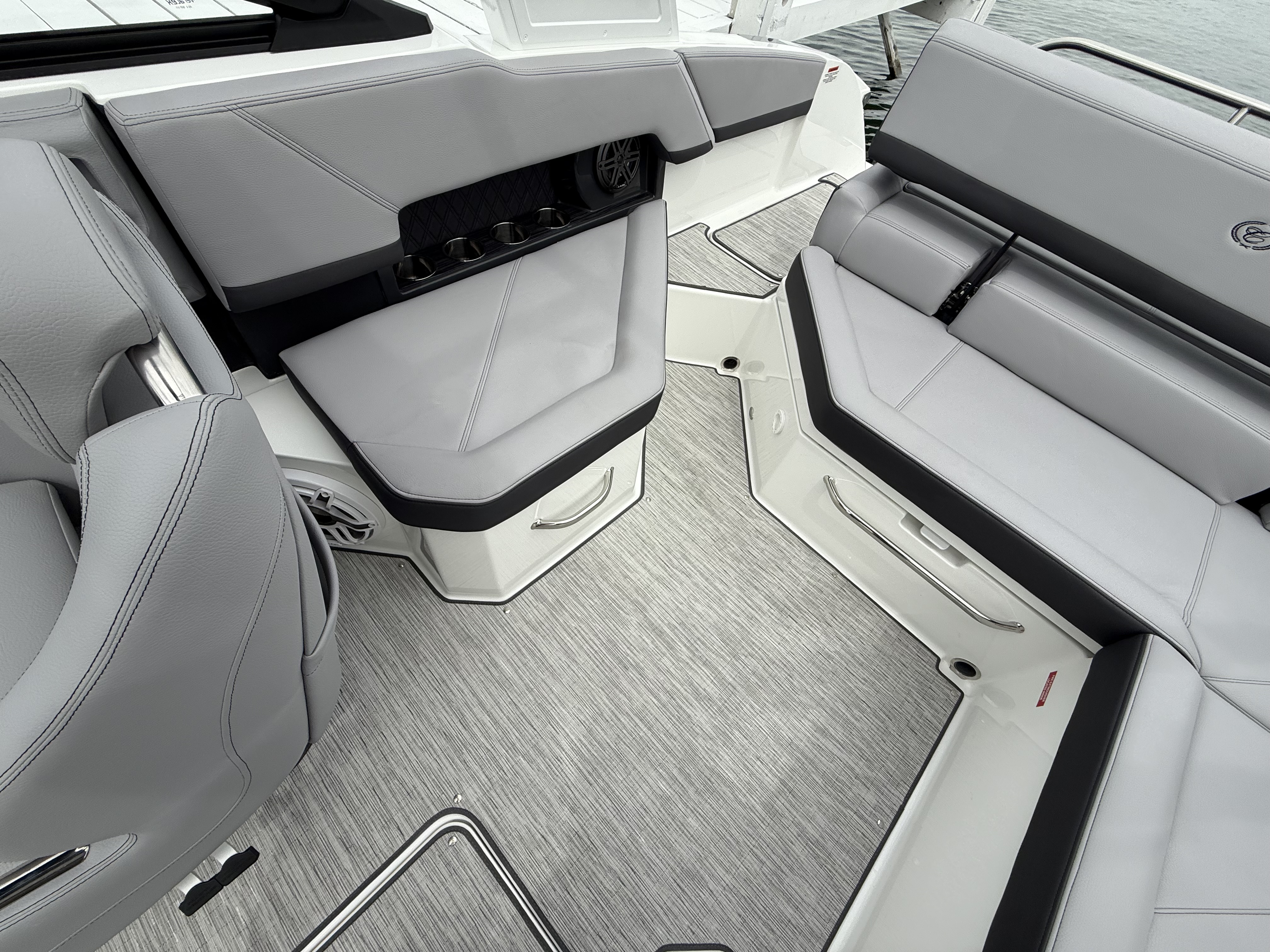 For ultimate convenience, the powerful all-chain Windlass anchor system makes docking effortless, while stainless steel docking lights enhance visibility in low-light conditions. The Trim Tabs with Indicators ensure a smooth ride in any water conditions.