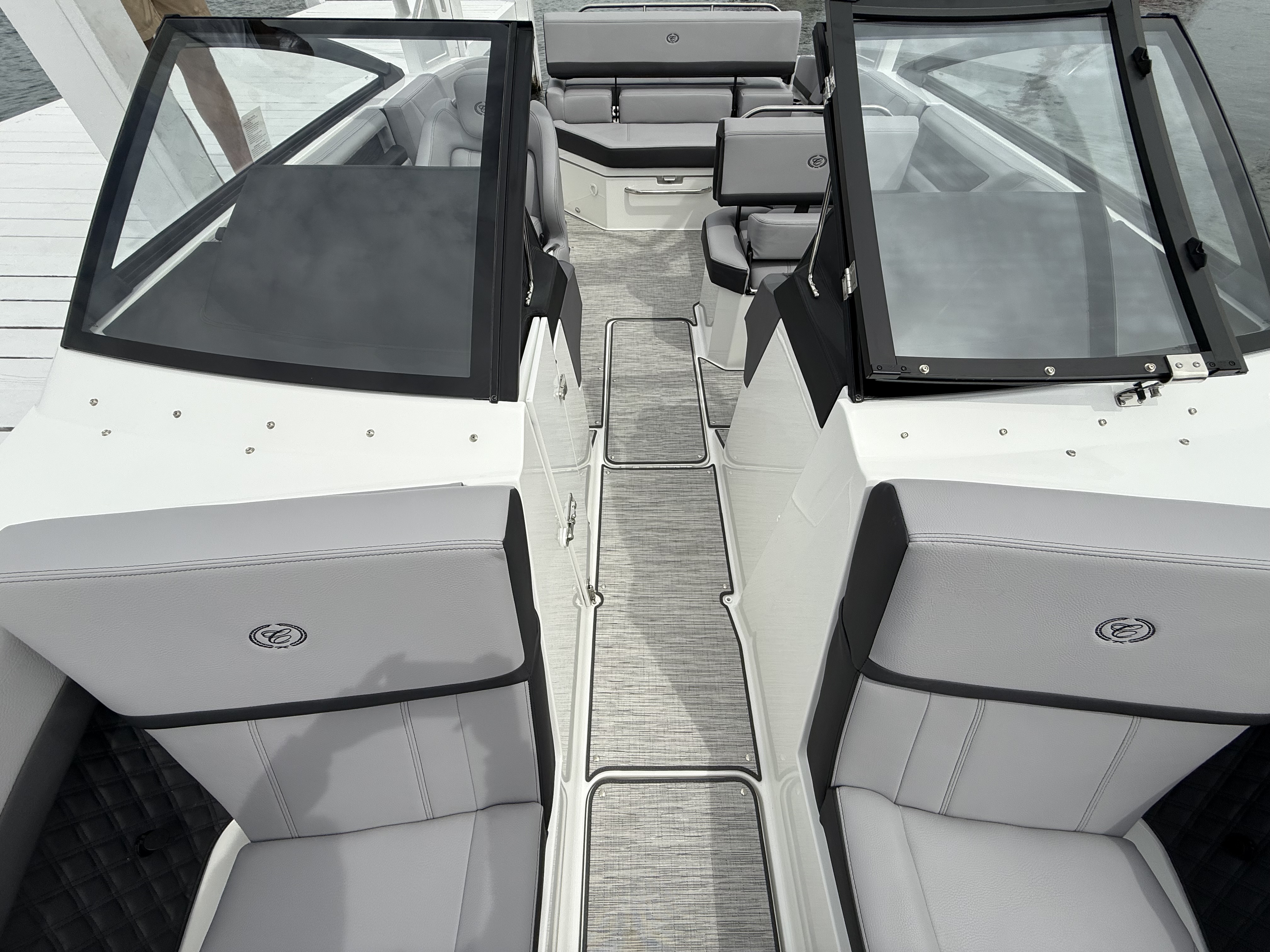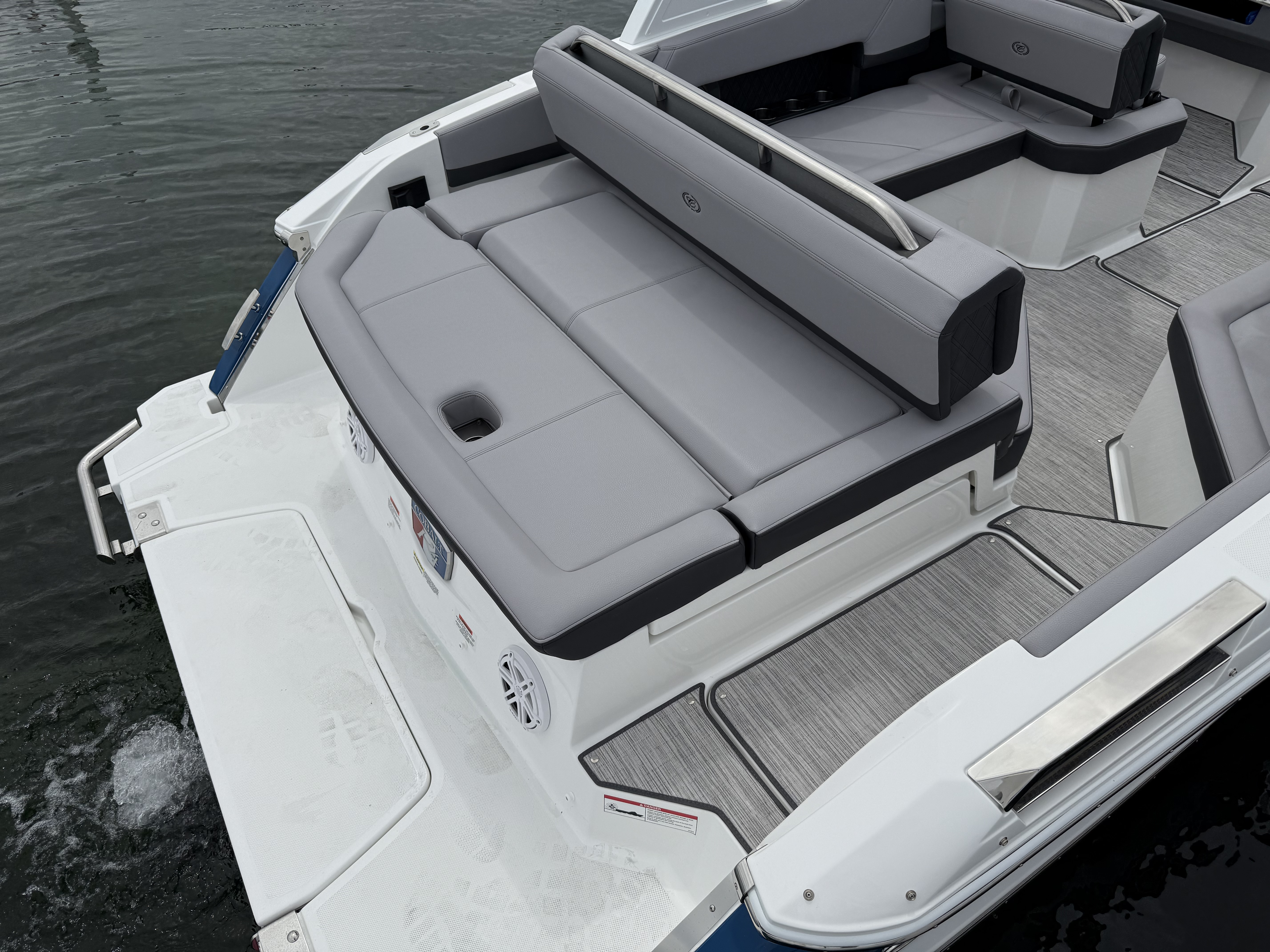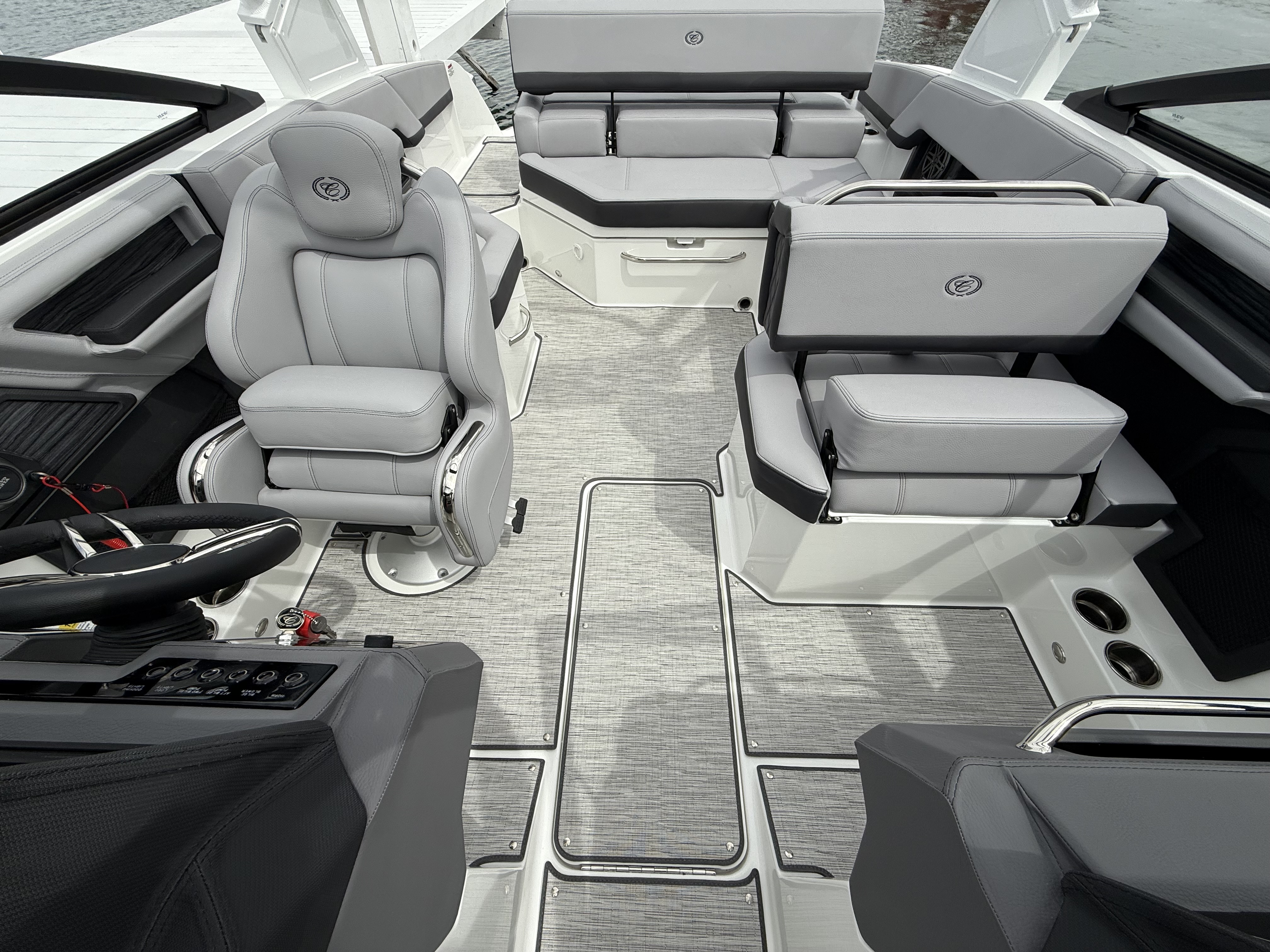For ultimate convenience, the powerful all-chain Windlass anchor system makes docking effortless, while stainless steel docking lights enhance visibility in low-light conditions. The Trim Tabs with Indicators ensure a smooth ride in any water conditions.