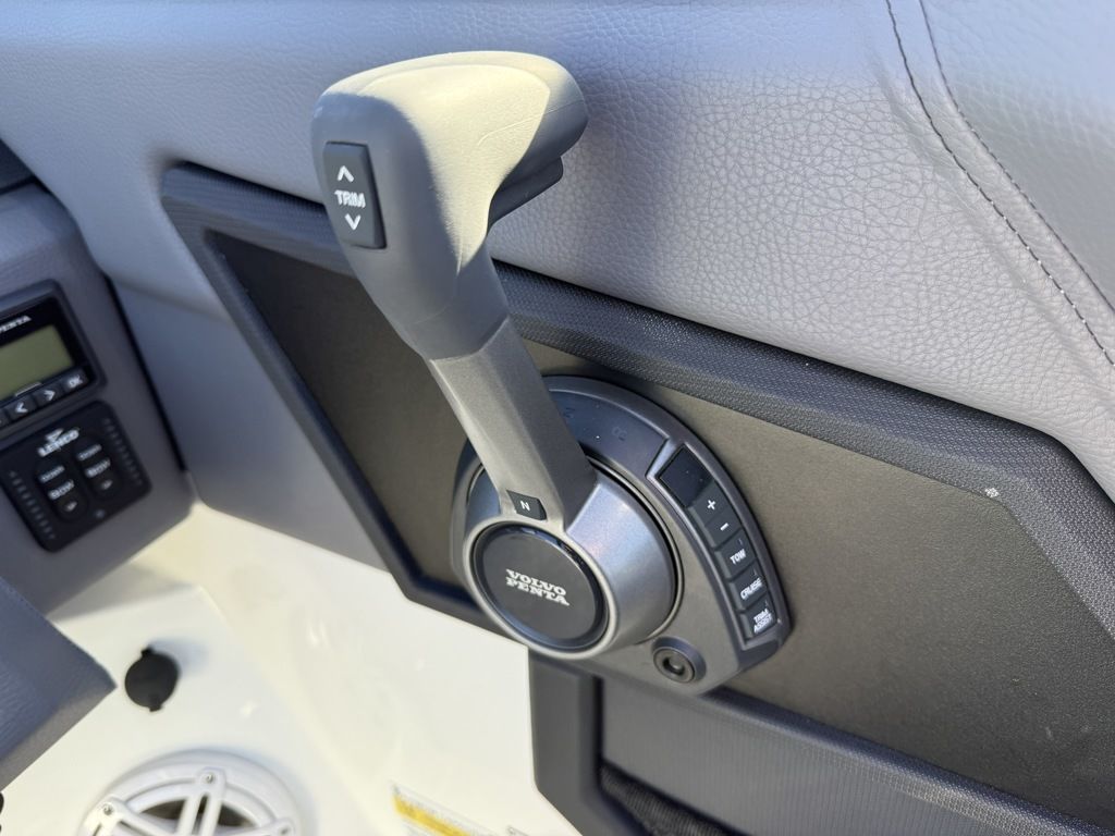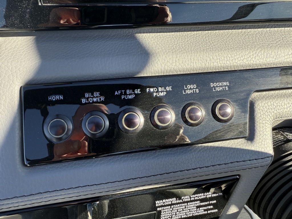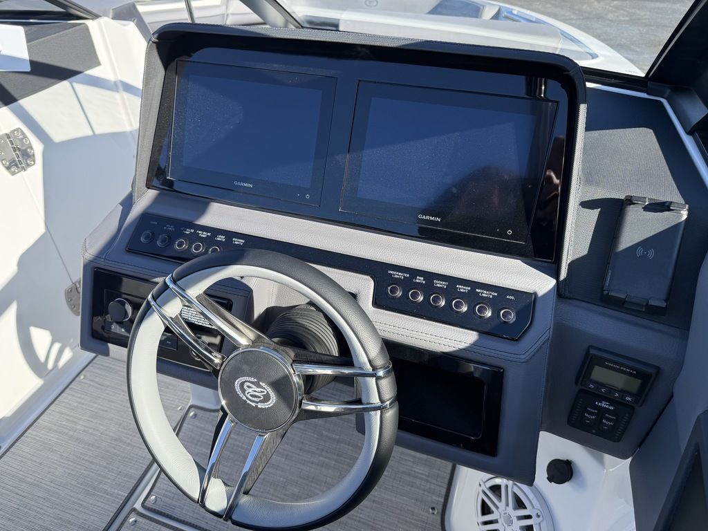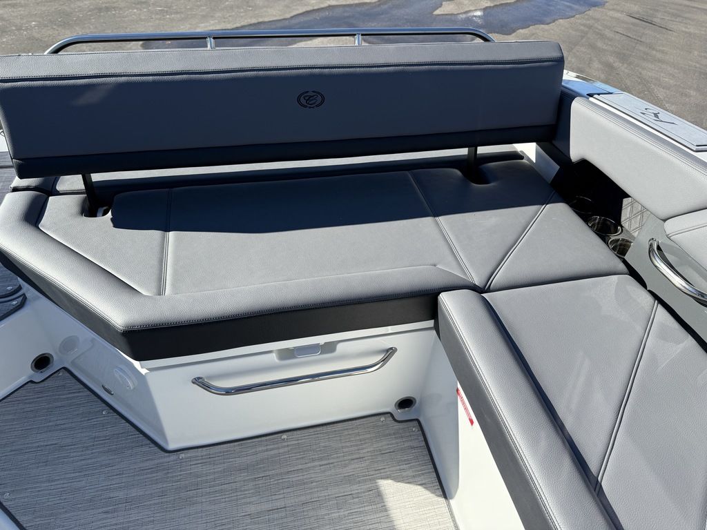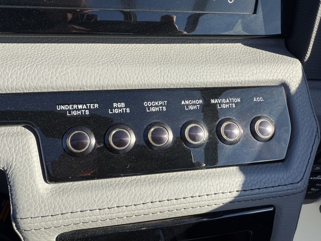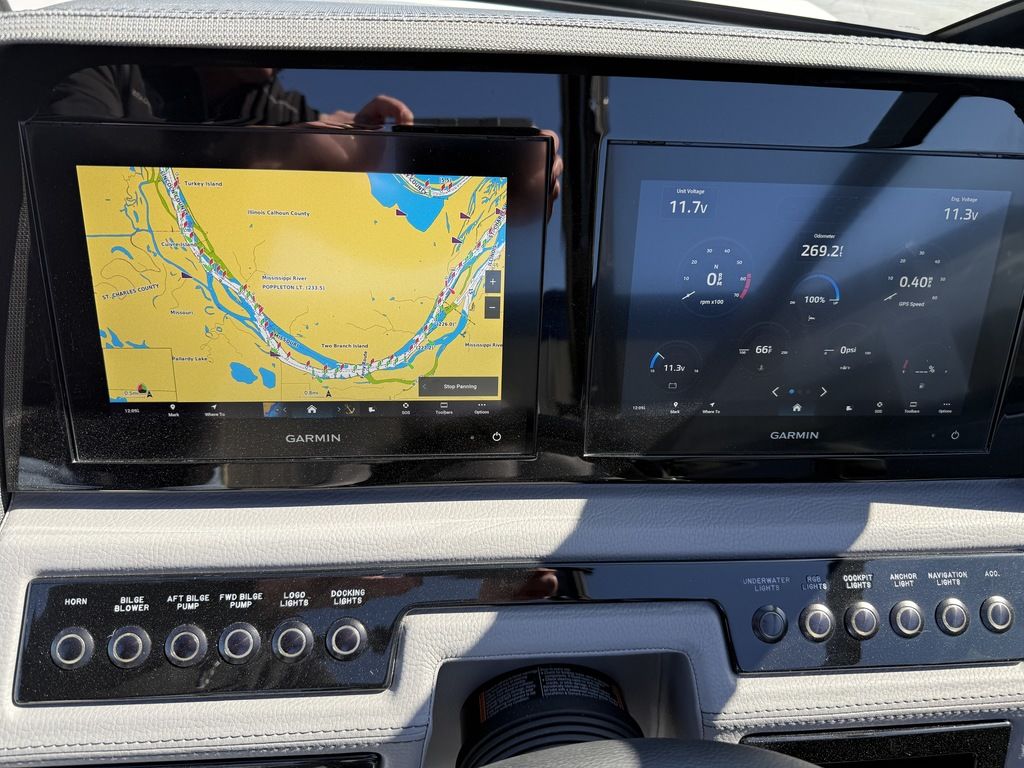 Upgraded Features Include: Full Mooring Cover, Arch w/Bimini, Three Color Graphics, Hull Bottom Color, Trim Tabs, Flagpole, Two Tone Steering Wheel, Dual Battery Charger, Wireless Cell Phone Charger (Helm), Sea Grass Flooring, Garmin 10" Screen Upgrade, Premium Sound Package w/Transom Speakers, Air Compressor, Sof-trac Mat Swim Platform, Sof-trac Gunnel Step Pads, Docking Lights, RGB LED Interior Lighting Package and Custom Tandem Axle Trailer.