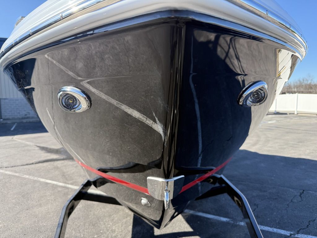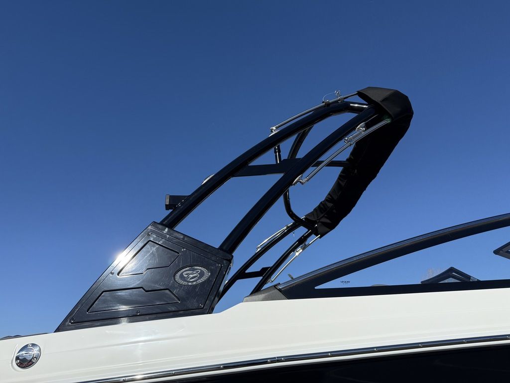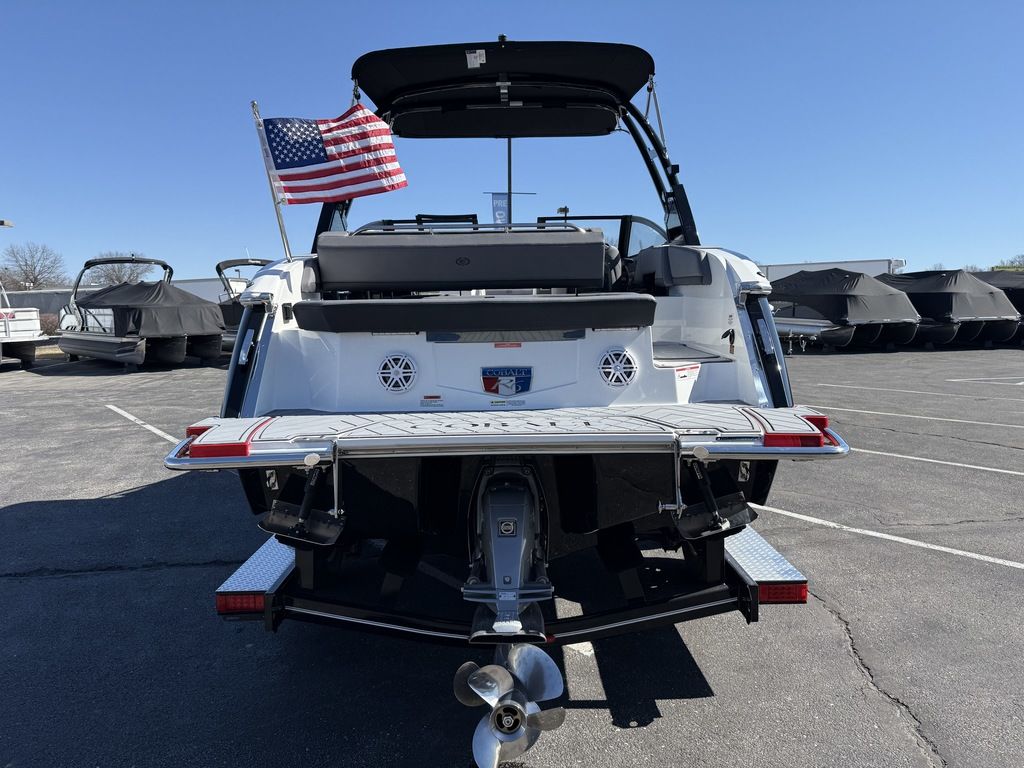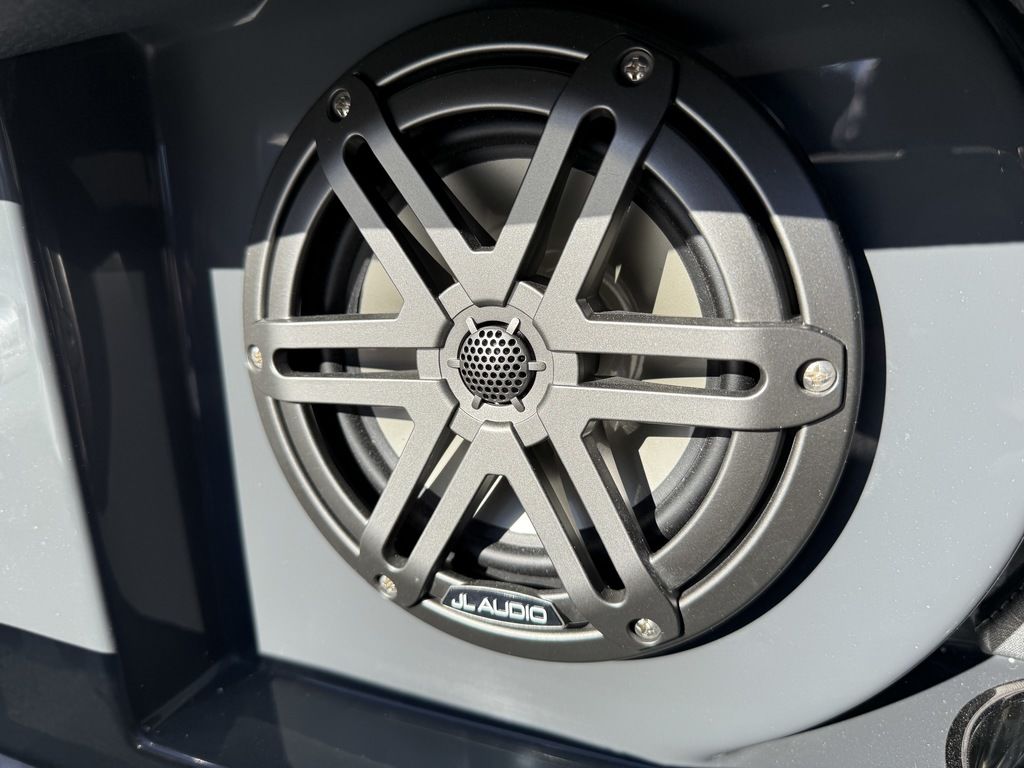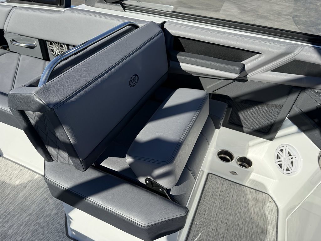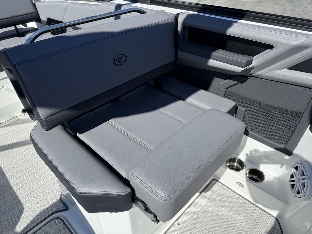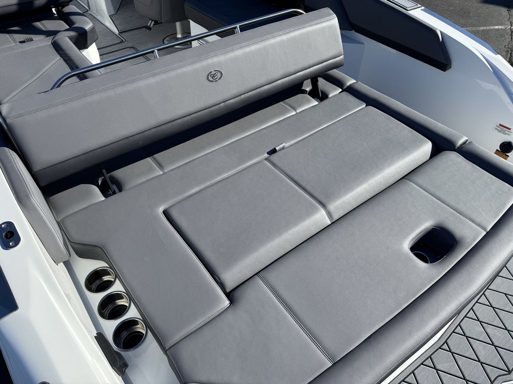 Upgraded Features Include: Full Mooring Cover, Arch w/Bimini, Three Color Graphics, Hull Bottom Color, Trim Tabs, Flagpole, Two Tone Steering Wheel, Dual Battery Charger, Wireless Cell Phone Charger (Helm), Sea Grass Flooring, Garmin 10" Screen Upgrade, Premium Sound Package w/Transom Speakers, Air Compressor, Sof-trac Mat Swim Platform, Sof-trac Gunnel Step Pads, Docking Lights, RGB LED Interior Lighting Package and Custom Tandem Axle Trailer.