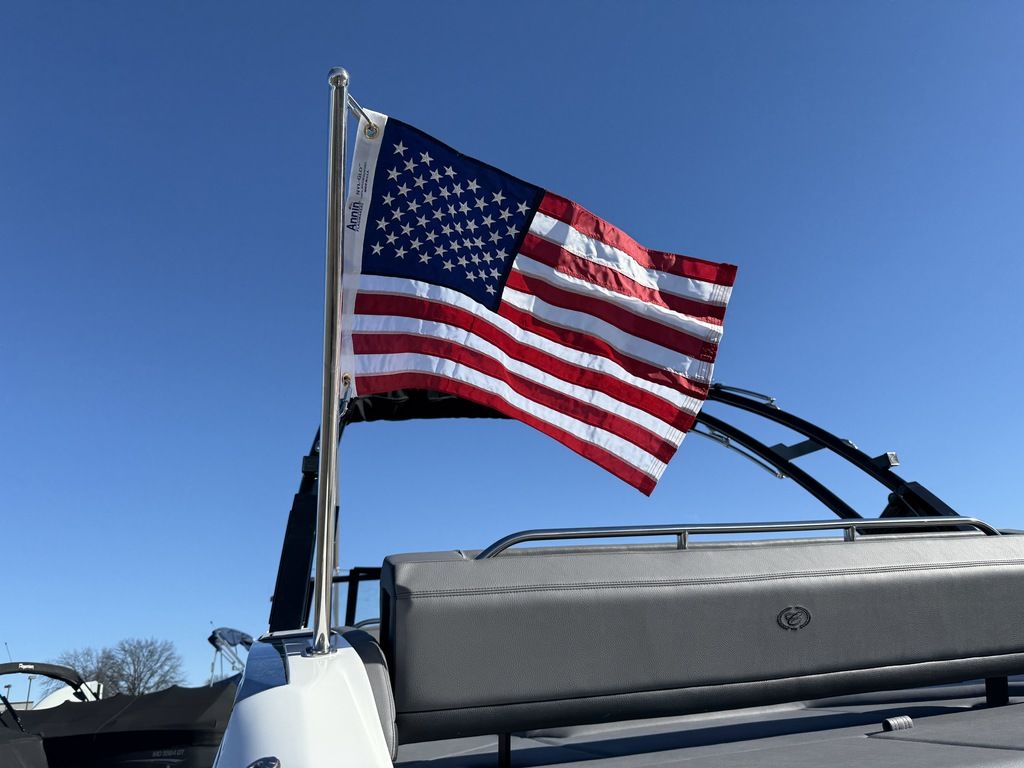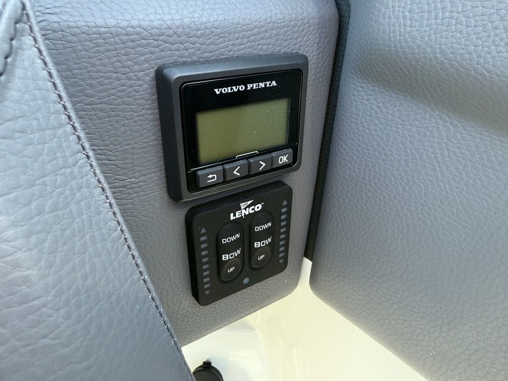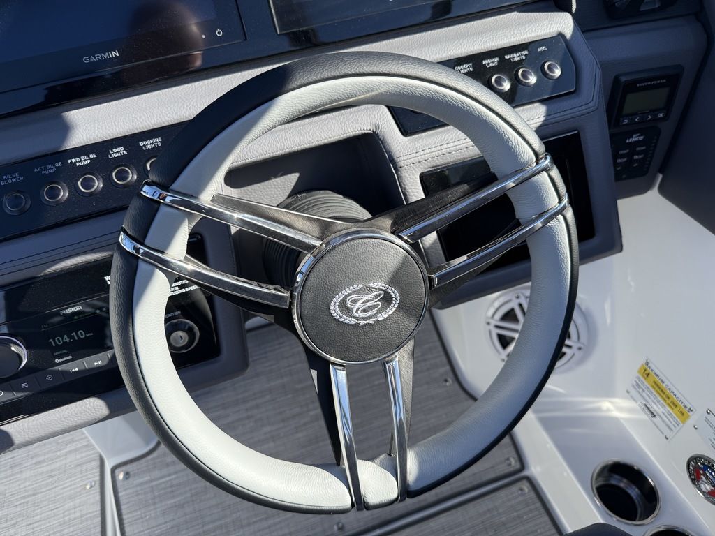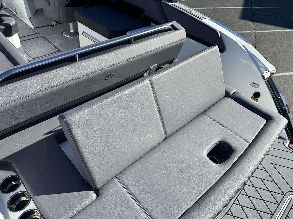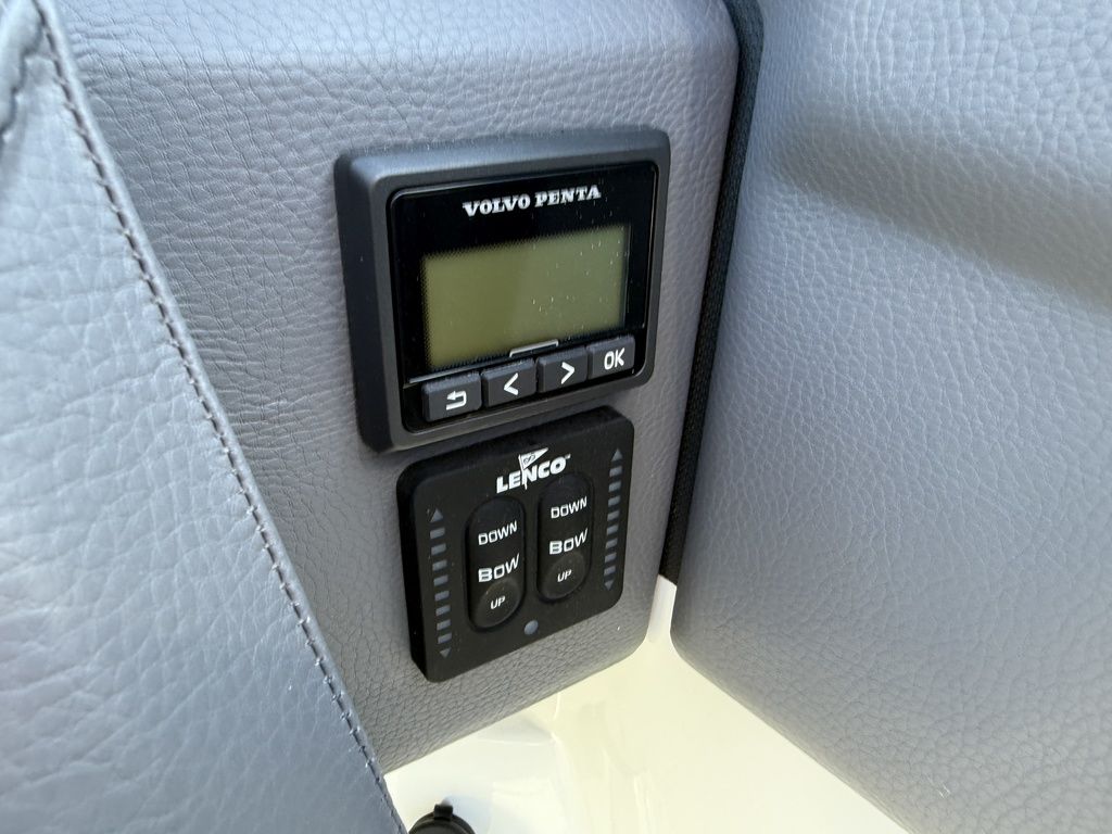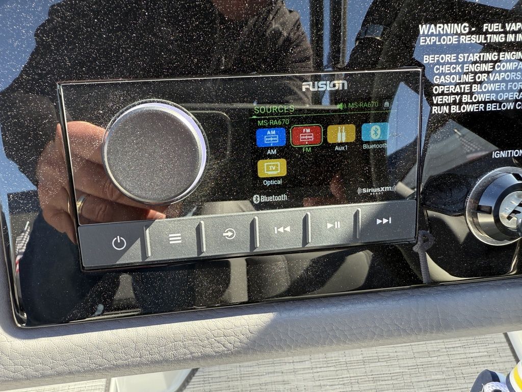 Upgraded Features Include: Full Mooring Cover, Arch w/Bimini, Three Color Graphics, Hull Bottom Color, Trim Tabs, Flagpole, Two Tone Steering Wheel, Dual Battery Charger, Wireless Cell Phone Charger (Helm), Sea Grass Flooring, Garmin 10" Screen Upgrade, Premium Sound Package w/Transom Speakers, Air Compressor, Sof-trac Mat Swim Platform, Sof-trac Gunnel Step Pads, Docking Lights, RGB LED Interior Lighting Package and Custom Tandem Axle Trailer.