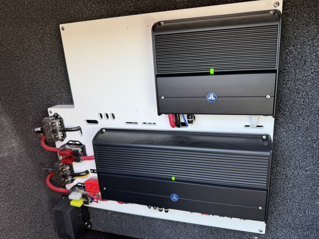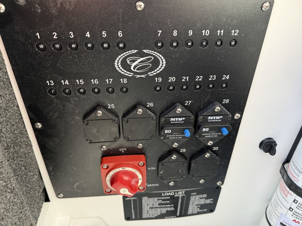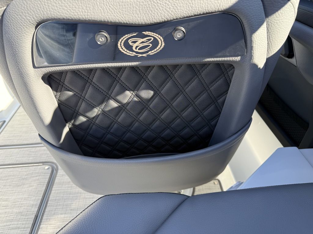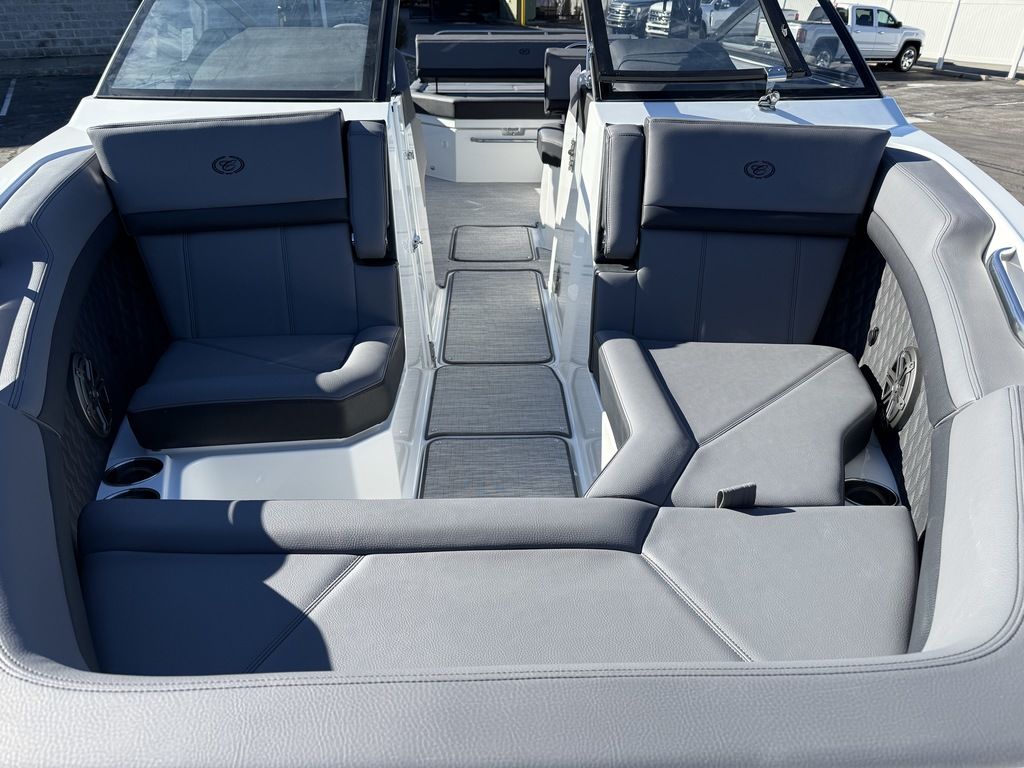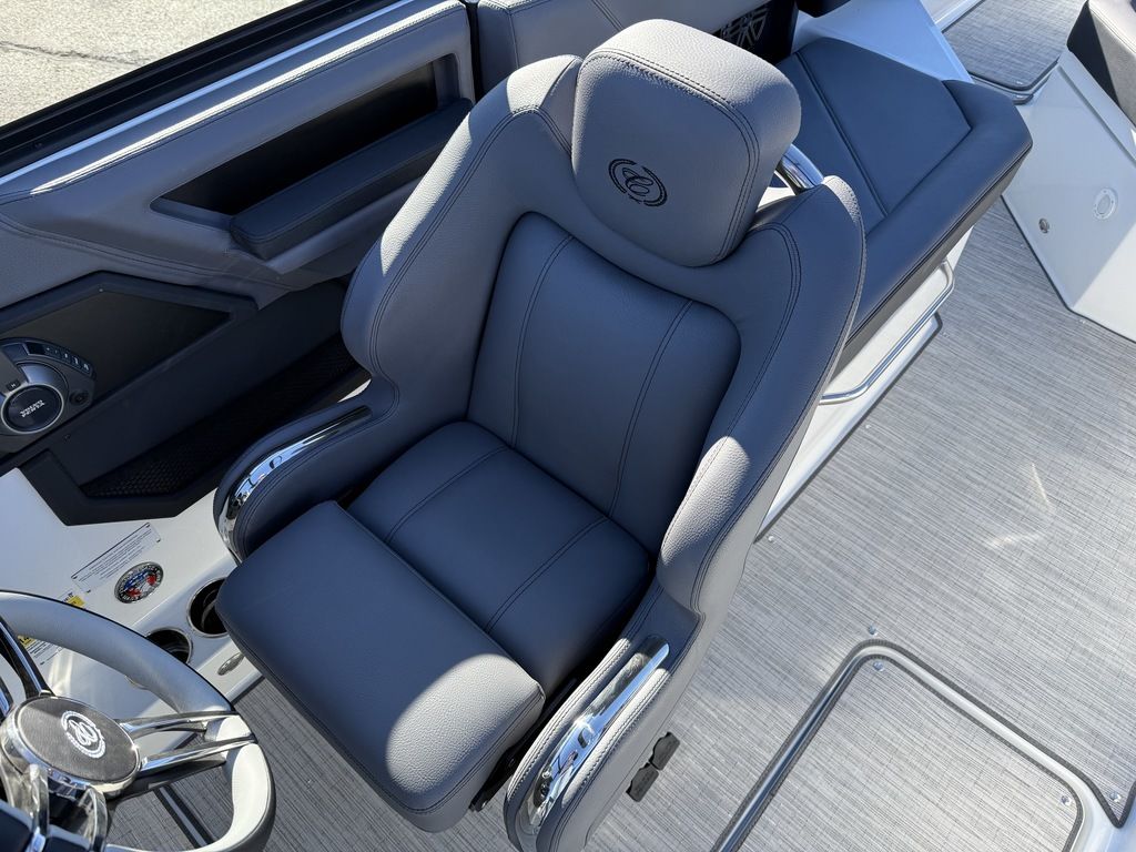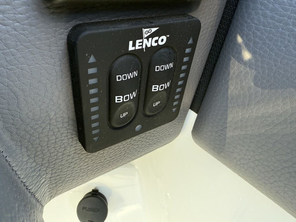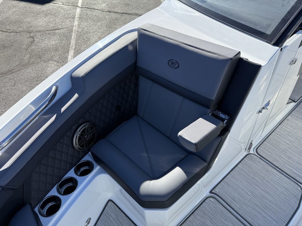 Upgraded Features Include: Full Mooring Cover, Arch w/Bimini, Three Color Graphics, Hull Bottom Color, Trim Tabs, Flagpole, Two Tone Steering Wheel, Dual Battery Charger, Wireless Cell Phone Charger (Helm), Sea Grass Flooring, Garmin 10" Screen Upgrade, Premium Sound Package w/Transom Speakers, Air Compressor, Sof-trac Mat Swim Platform, Sof-trac Gunnel Step Pads, Docking Lights, RGB LED Interior Lighting Package and Custom Tandem Axle Trailer.