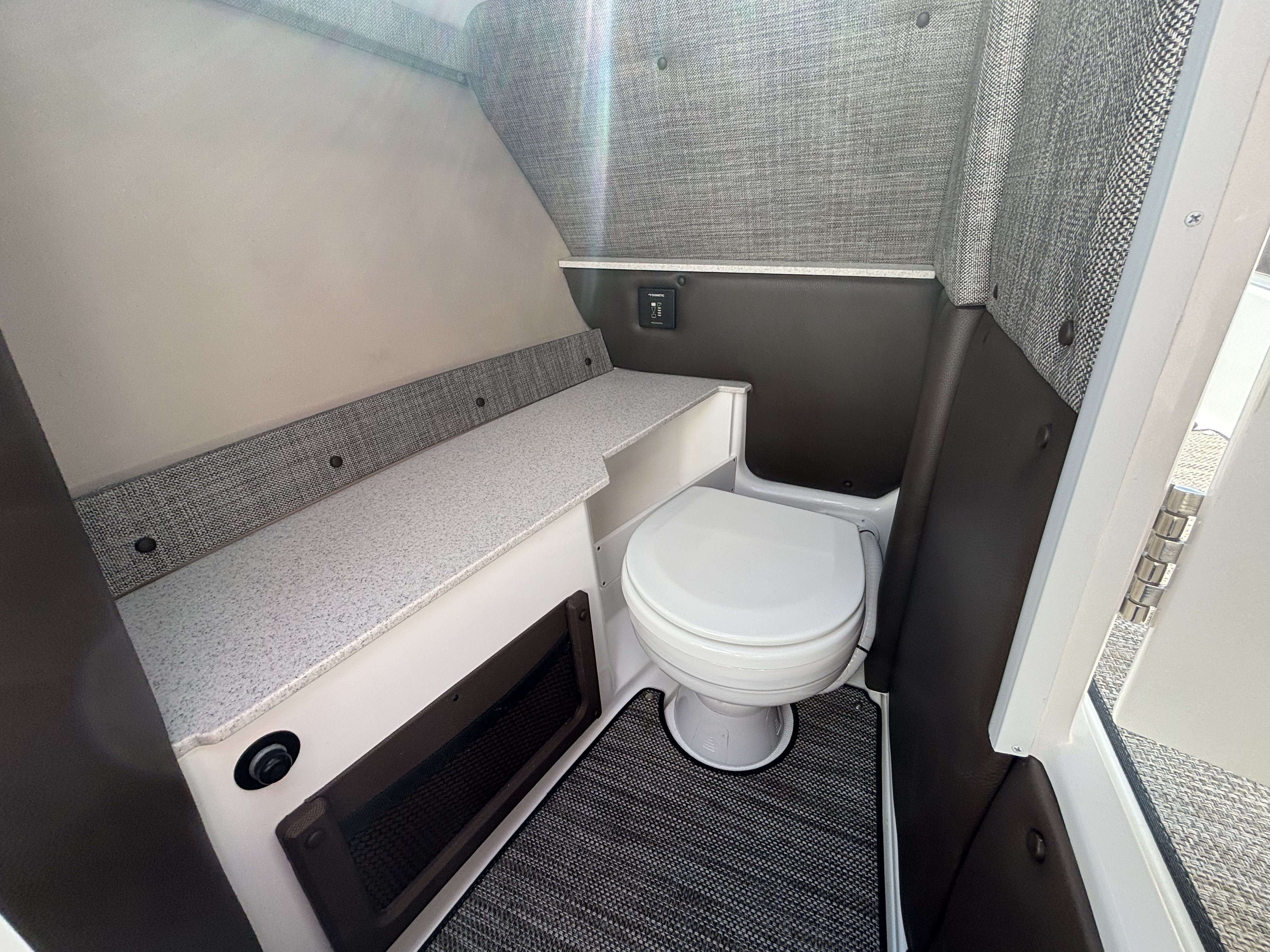 Other luxury features include a stainless steel docking light package, a flag with flagpole, an electric porcelain toilet for added comfort, and a dependable all-chain windlass anchor for effortless anchoring.