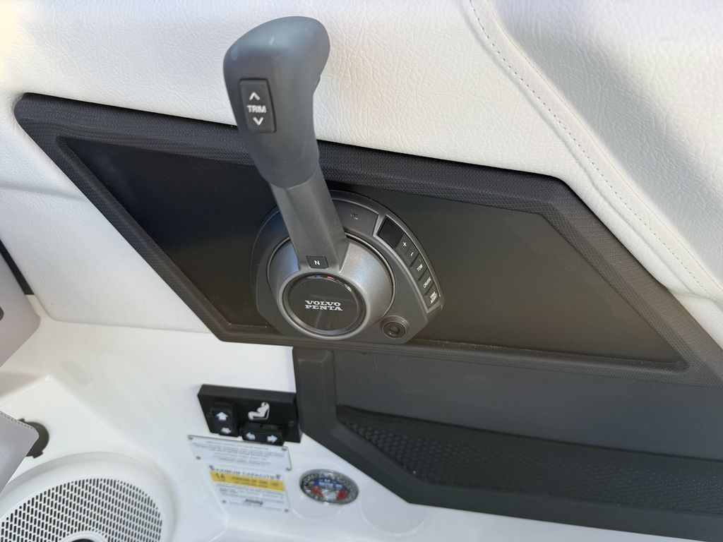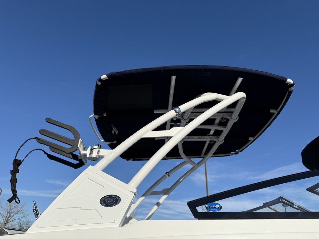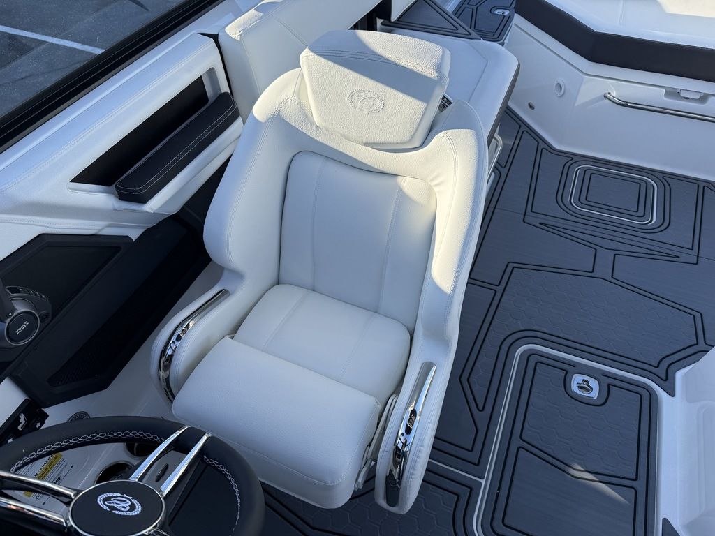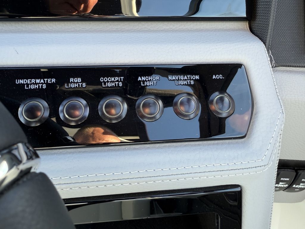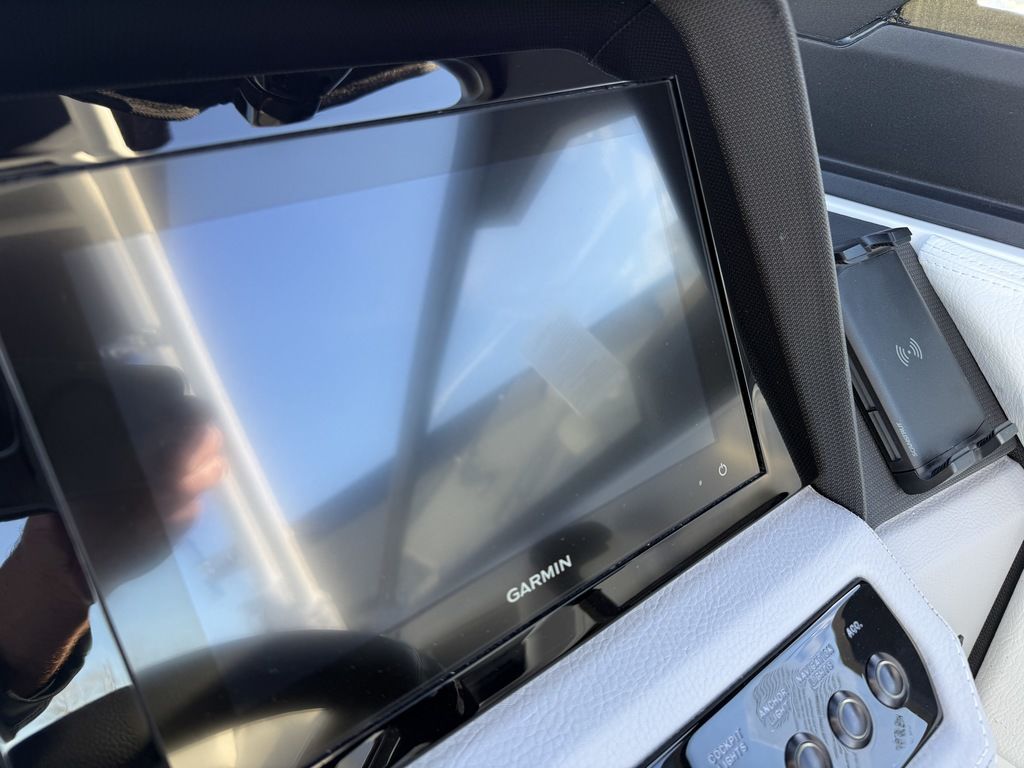 Upgraded Features Include: Full Mooring Cover, Arch w/Rotating Bimini, Trim Tabs, Flagpole, Sport Black Windshield, Dual Battery Charger, Wireless Cell Phone Charger (Helm), Sof-Trac Cockpit Flooring, Sof-Trac Gunwale, Garmin 10" Screen Upgrade, Harmon Kardon Sound Package w/Transom Speakers, Air Compressor, RGB LED Interior Lighting, Stainless Docking Lights, Electric Adjustable Helm Seat and Custom Tandem Axle Trailer.