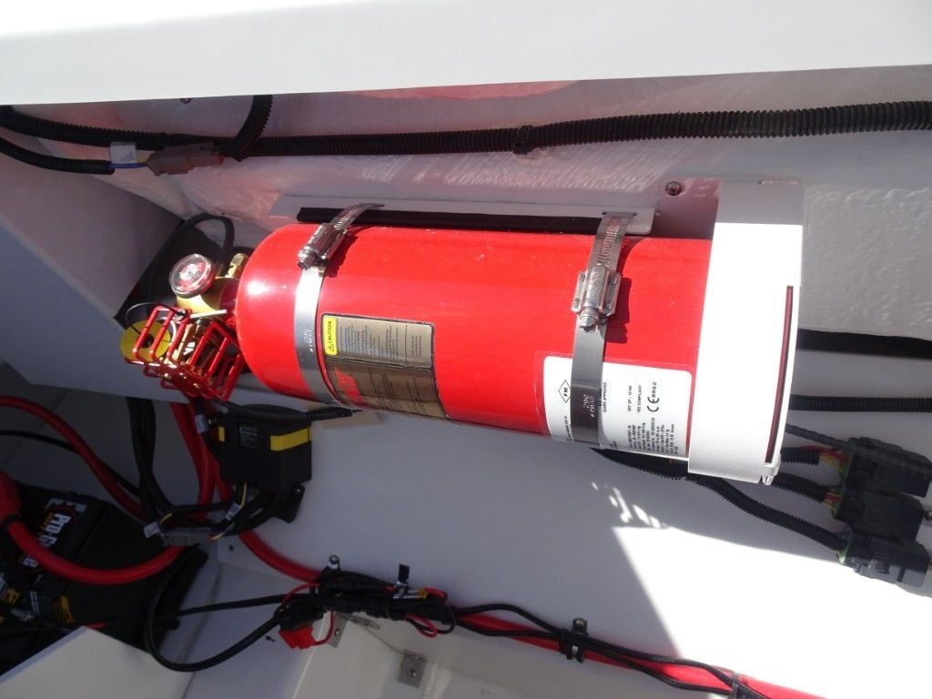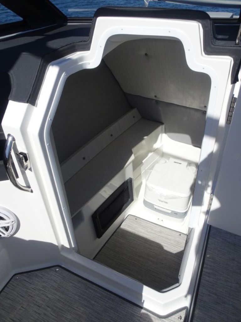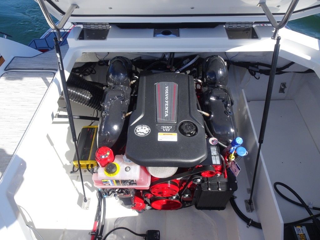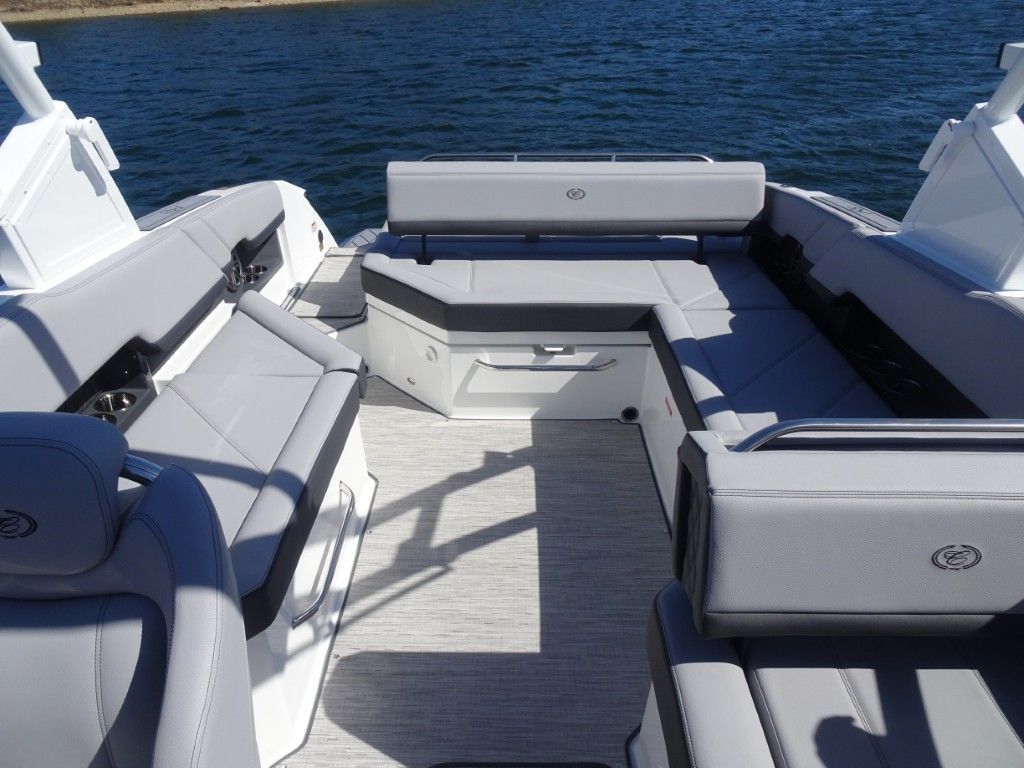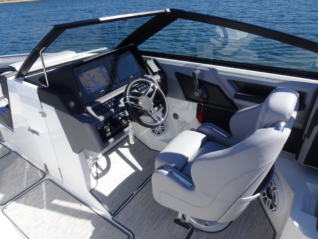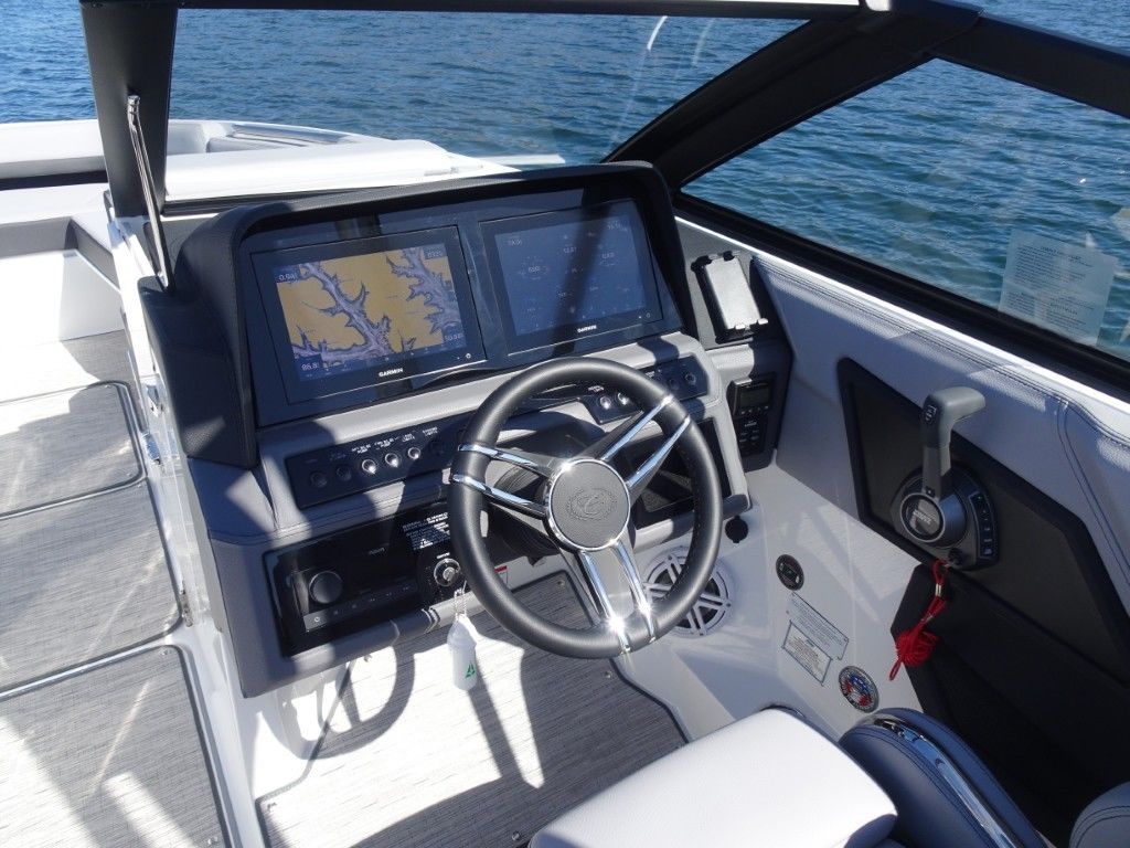 This is a new 2025 Cobalt R8 in 3-Color Custom Graphite Grey with K.O. Red Accent Stripe and Frost/Slate Interior. It is powered by a Volvo Penta 380hp EVC Dual Prop. It also has the following options: