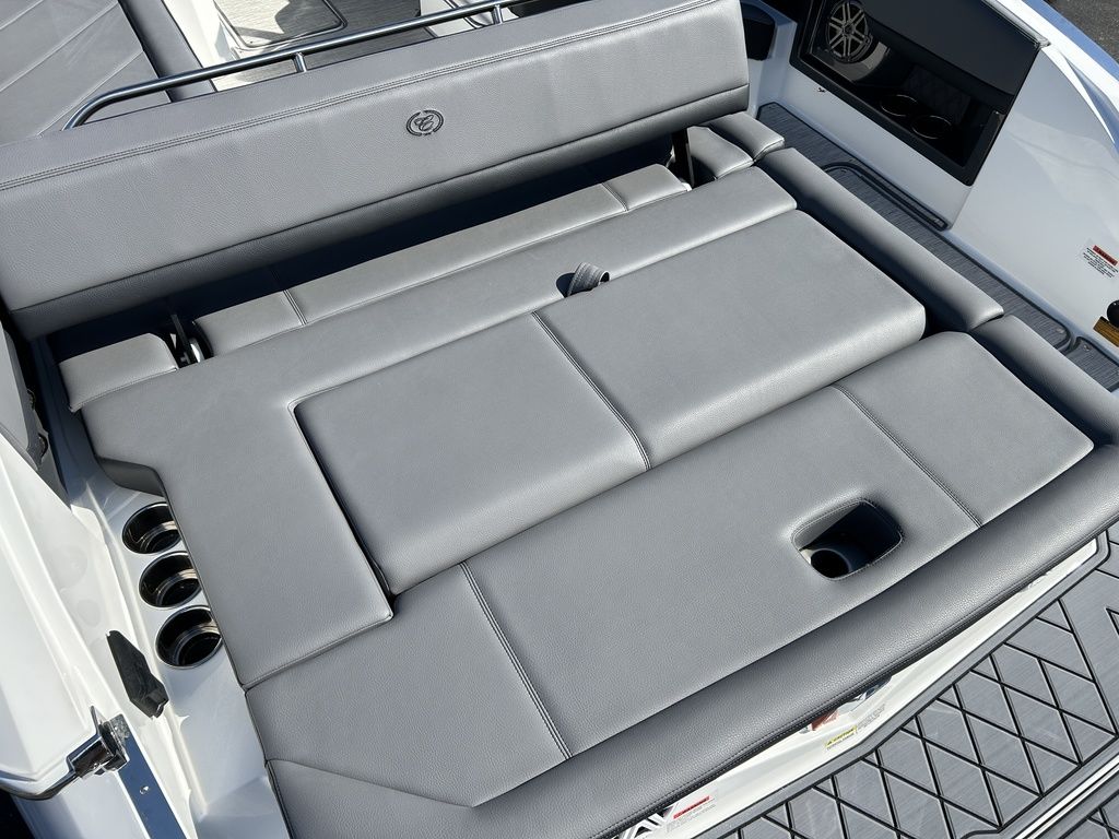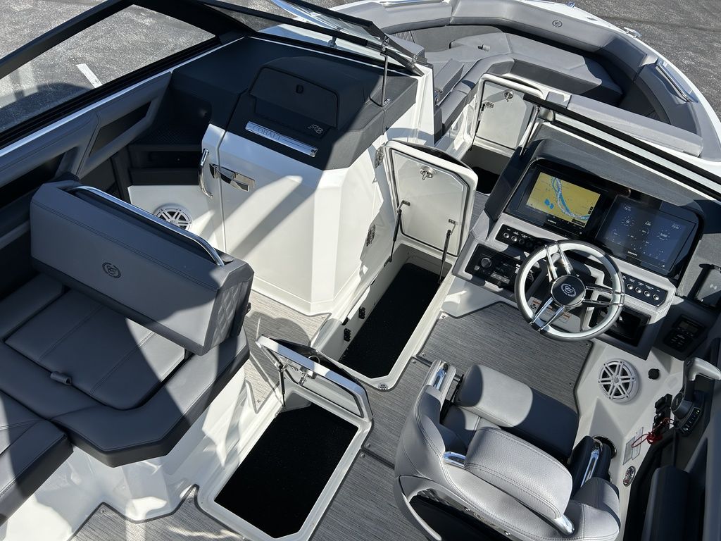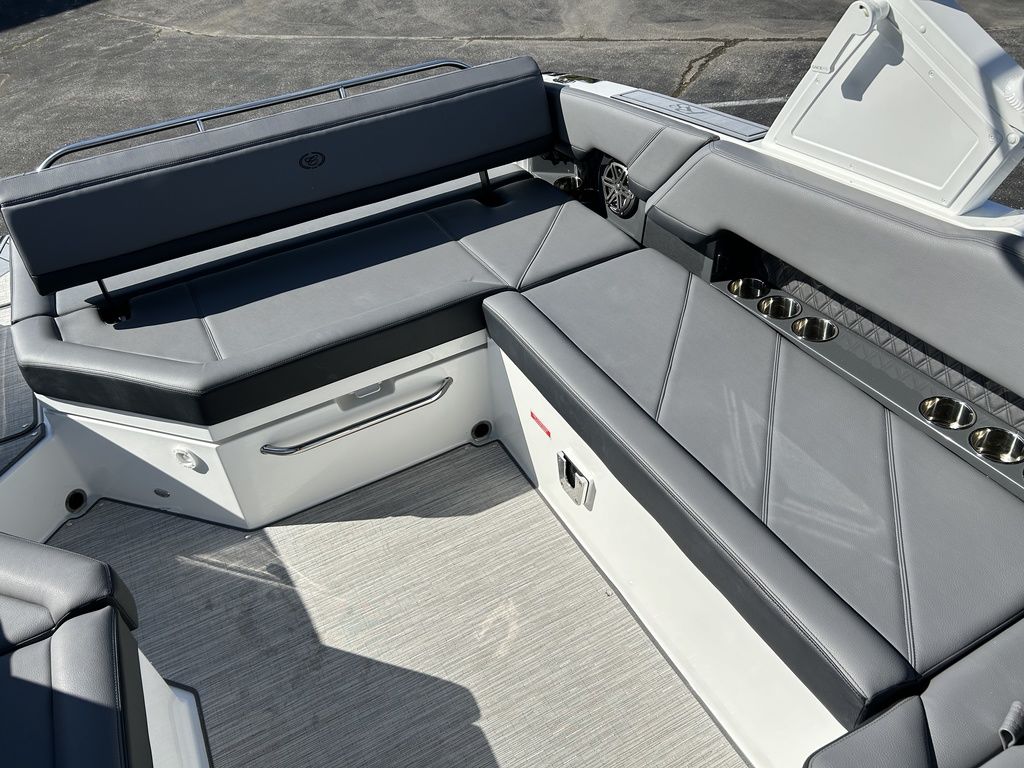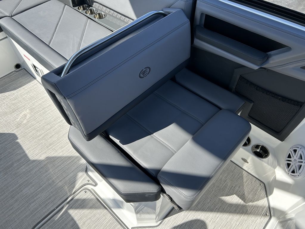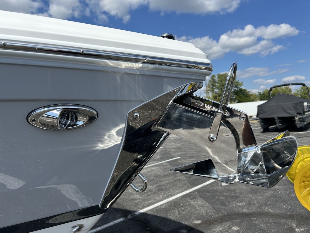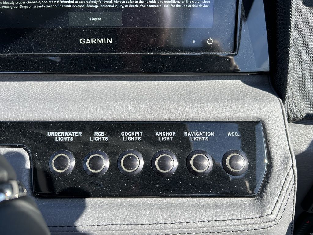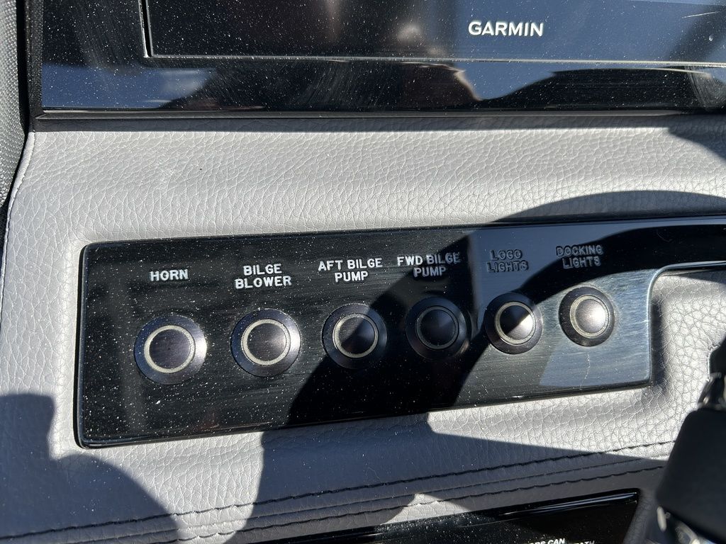 Full Mooring Cover, Folding Arch w/Rotating Sunshade, Dinette Table, Stainless Flagpole, Air Compressor, Dual Battery System, Stainless Docking Lights, Electric Adjustable Helm Seat, Seagrass Floor Covering, Dual 10" Garmin Glass Cockpit Screens, Two-Tone Leather Steering Wheel, RGB Interior LED Lighting, Premium Sound System w/Transom Speakers, Transom Radio Remote, Slate Interior w/Cool Touch Vinyl, Sof-Trac Swim Platform Mat, Sof-Trac Gunwale Mats, Trim Tabs, Windlass Anchor w/Chain, Helm Wireless Cell Phone Charger and Three Color Custom Hull Graphics
