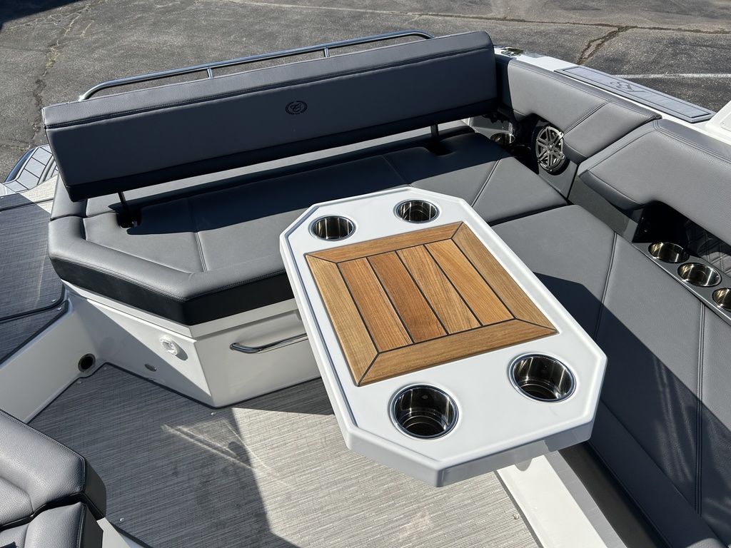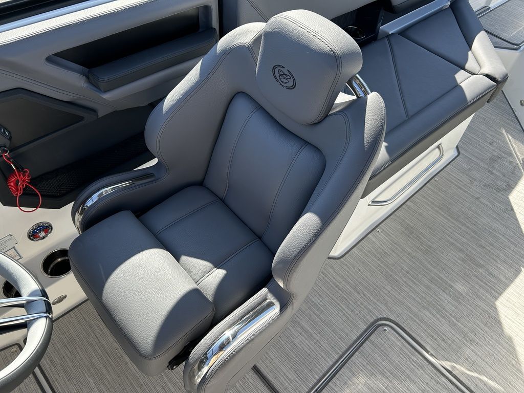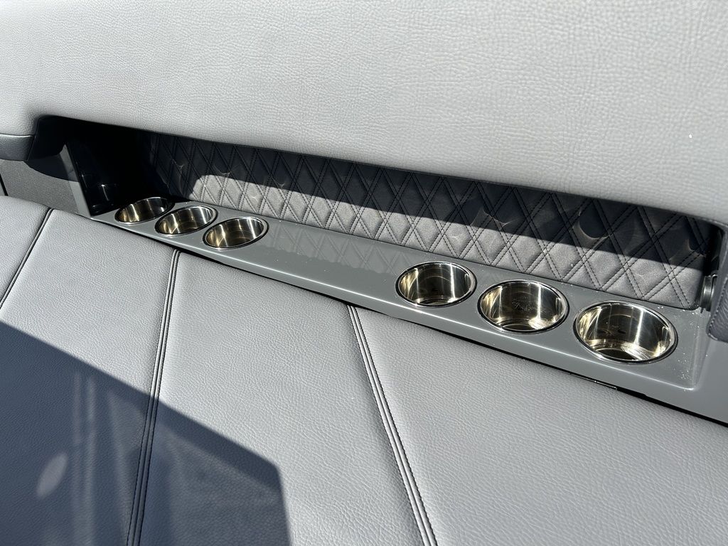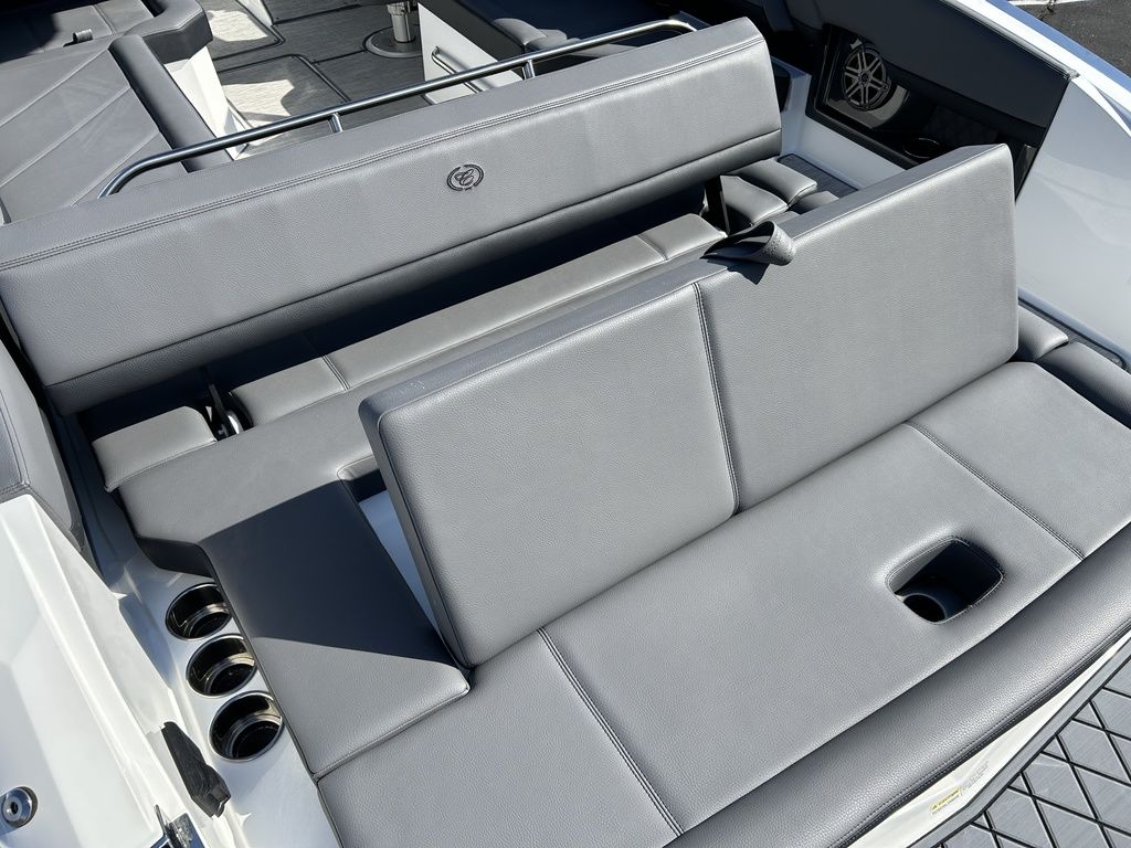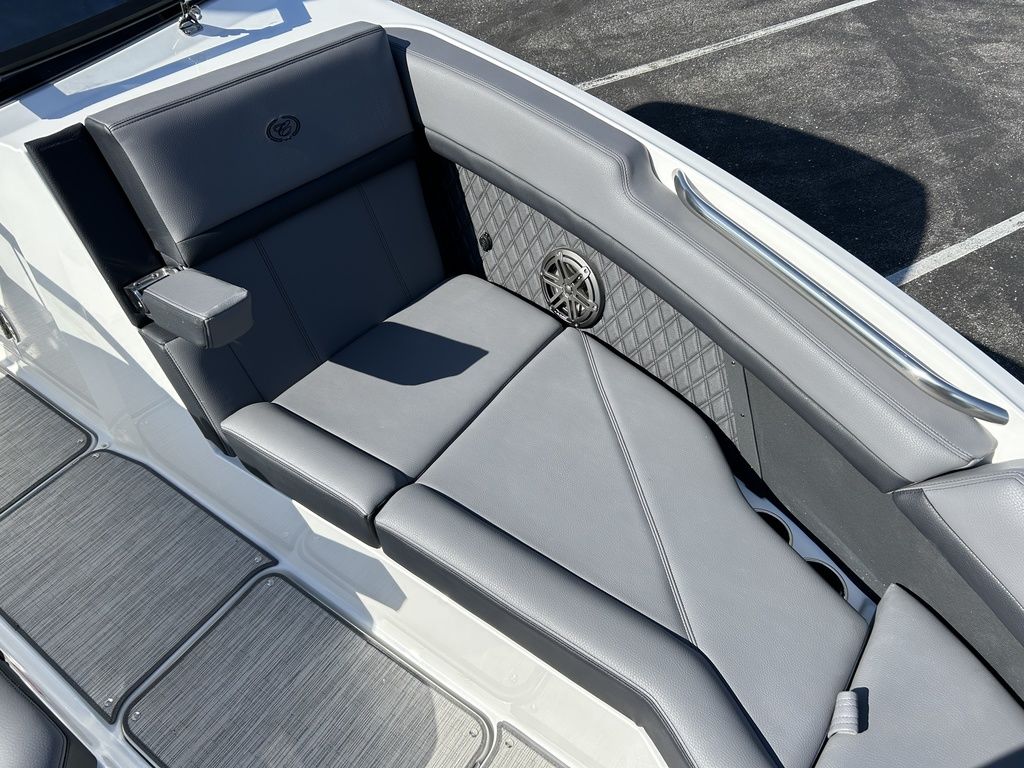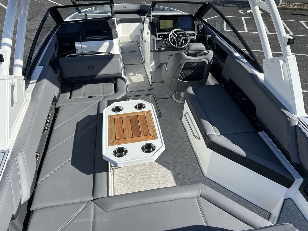 Full Mooring Cover, Folding Arch w/Rotating Sunshade, Dinette Table, Stainless Flagpole, Air Compressor, Dual Battery System, Stainless Docking Lights, Electric Adjustable Helm Seat, Seagrass Floor Covering, Dual 10" Garmin Glass Cockpit Screens, Two-Tone Leather Steering Wheel, RGB Interior LED Lighting, Premium Sound System w/Transom Speakers, Transom Radio Remote, Slate Interior w/Cool Touch Vinyl, Sof-Trac Swim Platform Mat, Sof-Trac Gunwale Mats, Trim Tabs, Windlass Anchor w/Chain, Helm Wireless Cell Phone Charger and Three Color Custom Hull Graphics