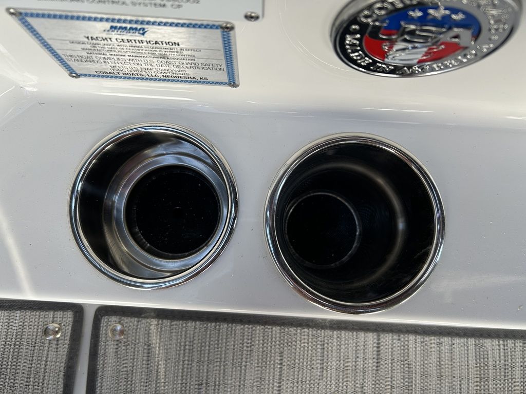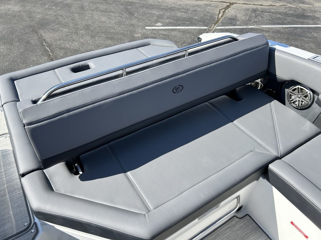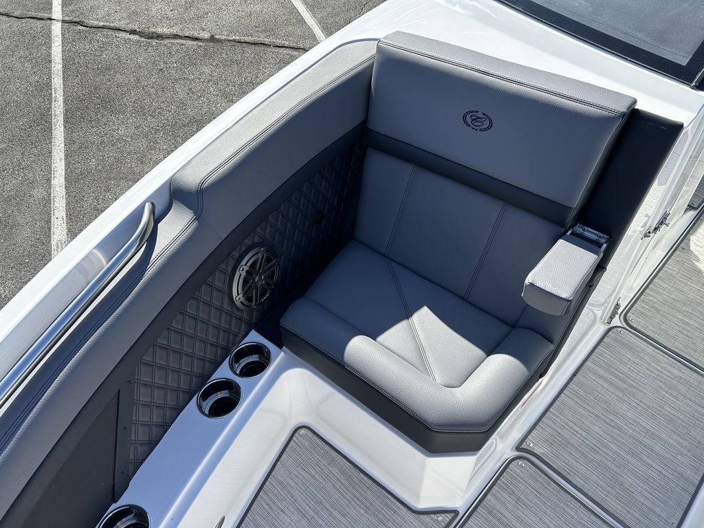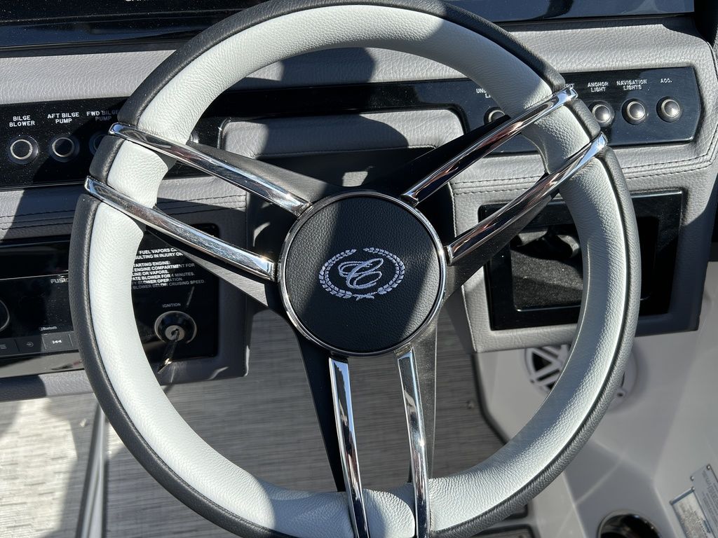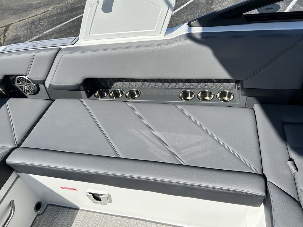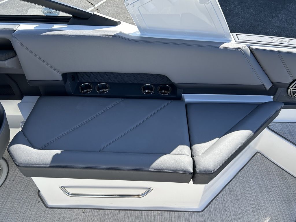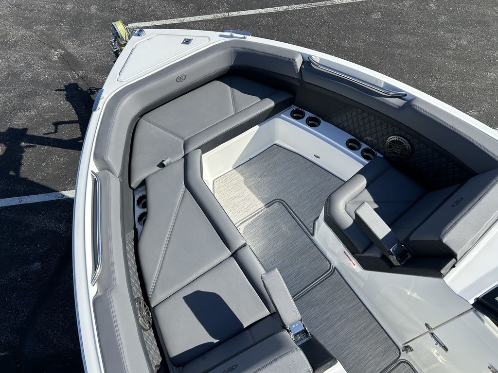 Full Mooring Cover, Folding Arch w/Rotating Sunshade, Dinette Table, Stainless Flagpole, Air Compressor, Dual Battery System, Stainless Docking Lights, Electric Adjustable Helm Seat, Seagrass Floor Covering, Dual 10" Garmin Glass Cockpit Screens, Two-Tone Leather Steering Wheel, RGB Interior LED Lighting, Premium Sound System w/Transom Speakers, Transom Radio Remote, Slate Interior w/Cool Touch Vinyl, Sof-Trac Swim Platform Mat, Sof-Trac Gunwale Mats, Trim Tabs, Windlass Anchor w/Chain, Helm Wireless Cell Phone Charger and Three Color Custom Hull Graphics