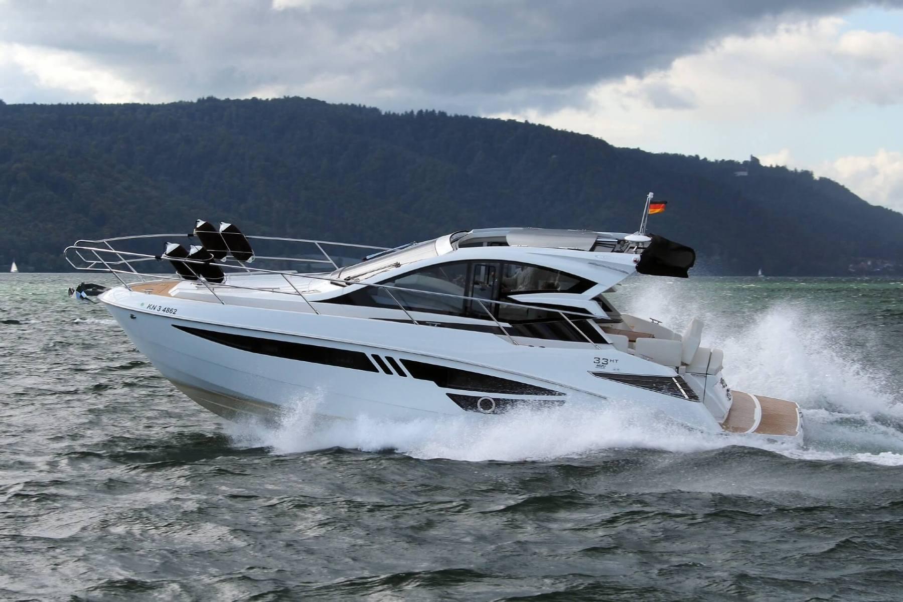 Hull 32 ft 1 in • Beam 10 ft 5 in • Draft 0.6–1 m • Dry weight from 5.5 t • Fuel 650 L • Water 200 L • Range 1 118 nmi (372 nmi at cruise) • Top speed 48 mph • Passengers 8–10 • Sleeps 4–5 • Advanced infusion hull for light weight and buoyancy • Hard-top silhouette with “fang” air intakes and panoramic windows • Option soft-top roof • Sport control panel