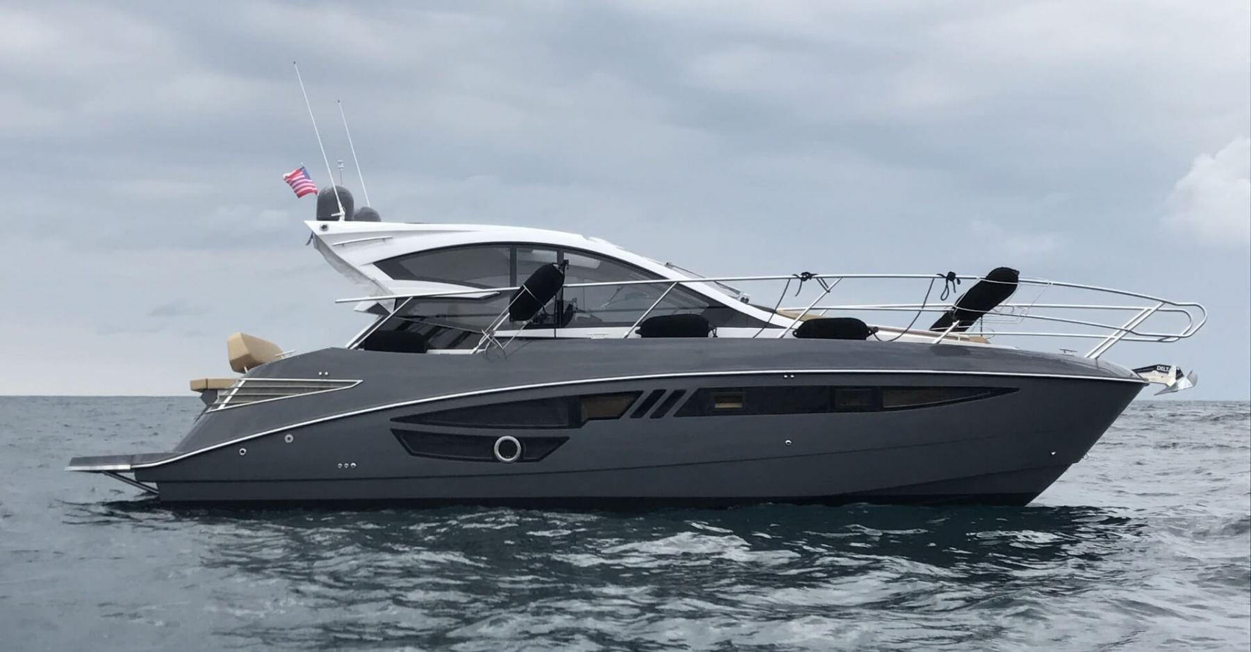 Cobrey’s 33 HT pairs a sporty profile with real yacht comfort. You’ll recognize it by the sharp “fang” vents in the hard-top and the sleek window line. Twin 220 hp drives or IPS options deliver a 48 mph sprint and a 1 118 nmi range.