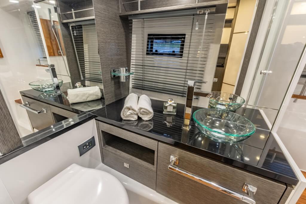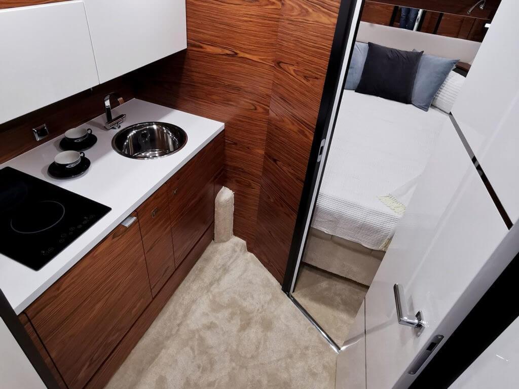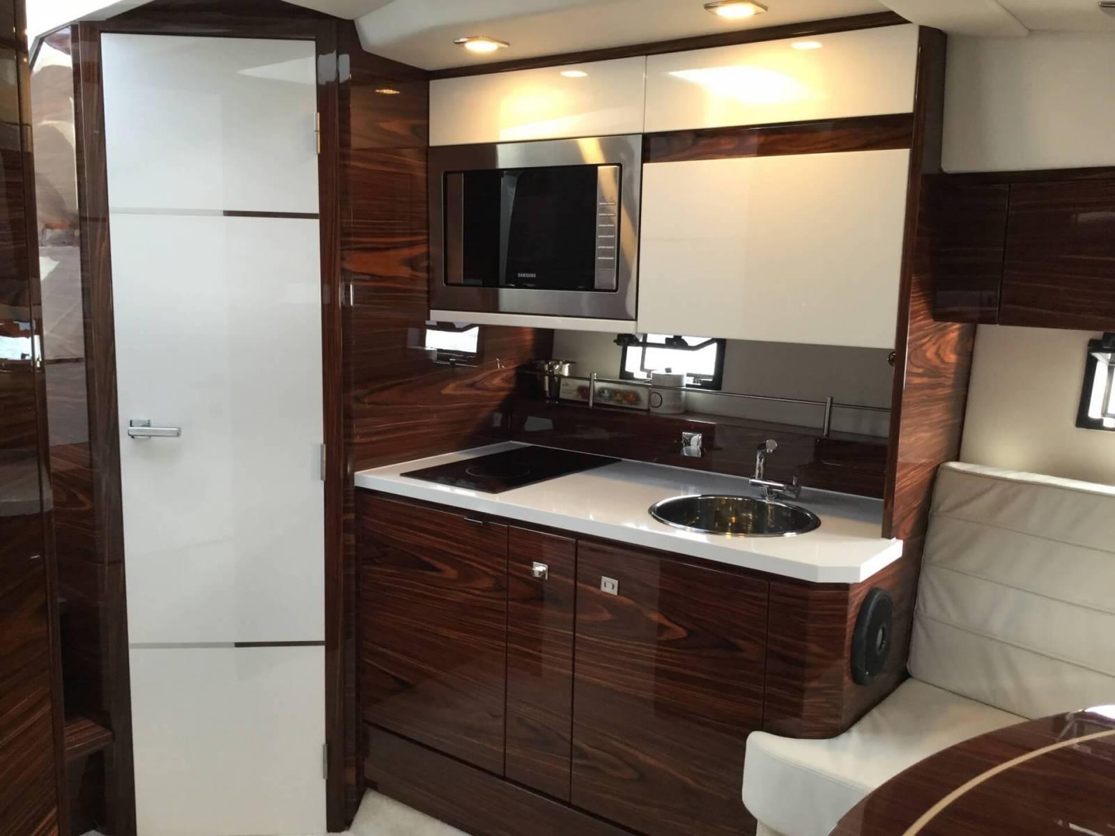 Below, you choose the layout to suit your needs. A bow berth includes a dedicated kitchenette, and a full master stateroom and separate shower head turn the lower deck into a true living space. LED lighting and premium materials shine in every corner.