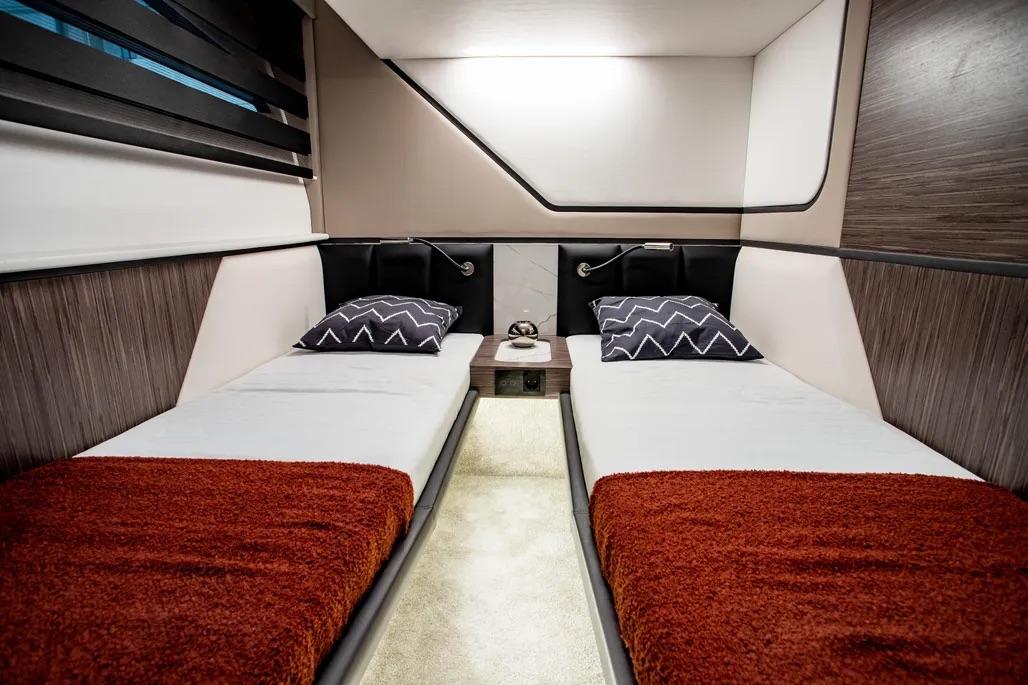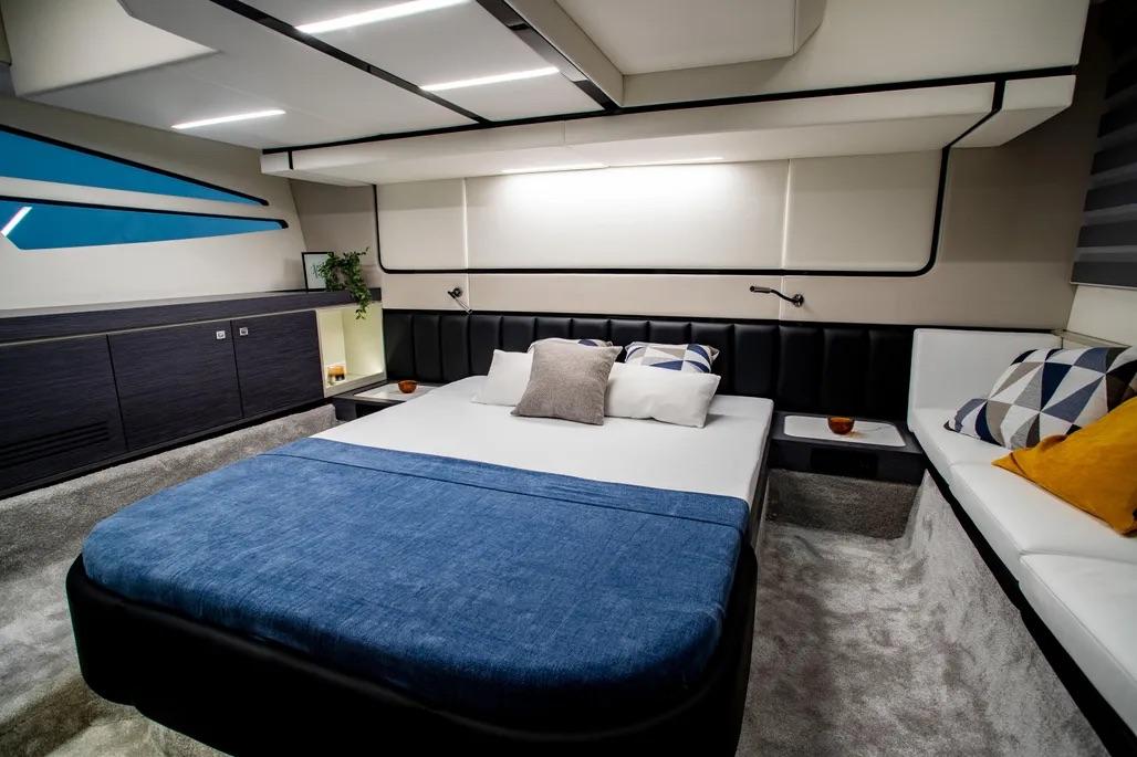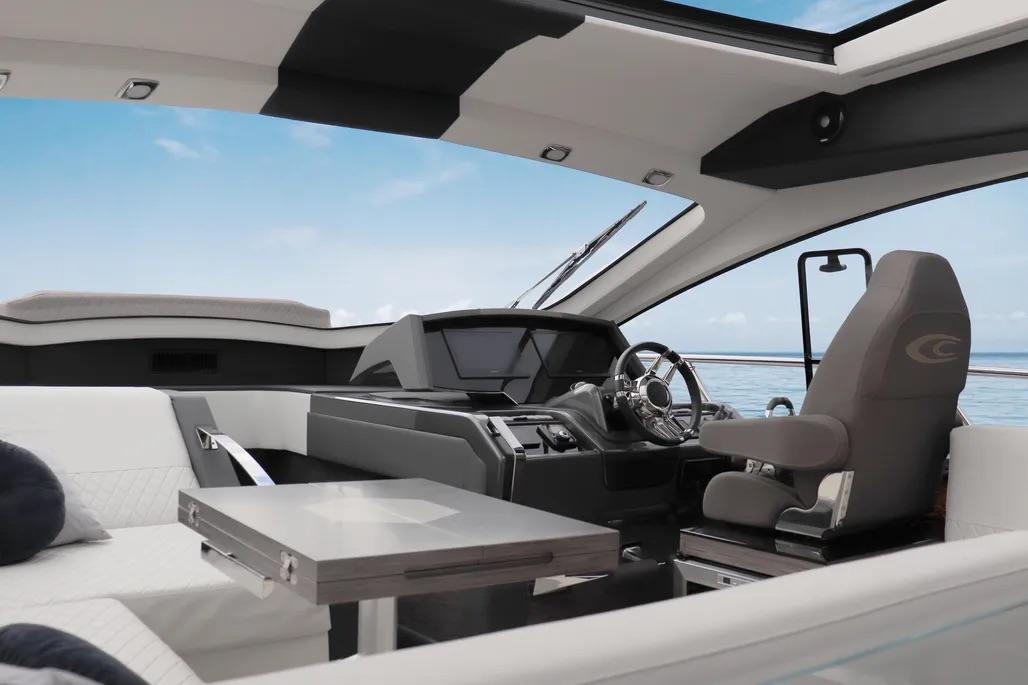 Cobrey’s 45 Fly pairs precision engineering with luxury finishes. Twin D6 drives launch you to hull speed, 35 kn, while joystick and trim tabs hold your line through chop. The hydraulic platform and gangway let you step right onto the water. At the helm, dual 12″ chartplotters, autopilot, and radar keep you focused on the horizon.