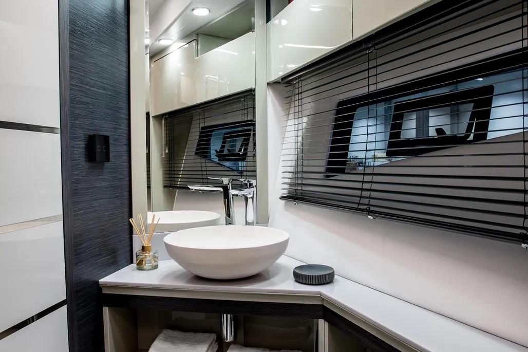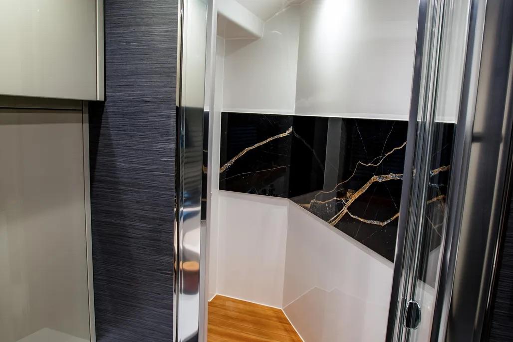 Below, high-gloss furniture and wooden floors frame three cabins (configurable) for six to sleep. You’ll run the galley appliances—dishwasher, microwave, fridge, off the 15 kVA generator or shore power. Leather upholstery, teak underfoot and Bose/Fusion sound set the tone for every passage.