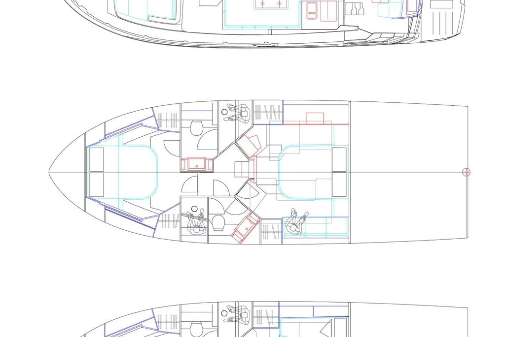 Beam 13 ft 9 in · Draft 2 ft 4 in / 3 ft 11 in · Dry weight 26 455 lb · Fuel 277 gal · Water 106 gal · Range 216 nmi · Modified-V hull · Hydraulic swim platform & gangway · Trim tabs · Bow & stern thrusters · 15 kVA diesel generator · A/C · flybridge fridge & cockpit icemaker · dishwasher, microwave & washing machine · cockpit grill · teak decks (half-decks & flybridge) · leather upholstery · wooden salon floor · high-gloss joinery · underwater lights & spotlight · antifouling