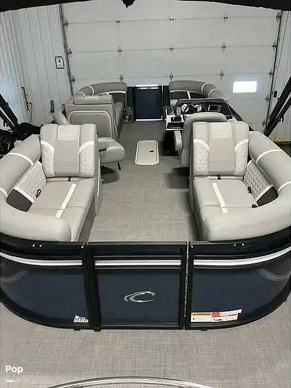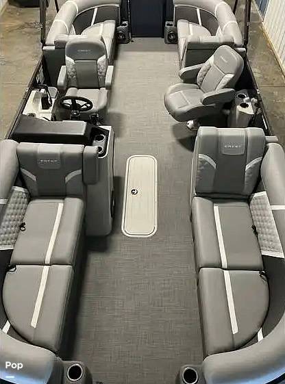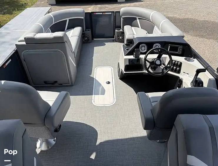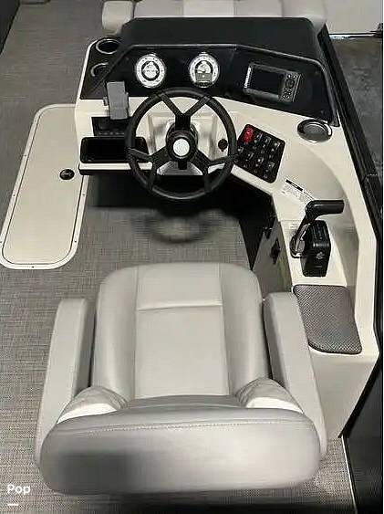 This isn't just a boat; it's a high-tech floating lounge featuring a completely redesigned fiberglass helm with a wireless phone charger, a cooled cup holder to keep your drink frosty, and an intuitive Lowrance Eagle 5 display right at your fingertips.