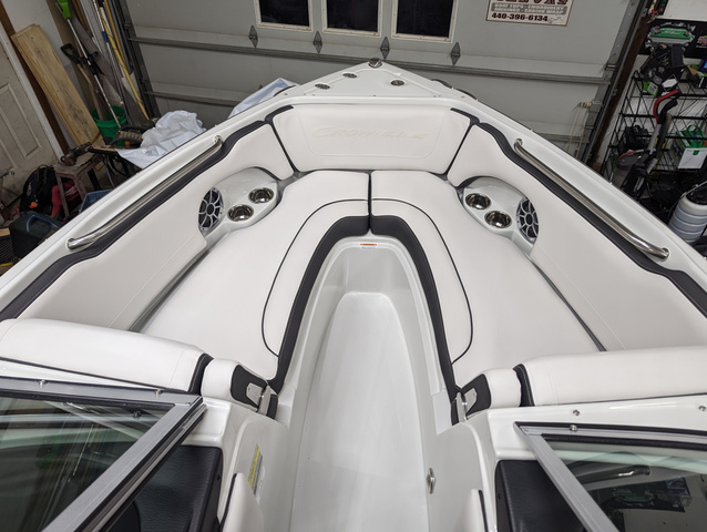 A beautiful Crownline 210SS with 250 Mercruiser, includes color matched trailer. The boat has a sporty silhouette and features a walk-through transom with filler cushion to create a full-length sun bed area for relaxing and catching some rays. Theres comfortable seating throughout this model including driver and passenger bucket seats with flip-up bolsters, rear bench seat with hidden storage,16-degree lean backs, pillowtop cushioning, and flip-up armrests. Excellent fit and finish must see. Industry leading warranties. Extensive video walkthrough of very similar model available online on Vermilion Marina's Youtube channel.