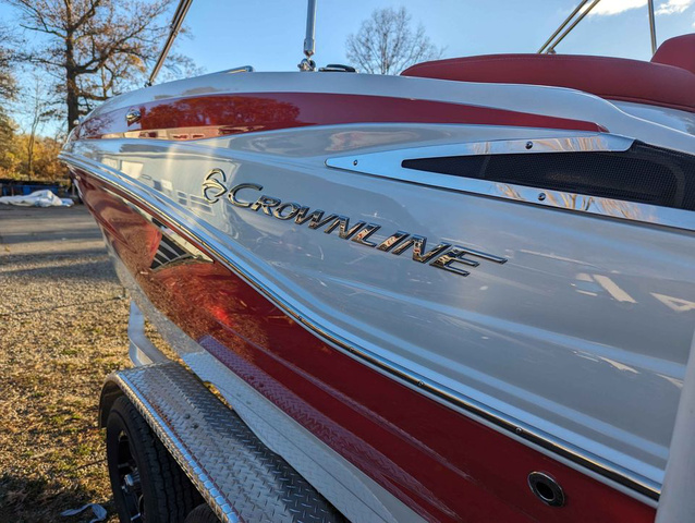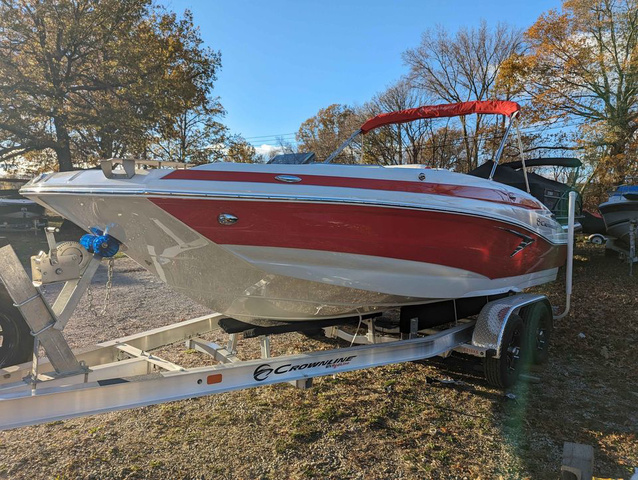 2025 not able to list our sales price on new model year call or message for price. Another gorgeous boat from Crownline. Decades of refinement has given this boat its beautiful hull lines and high efficiency. This boat can do it all. Snap-in teak look soft touch flooring can be easily removed for fishing outings and placed back down for pleasure cruises. Crownlines are built in the American Midwest with the highest standard of craftsmanship. The design team at Crownline is renown for their seamlessly integrated interior & exterior color schemes. There is a long list of Crownline standard features: Innovative use of space provides a bathroom with a drop down privacy curtain. Two swivel seats and 4 bases to choose from at bow and stern. A cooler and a table with 2 table mount locations. Set up for easy trolling motor installation. Garmin GPS & fishfinder on piano black dash. Hull mounted removable ski tow bar for peace of mind. Bow filler cushions to make a large sunpad in the front. Wet sounds audio speaker system with Bluetooth digital interface. Stainless steel, high capacity 4 rung ladders on bow and stern - neatly folding under teak panel. A capacity of 10 means your family and friends can join you on the water. Come visit us in Vermilion, Ohio to see it for yourself and set up a test drive!(weather permitting). We're a family outfit and will get you the best deal available anywhere!