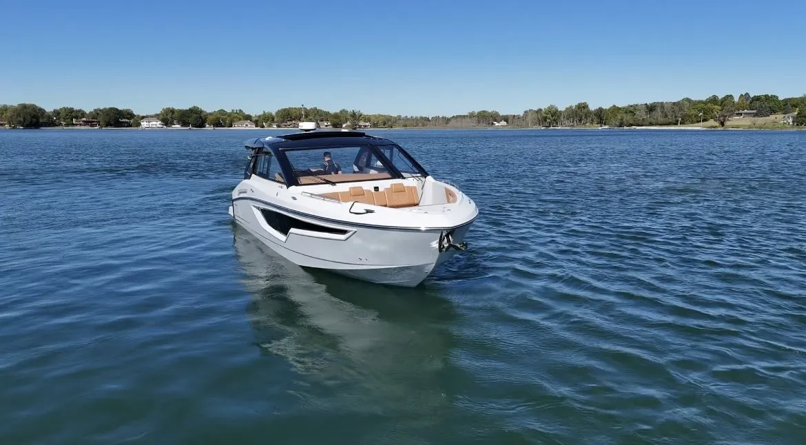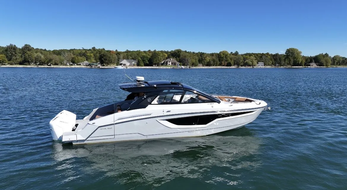 Seize this exclusive opportunity! If adventure is your main goal when it comes to boating, then look no further than the fast, stylish and fun 42 GLS Outboard. She has the space you need, the speed you crave and all the amenities to create the comforts you have become accustom. The spacious cockpit has dinette seating and swivel bar stools. The galley offers a sink, fridge and plenty of storage. Beach doors open to expand your swimming area and create endless family fun. The helm features Simrad electronics and charging for all your mobile devices. All powered by triple Mercury Verados with joystick controls.