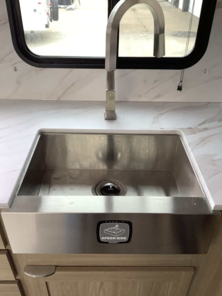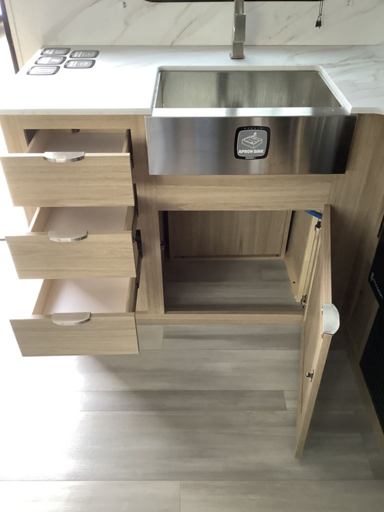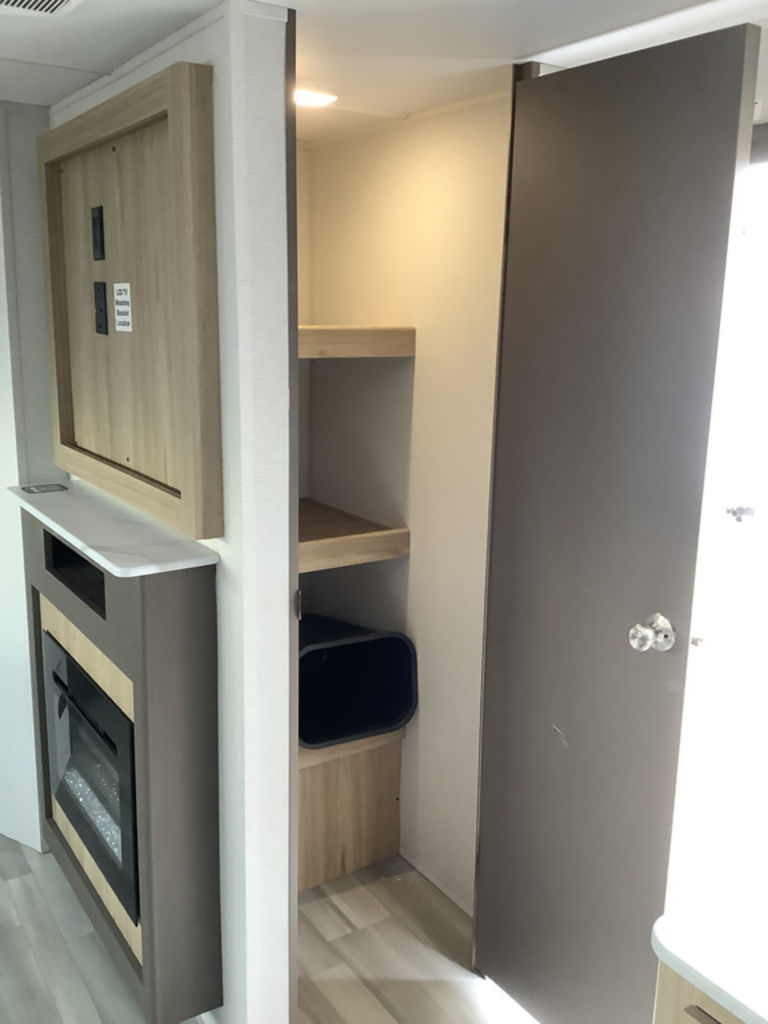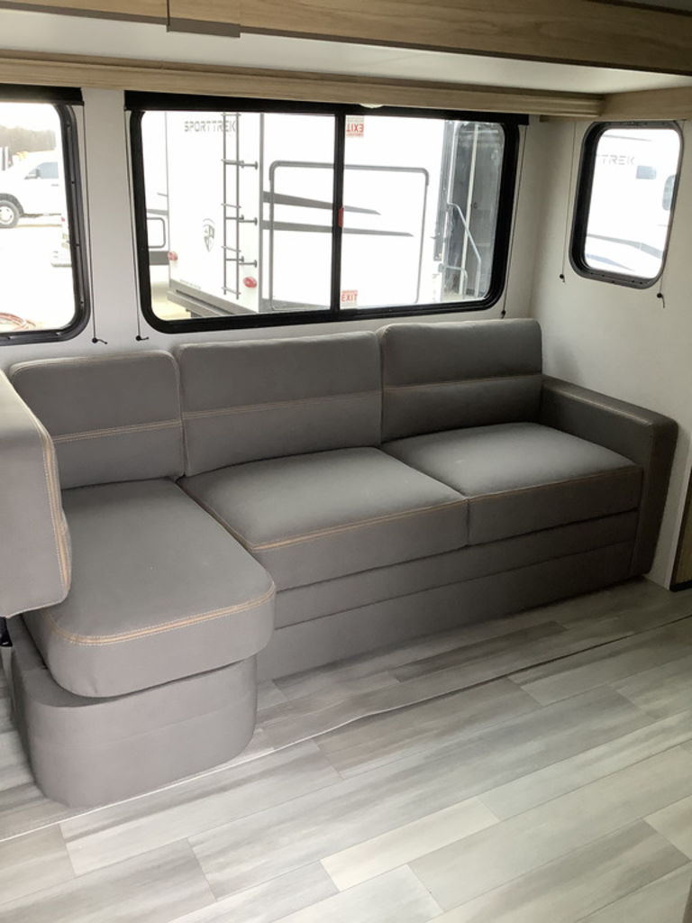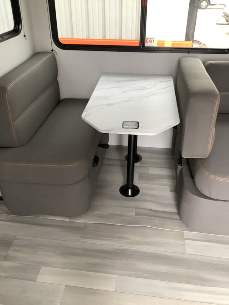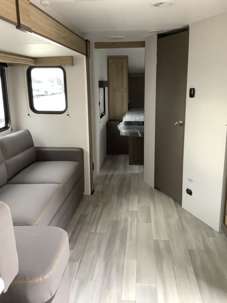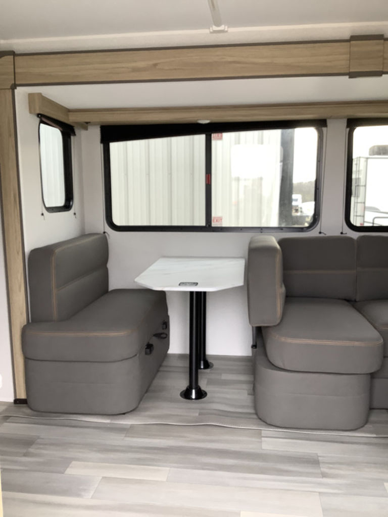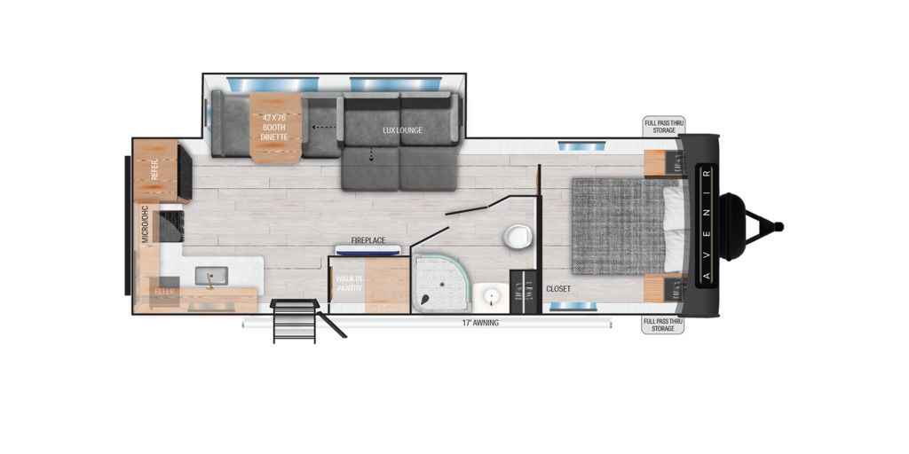 Inside, the Avenir series features a bright, open living area with comfortable seating, an efficient kitchen layout, and plenty of storage throughout. The rear kitchen design gives you extra counter space and room to cook while maintaining a comfortable lounge area for relaxing after a day outdoors.